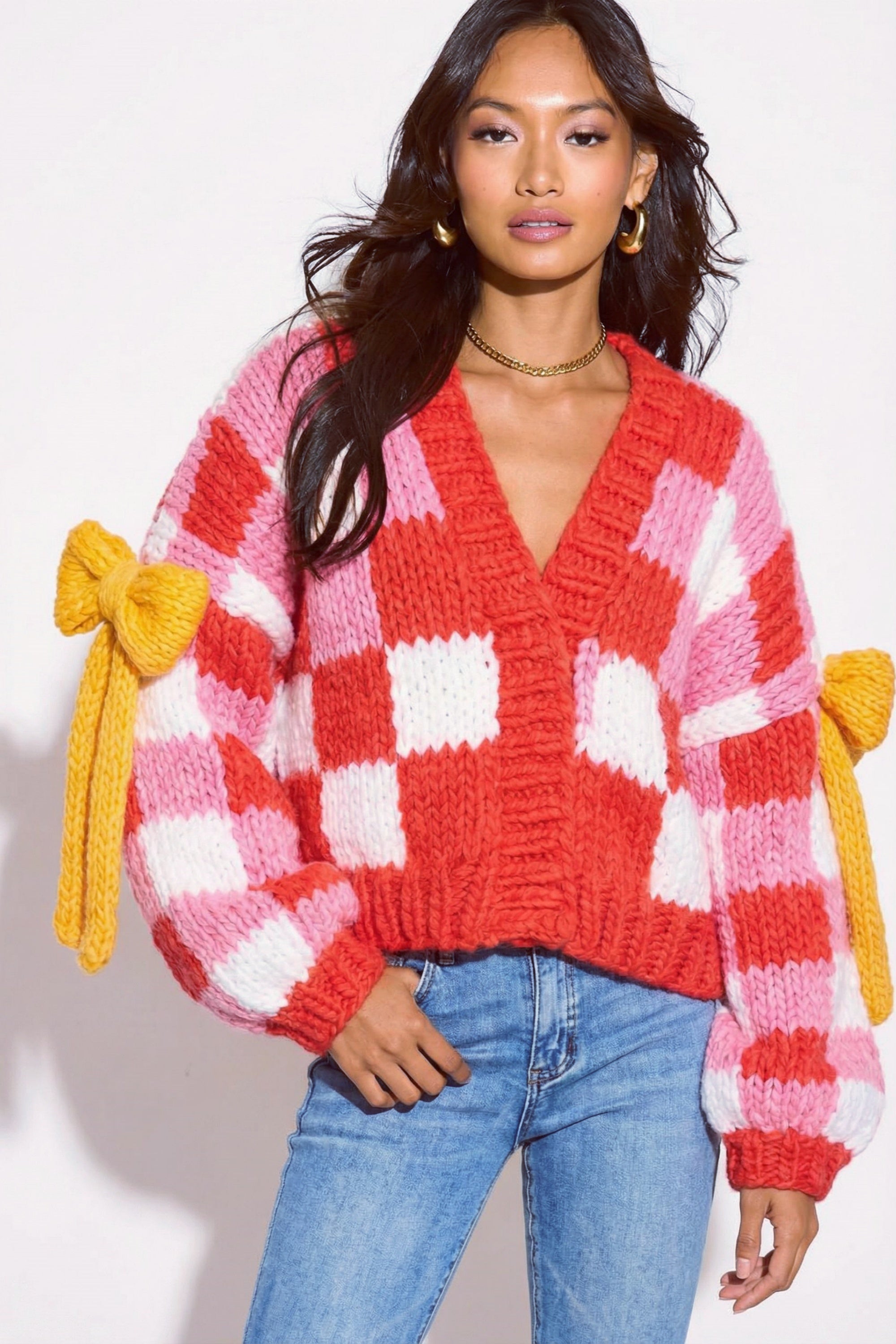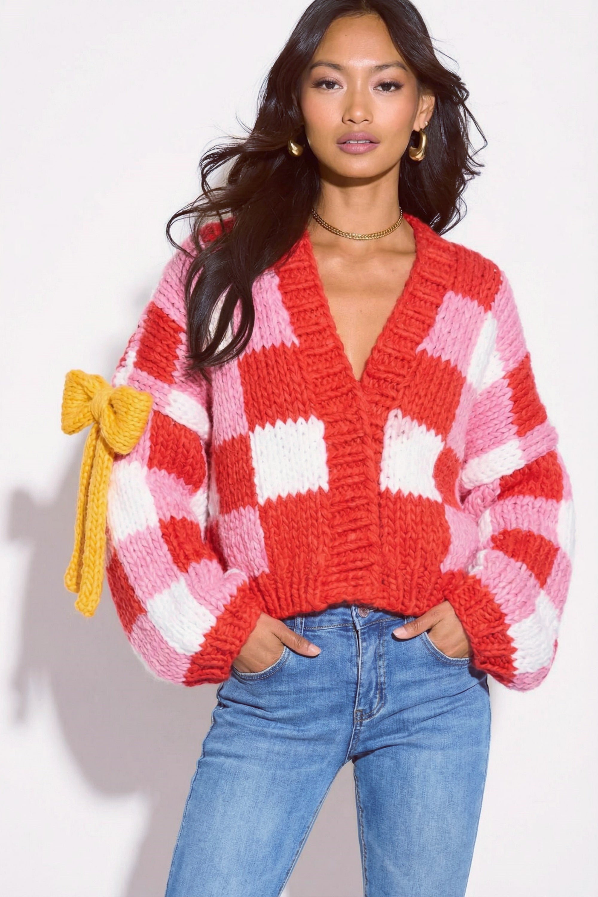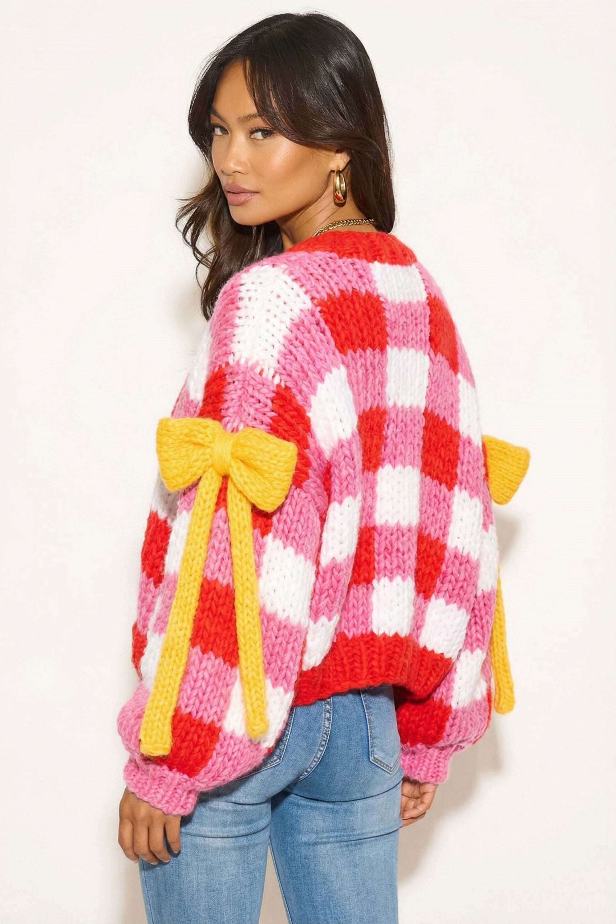 Red White Checked Print Pattern with Big Bow design Hand Knit Cardigan