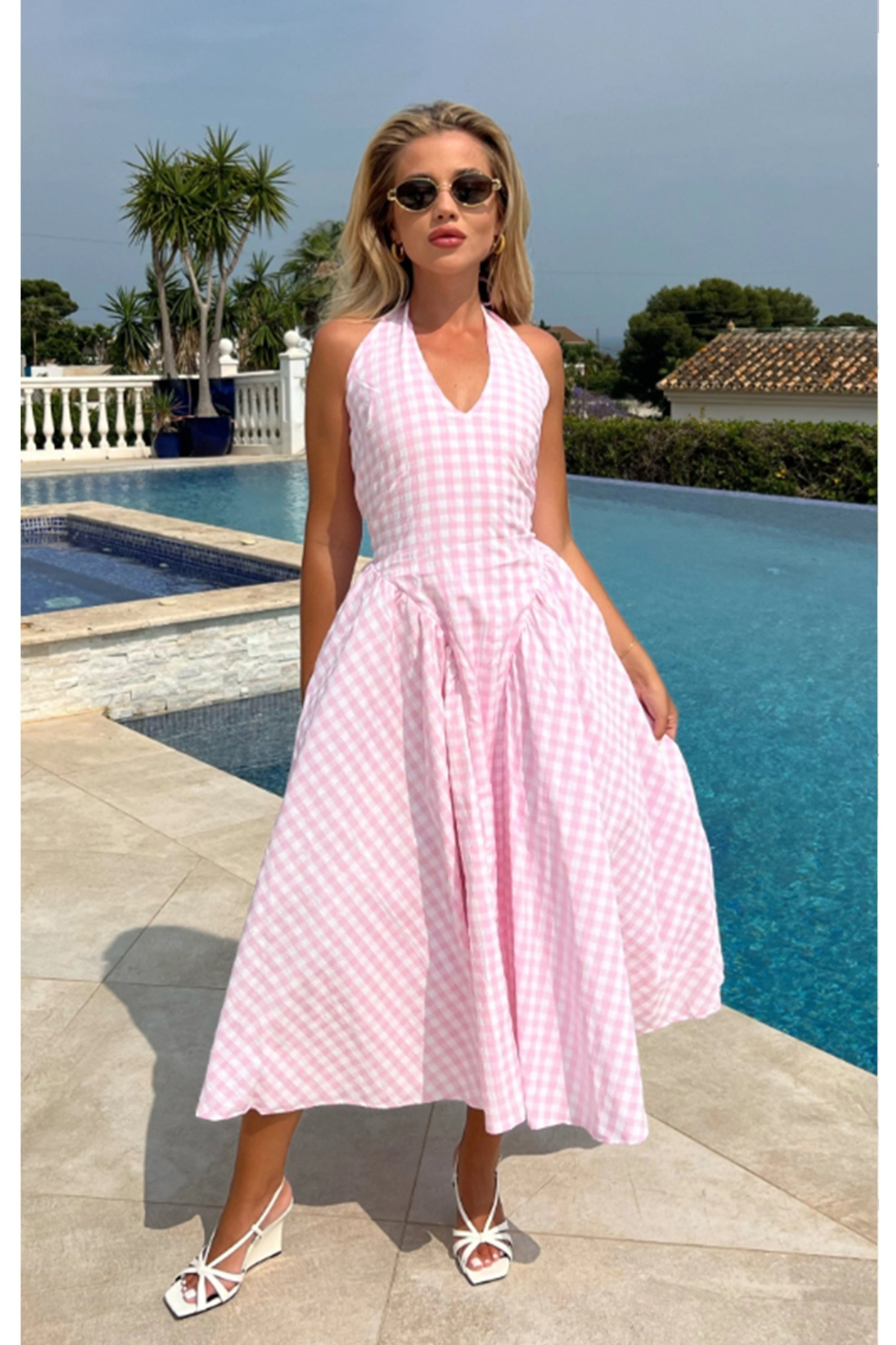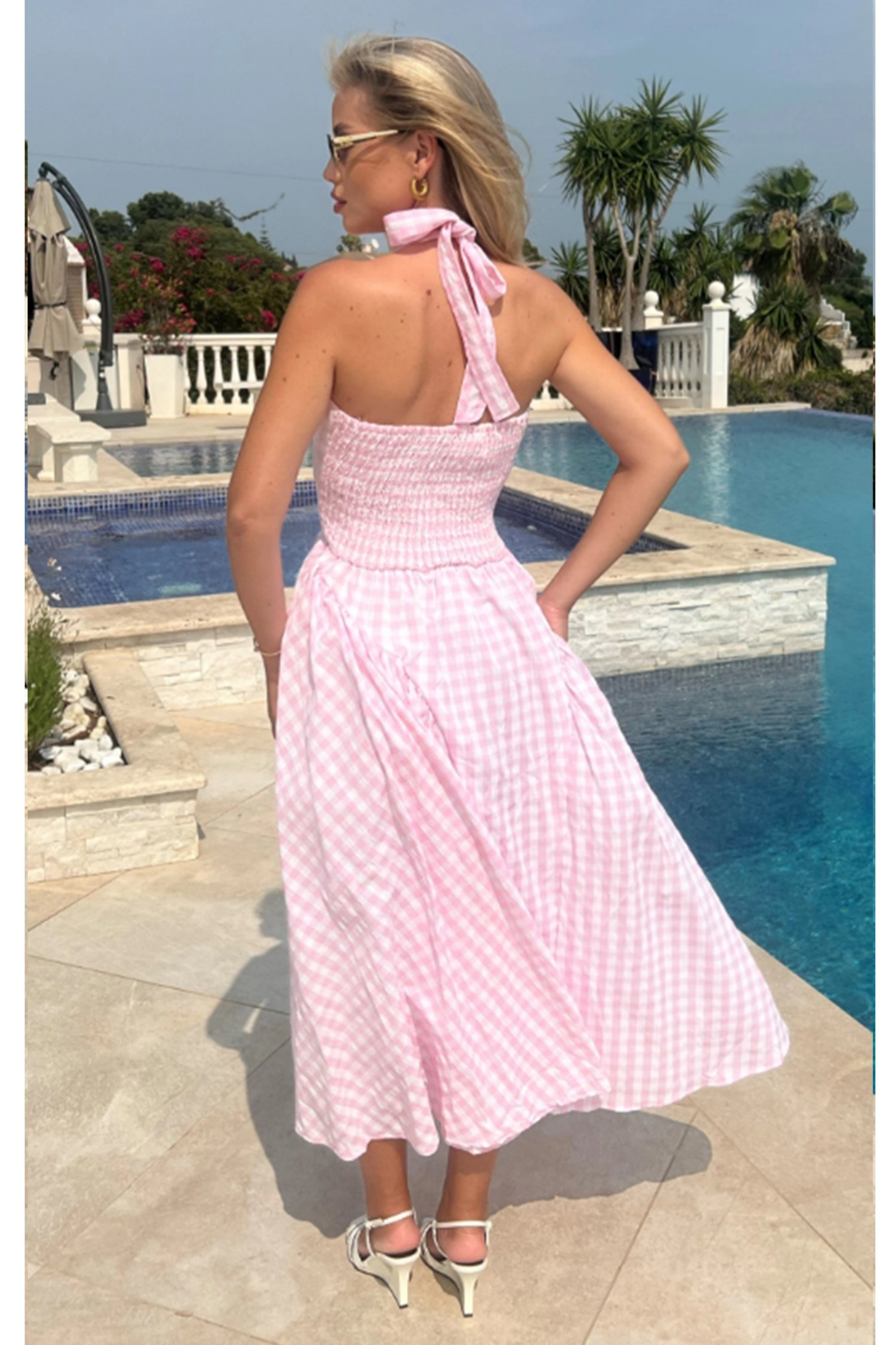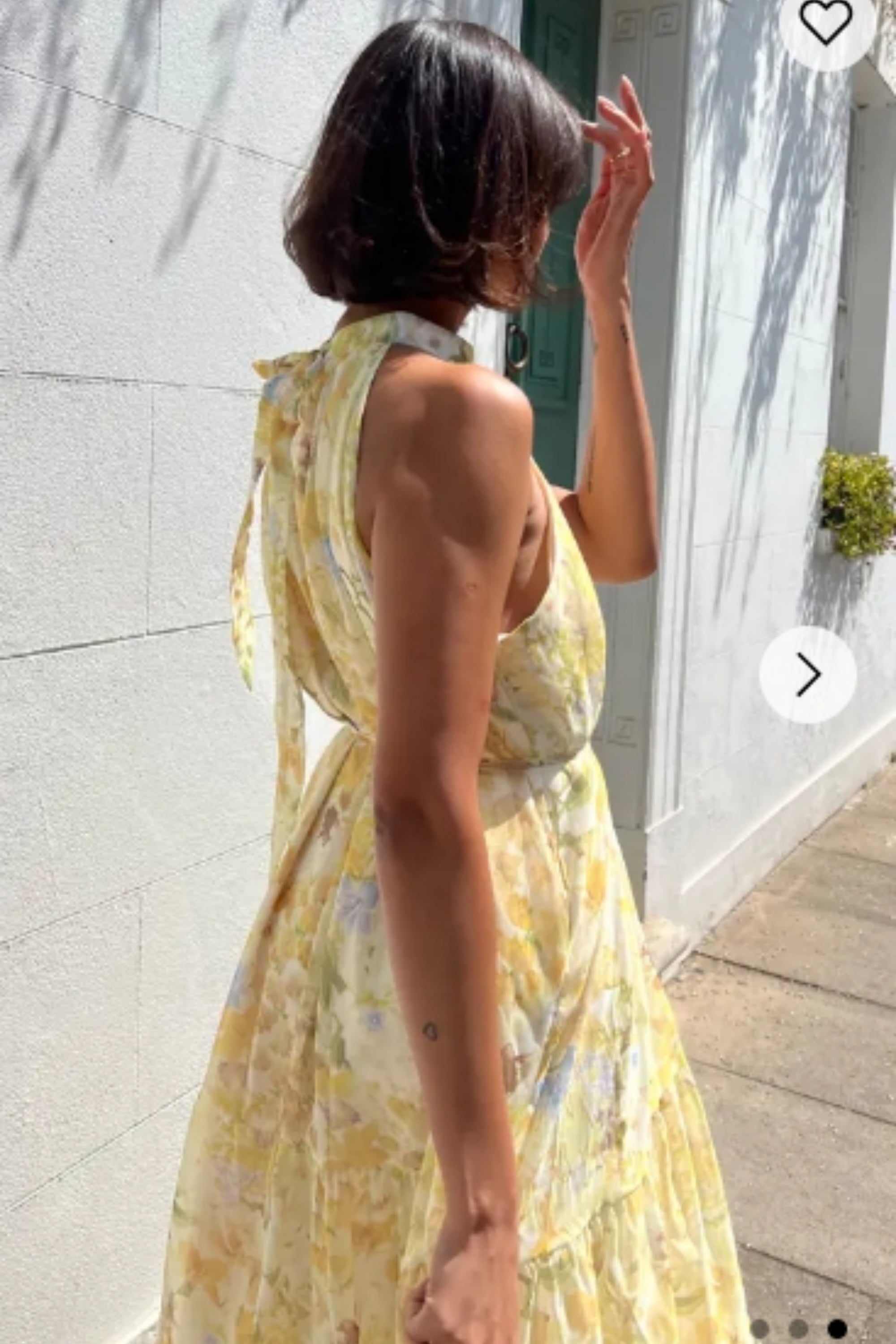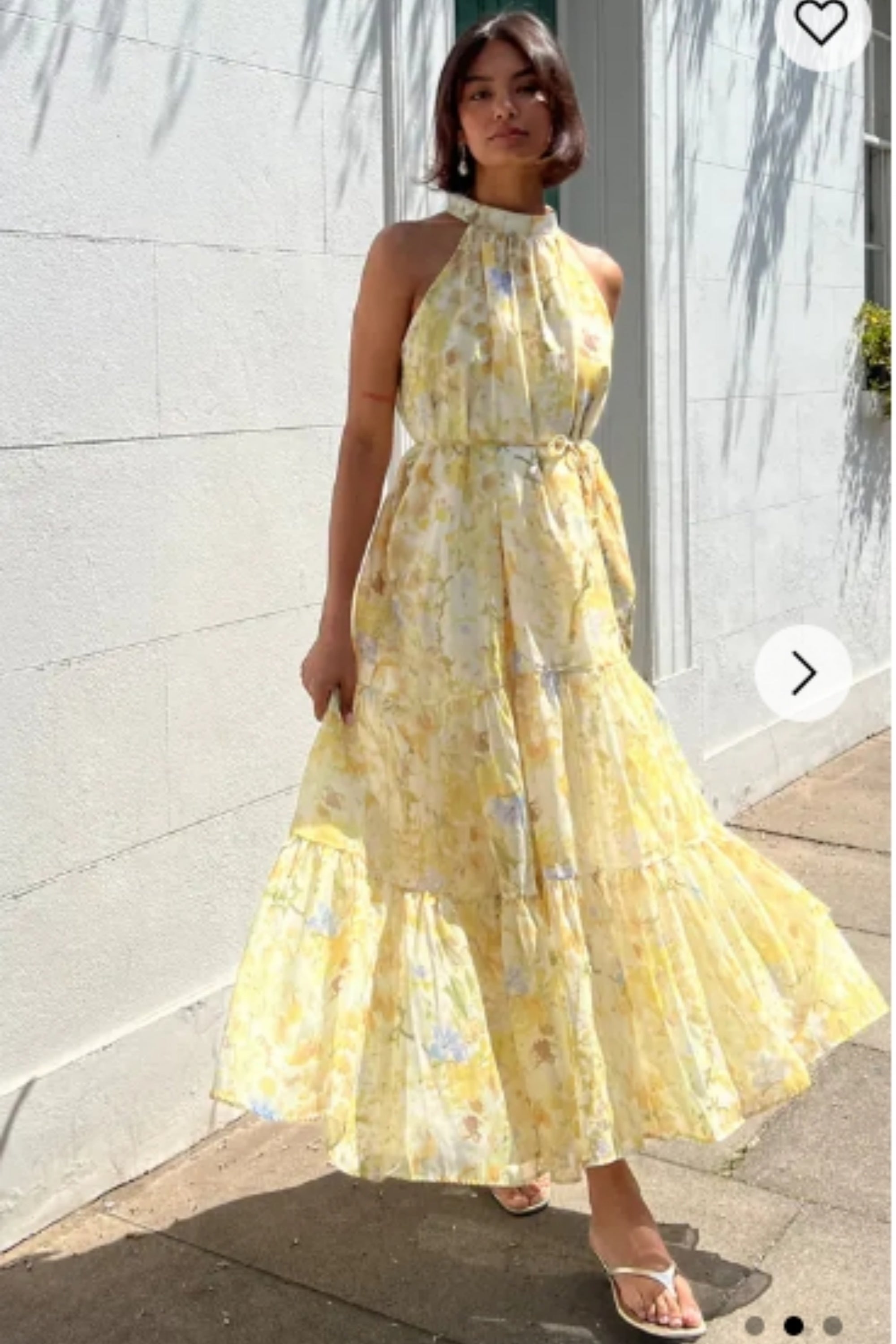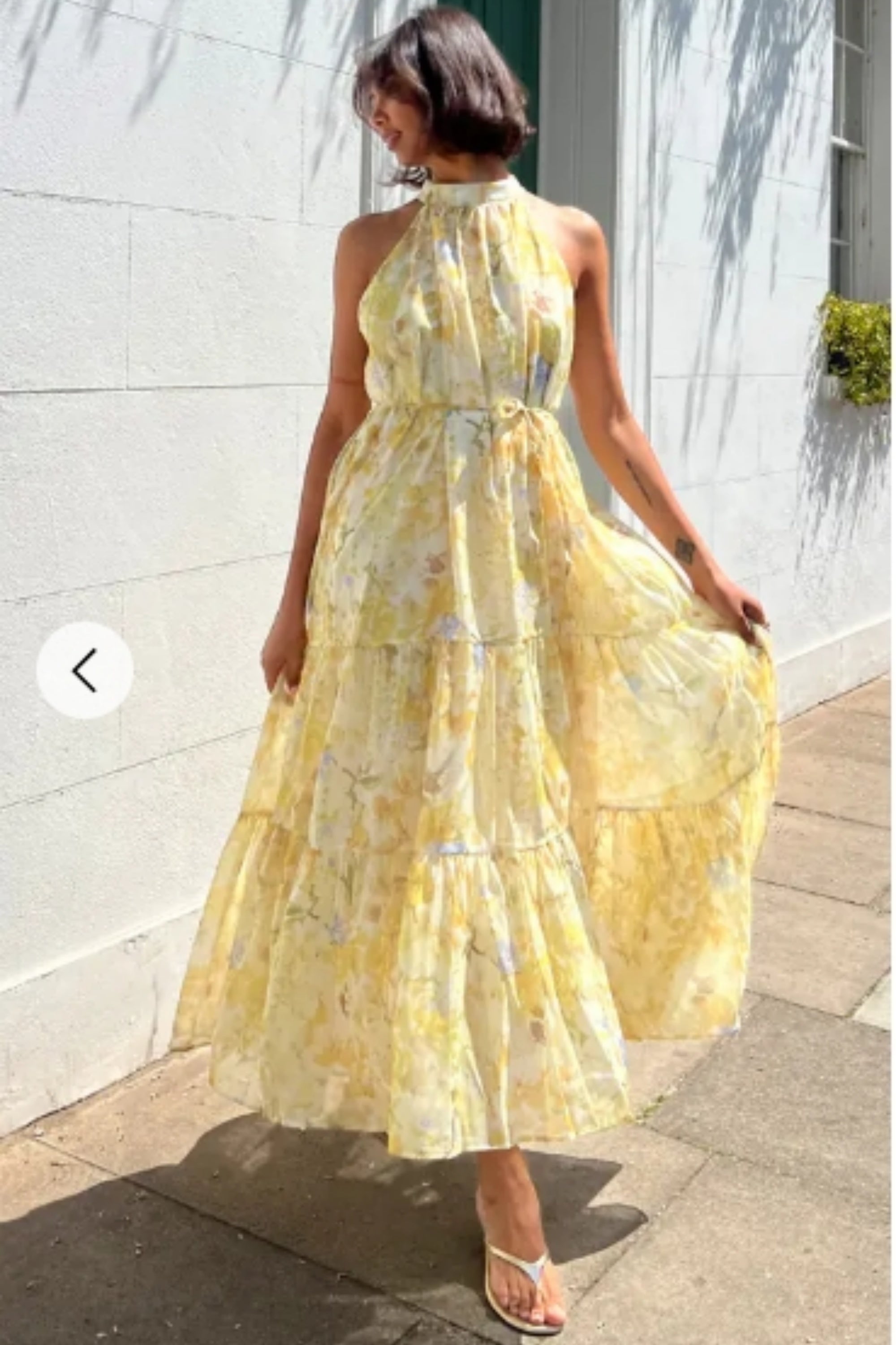 Multi floral print Organza feeling Halter neck maxi dress in yellow