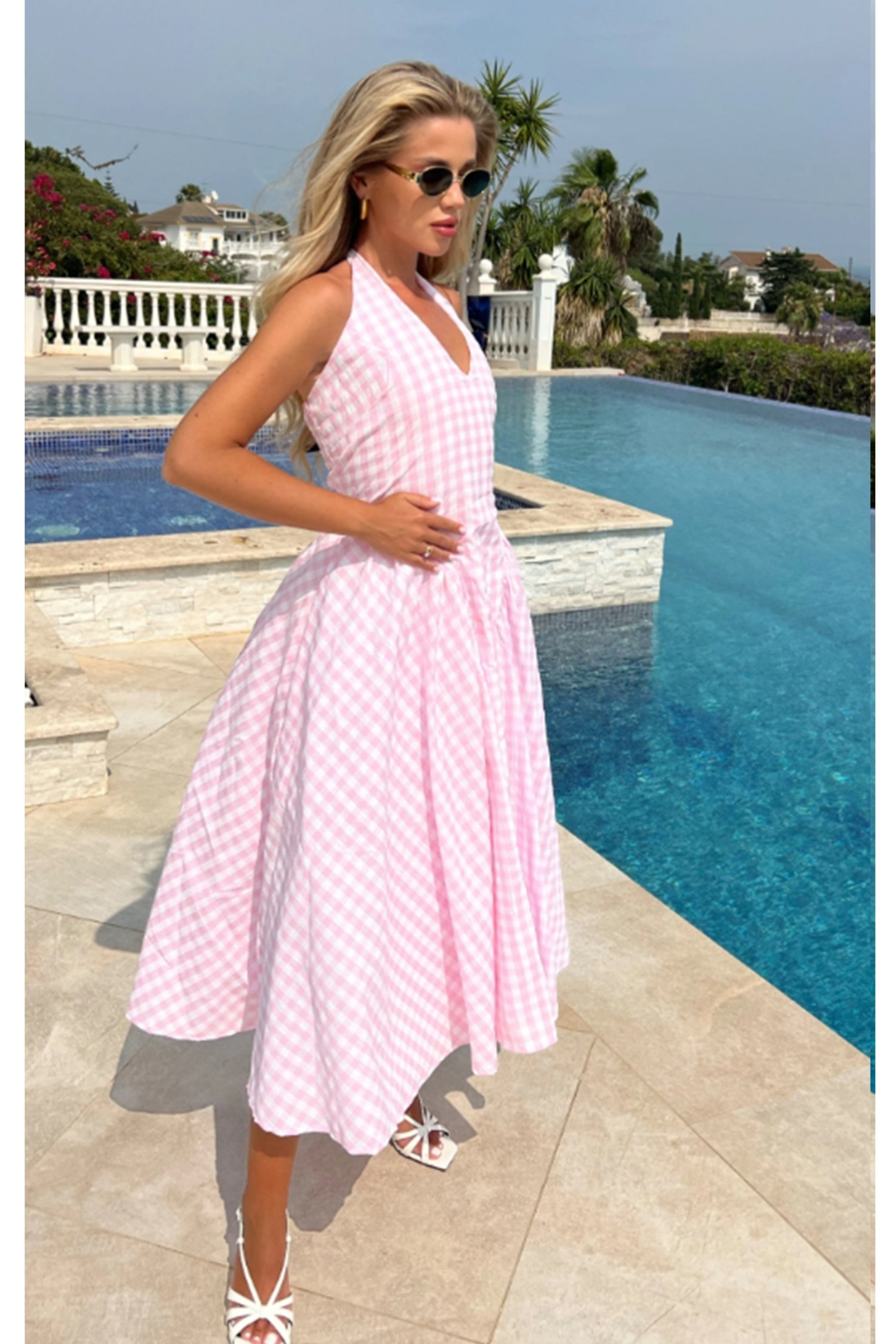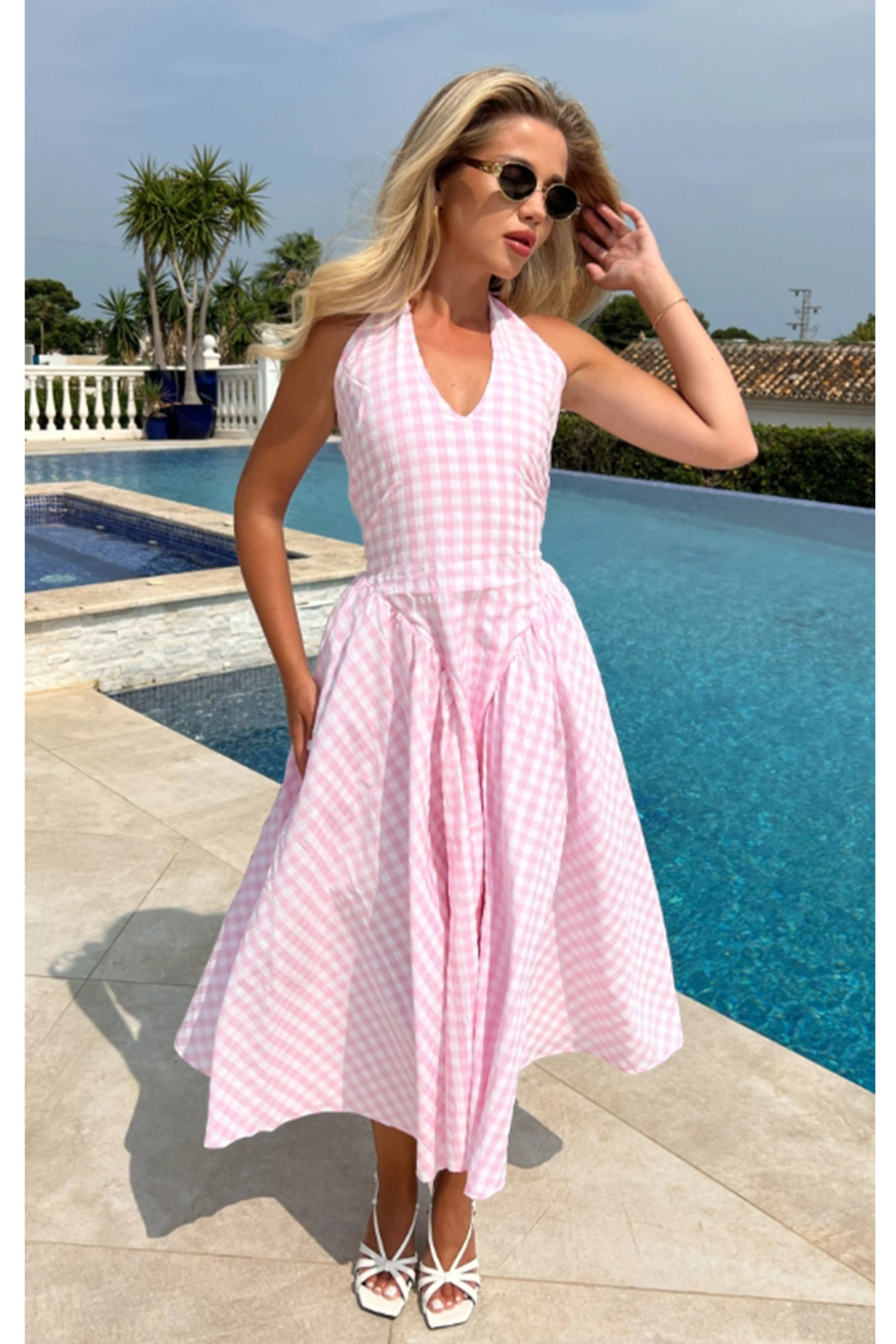 Multi floral print Organza feeling Halter neck maxi dress in Red