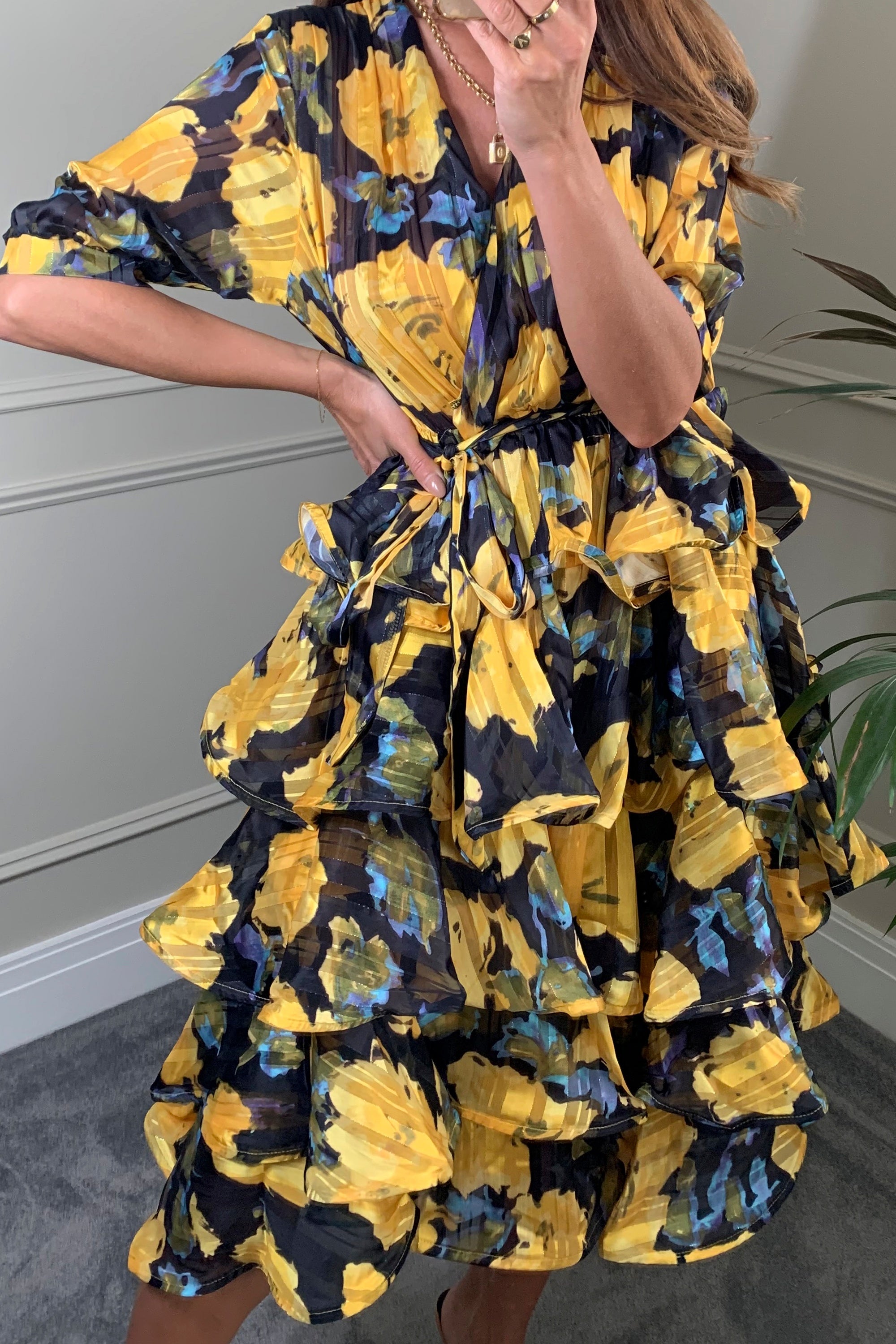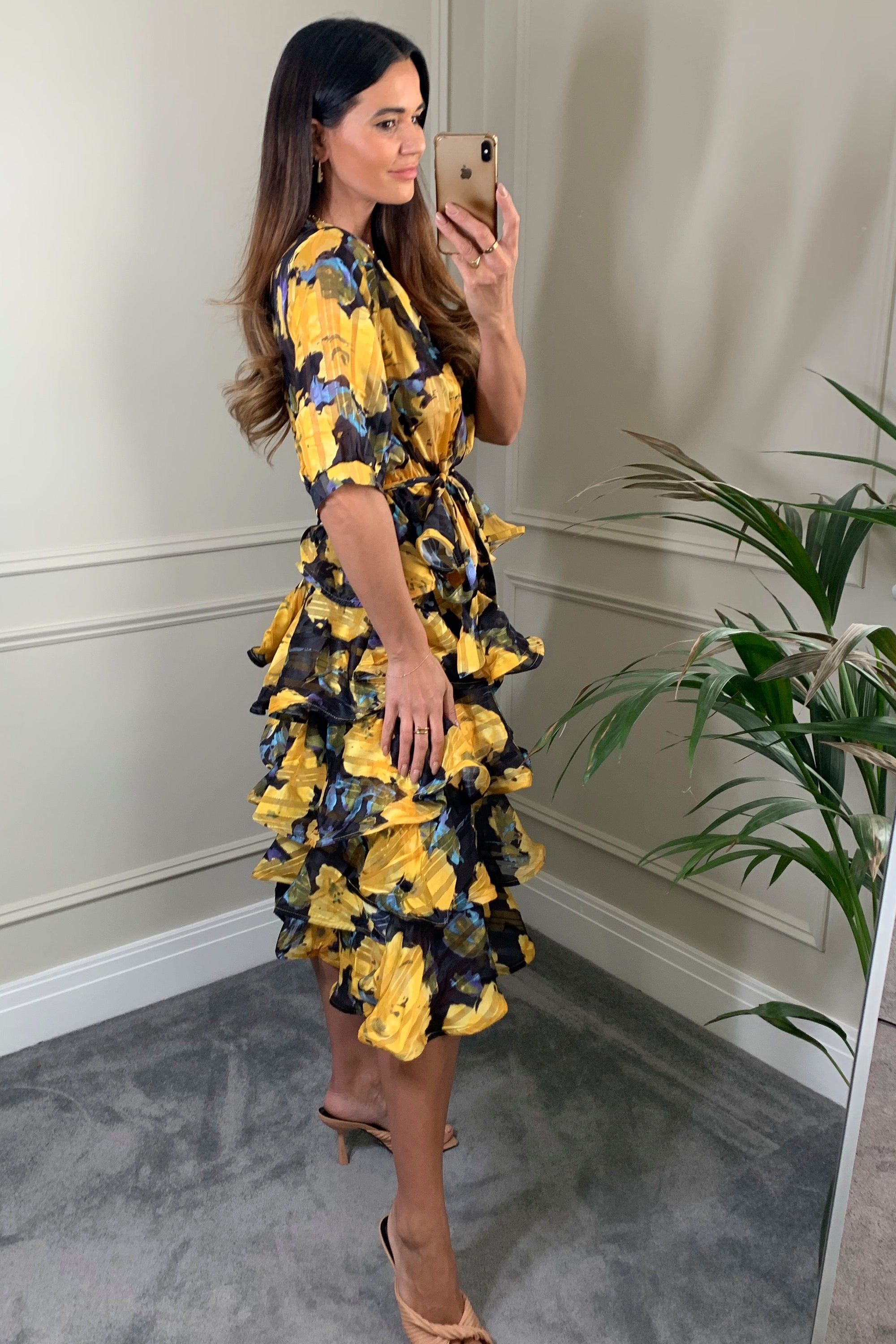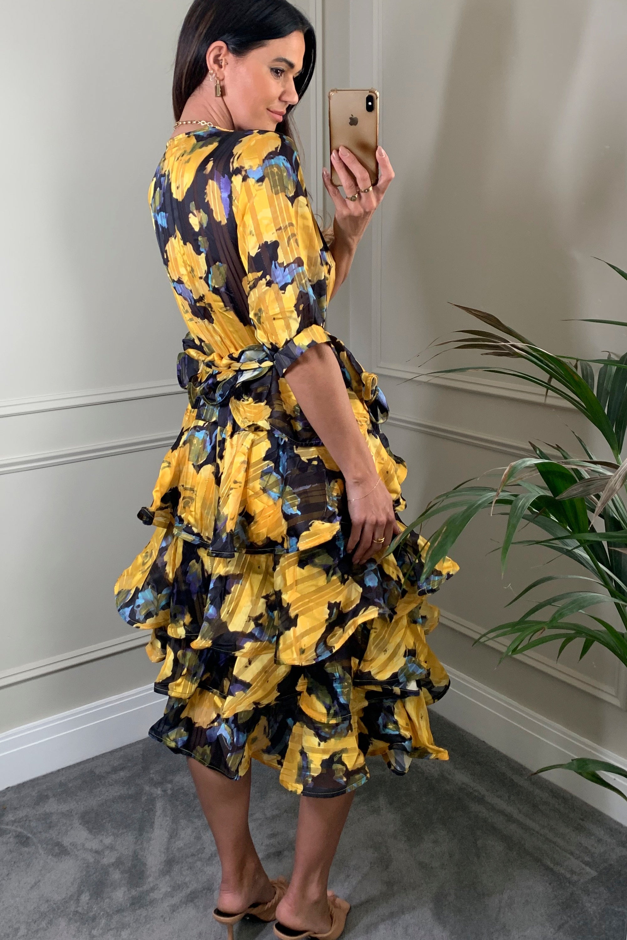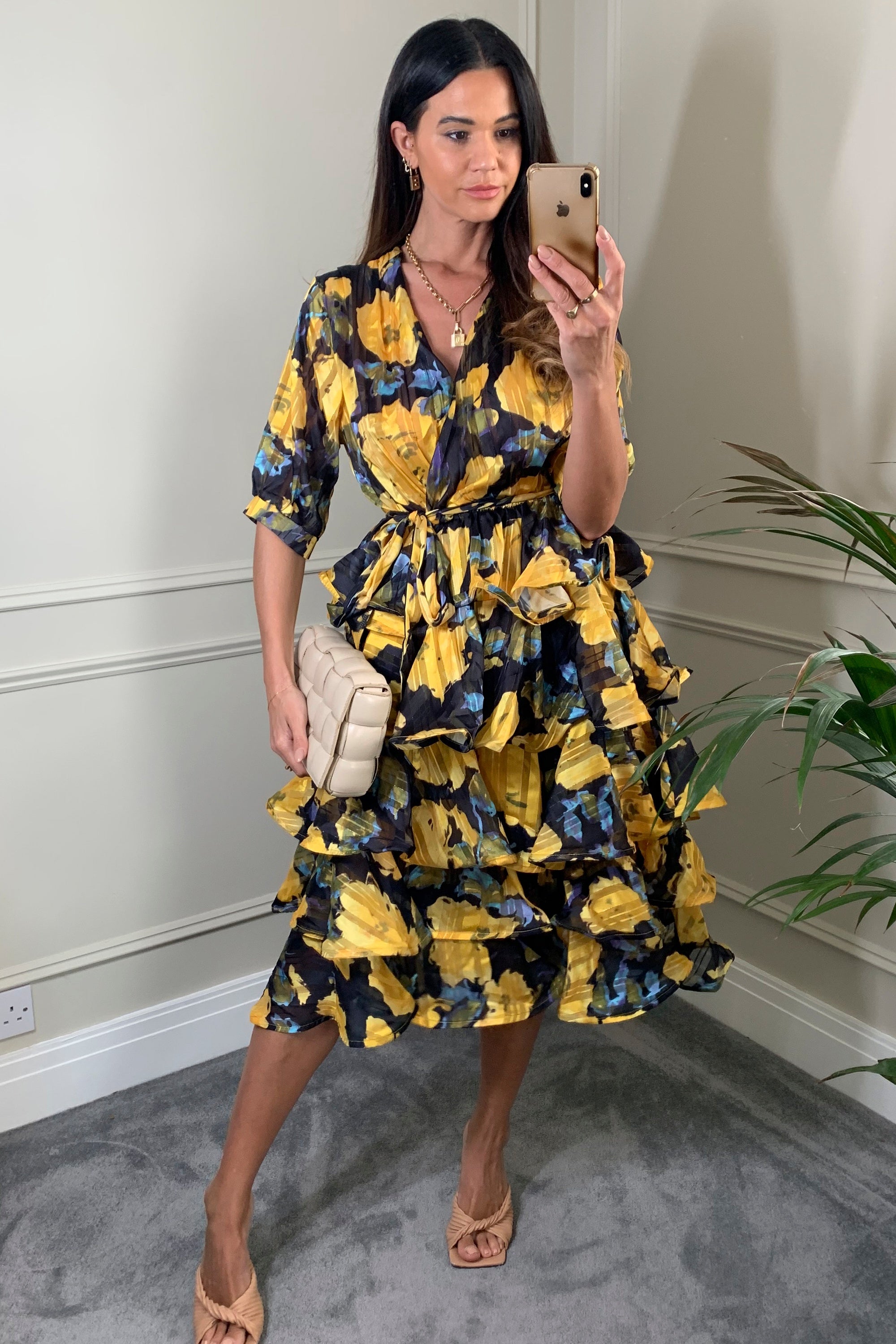Floral Print Ruffle Multi Layer Hem Design Dress In Yellow