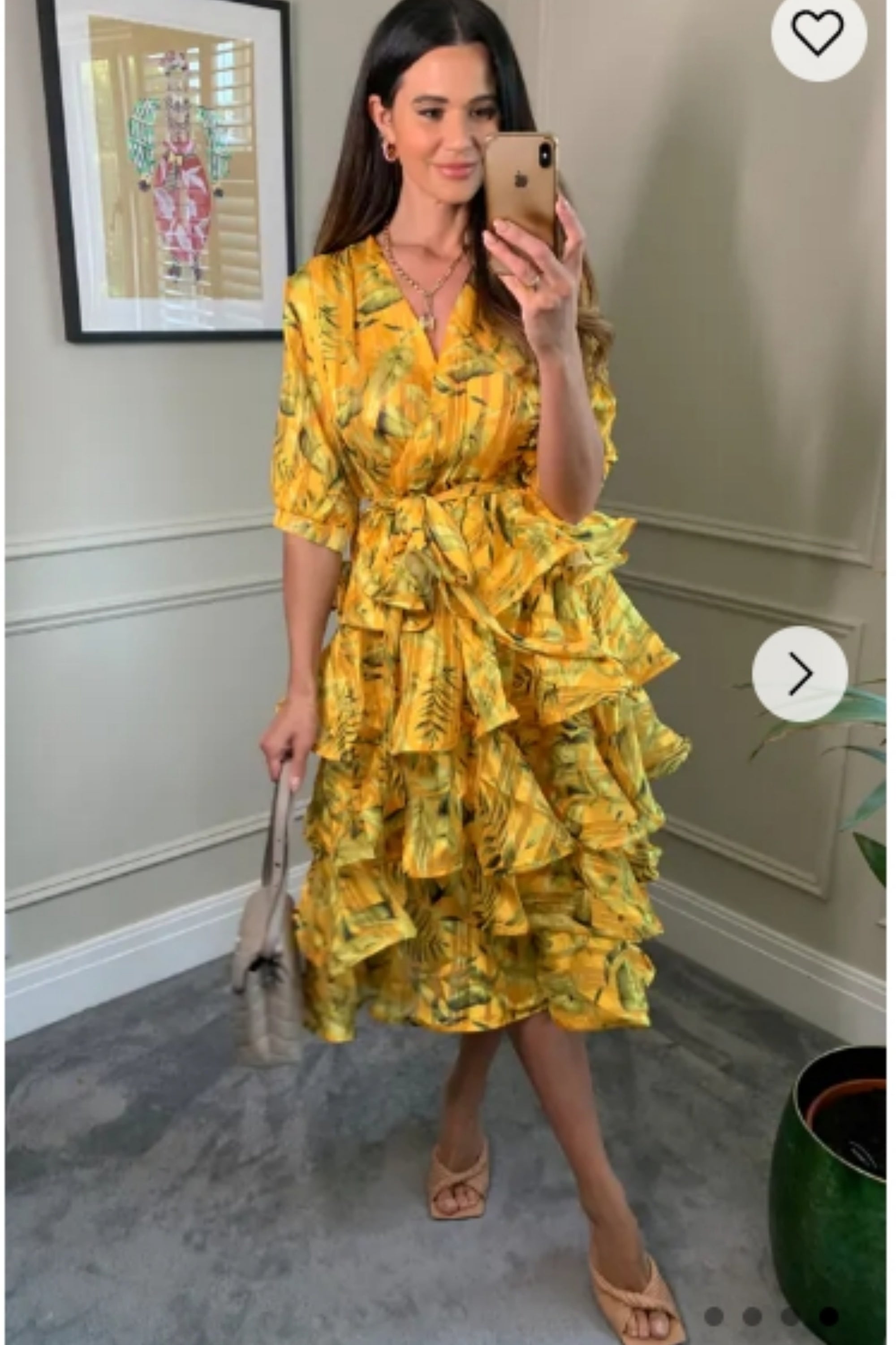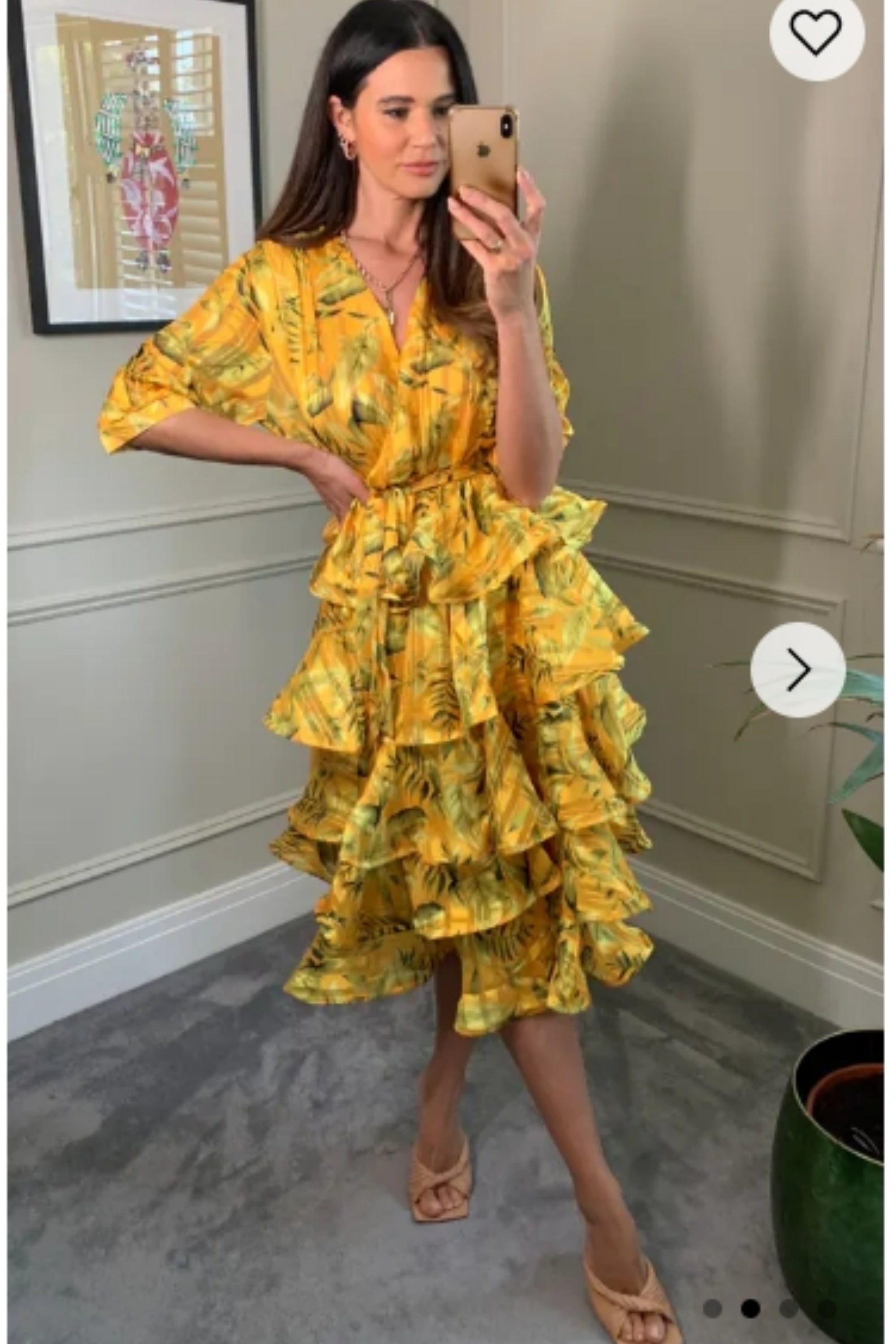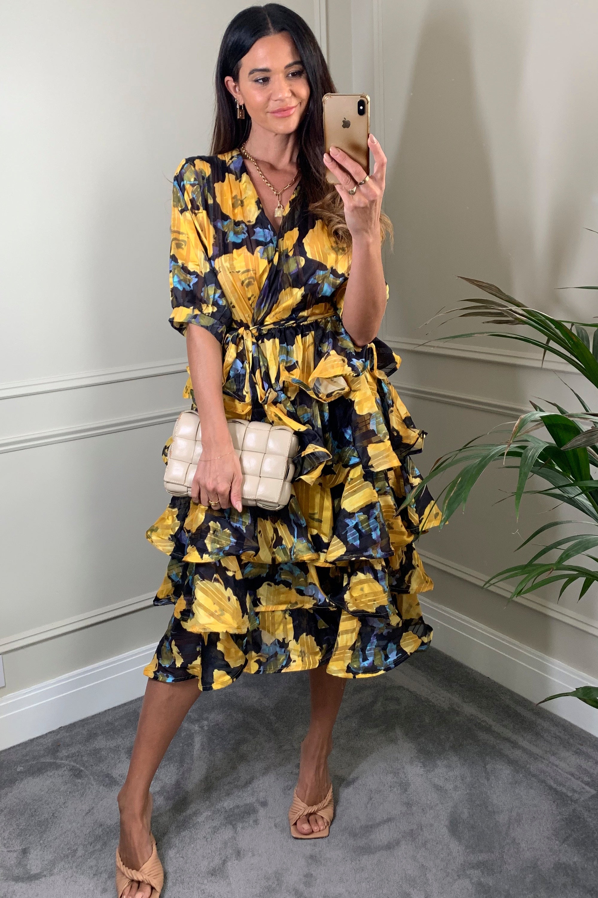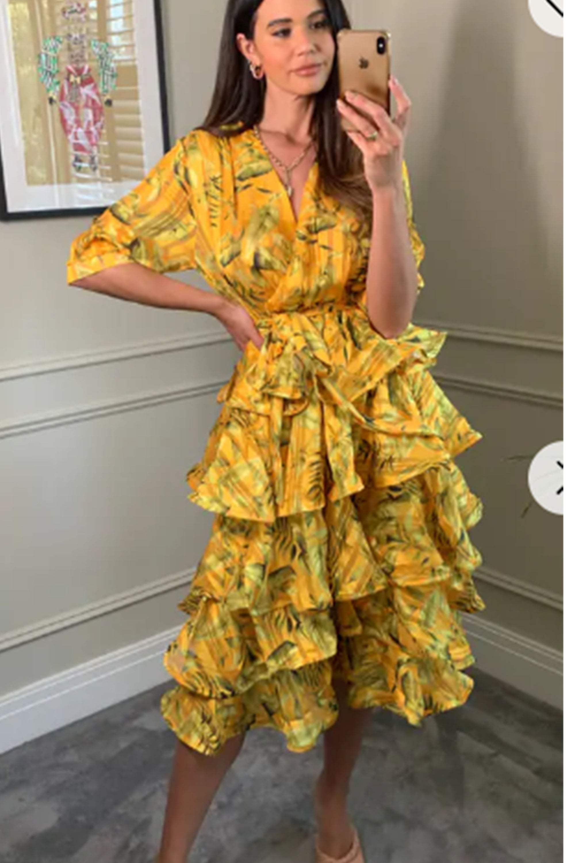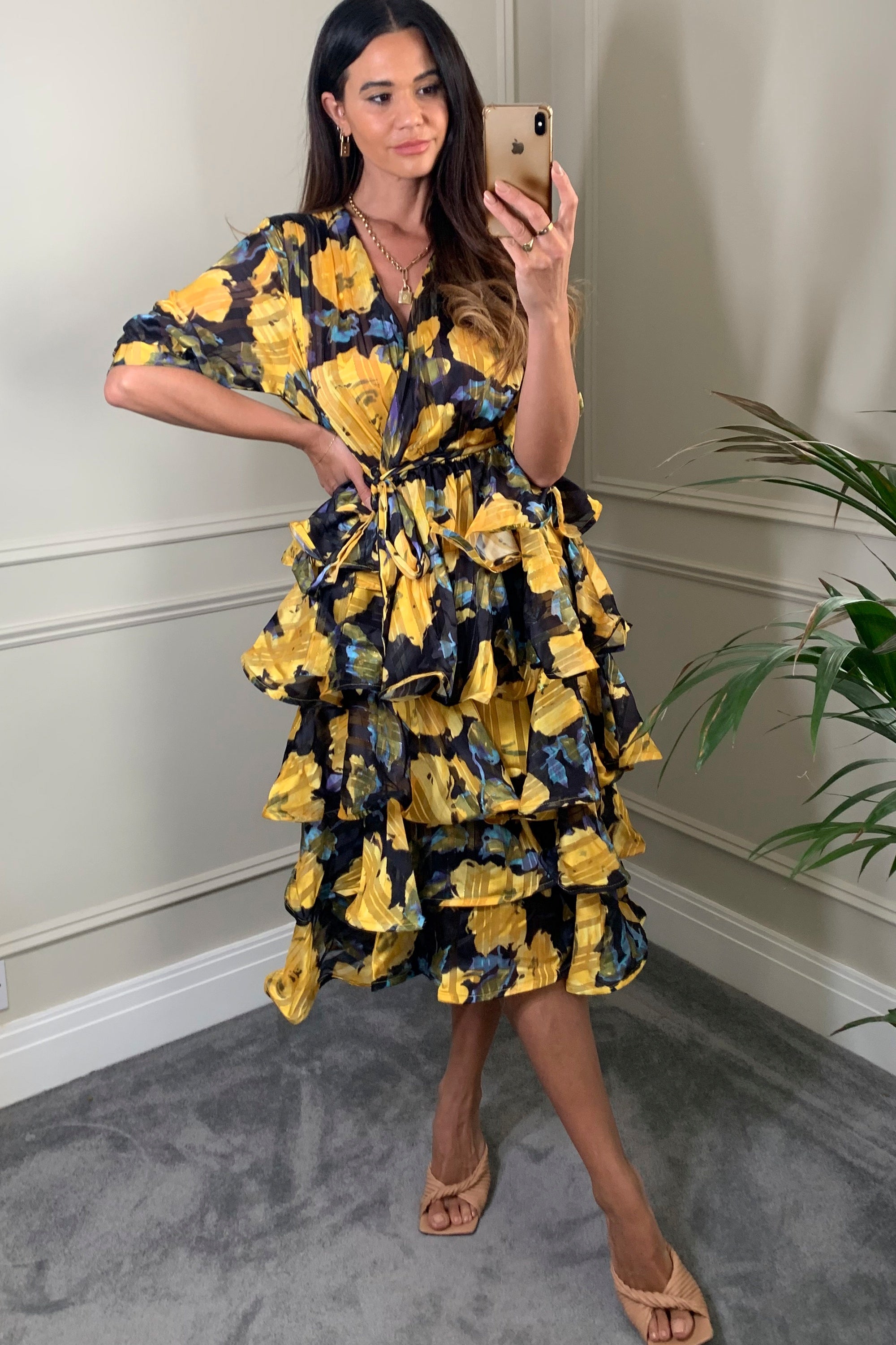 Floral Print Ruffle Multi Layer Hem Design Dress In Yellow