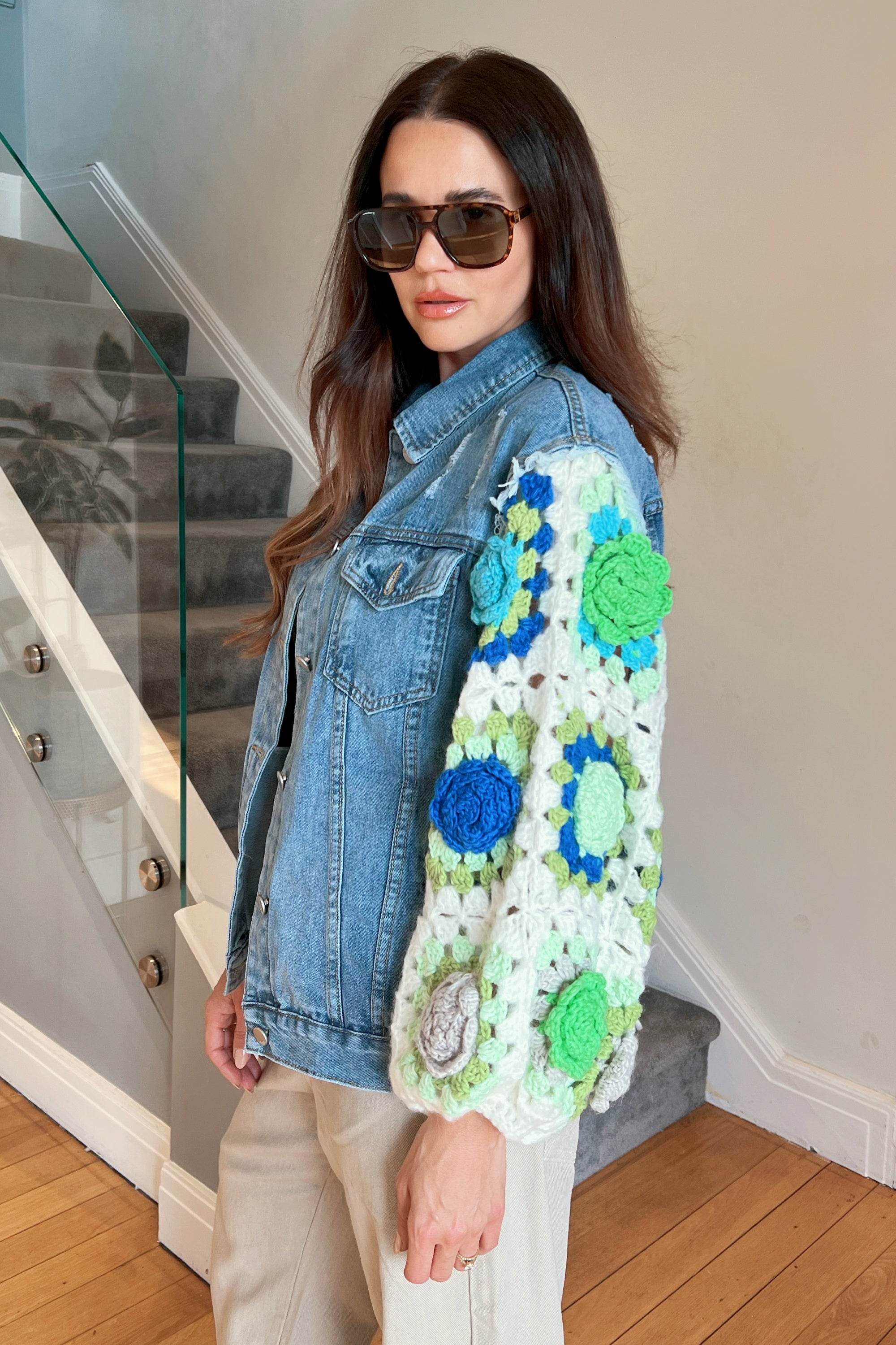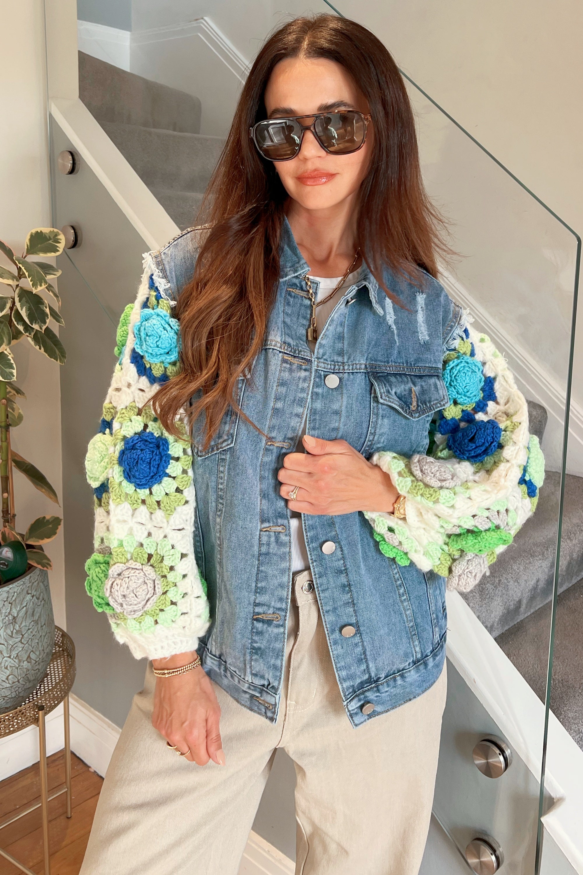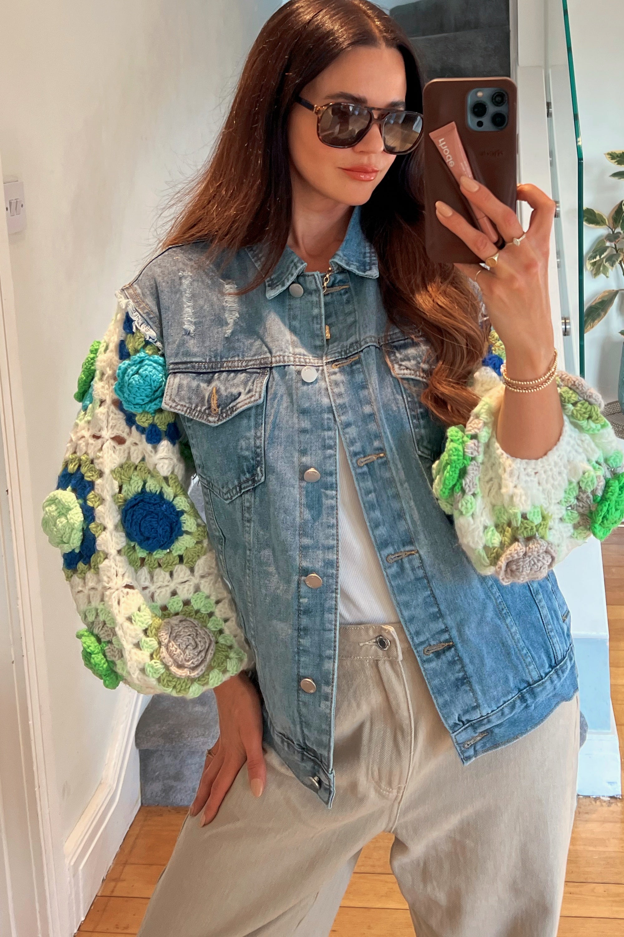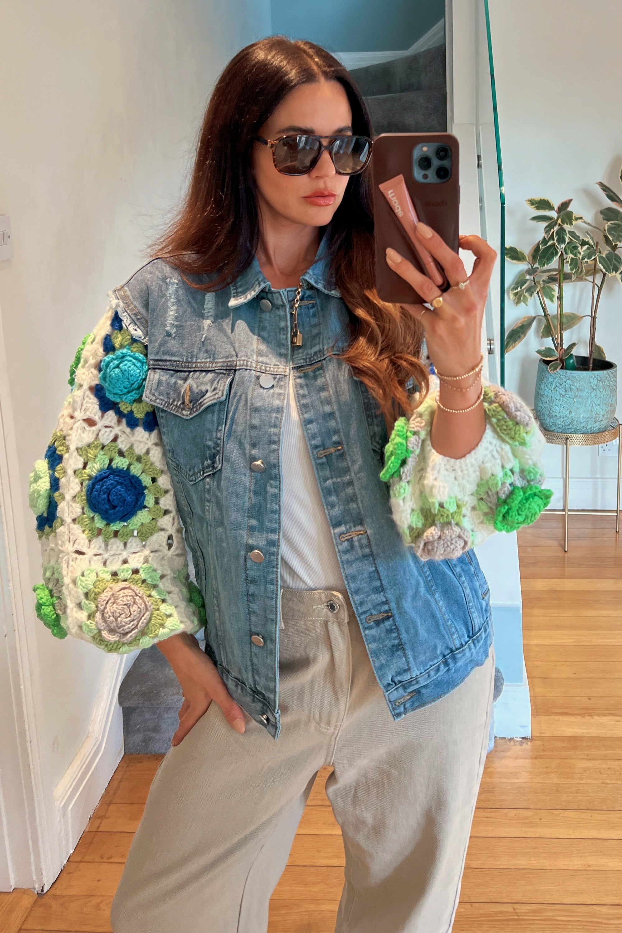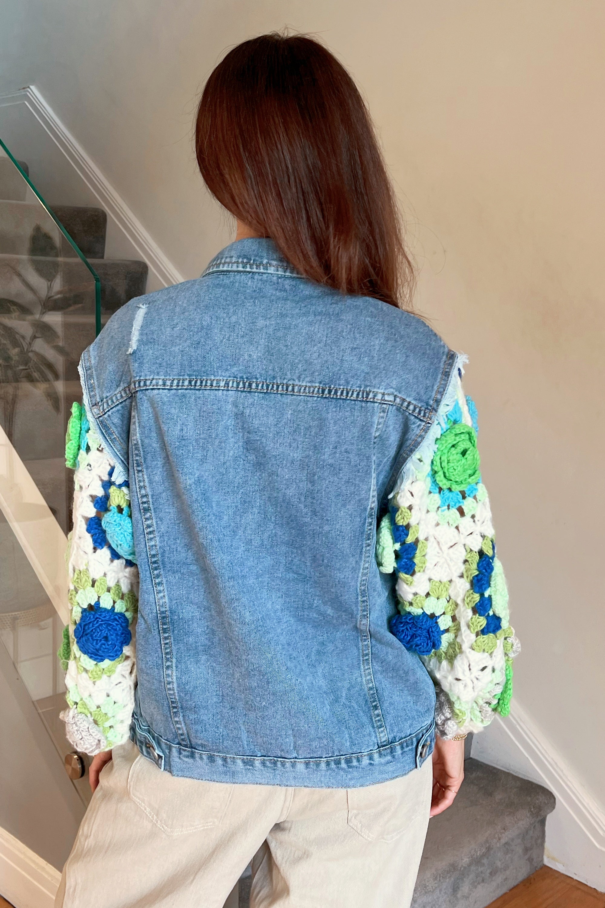 Handknit Floral Patten Sleeves Denim Jacket in Green