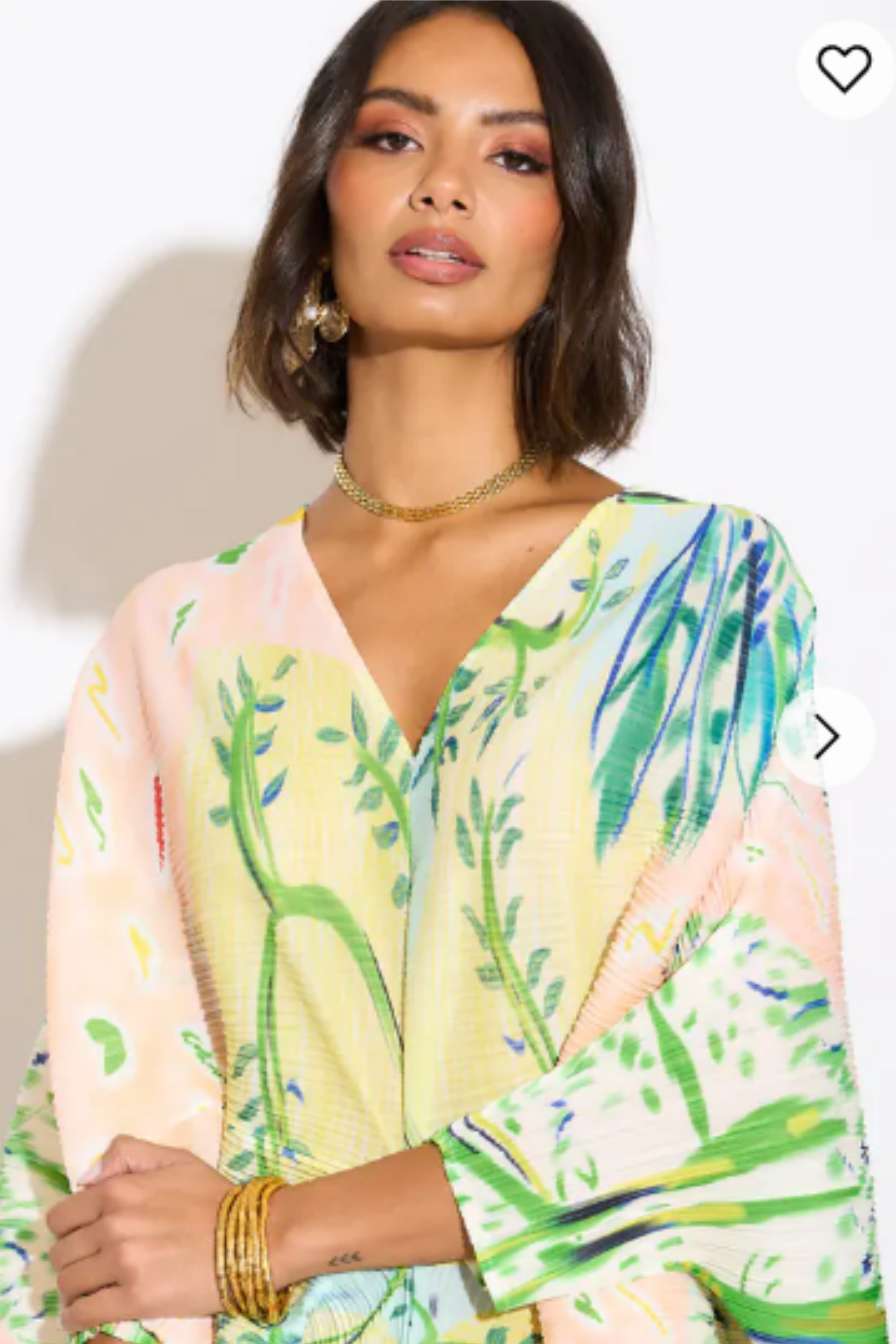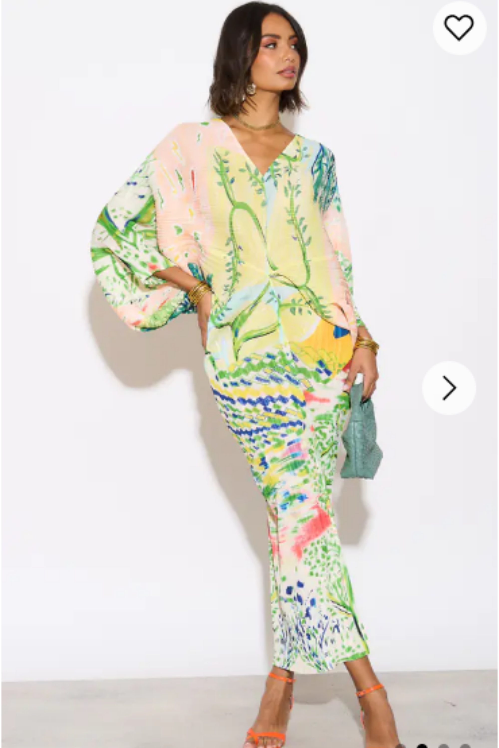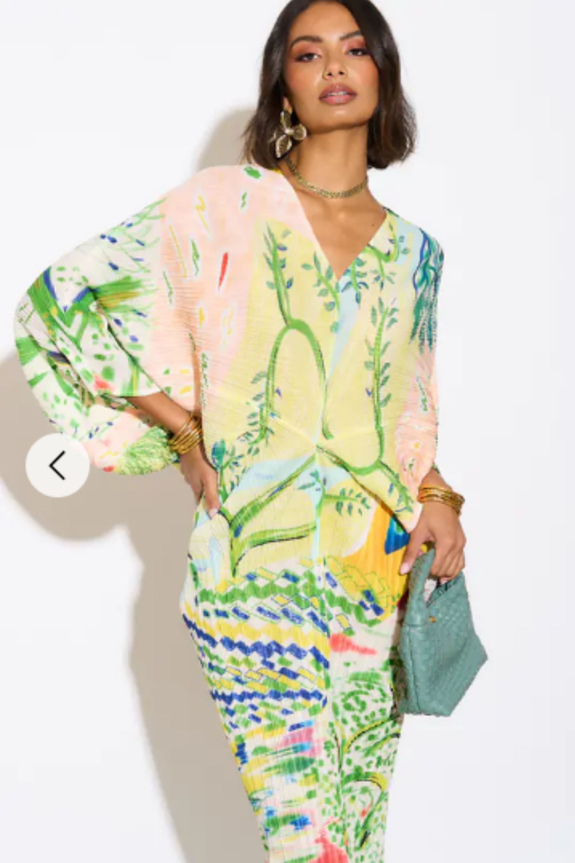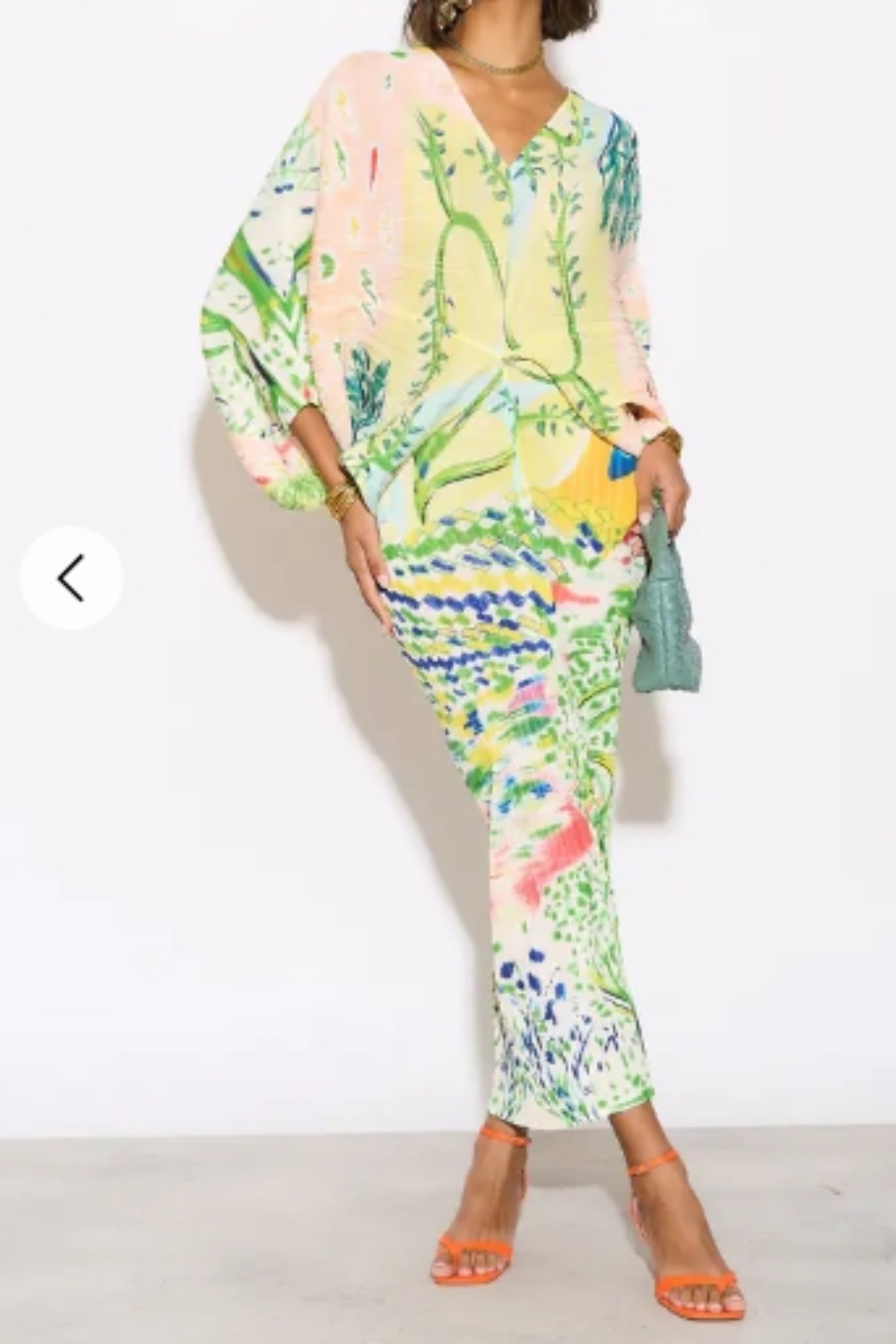 Leaves and Floral Scarf Pirnt Pleated Dress in Kimono sleeves in green