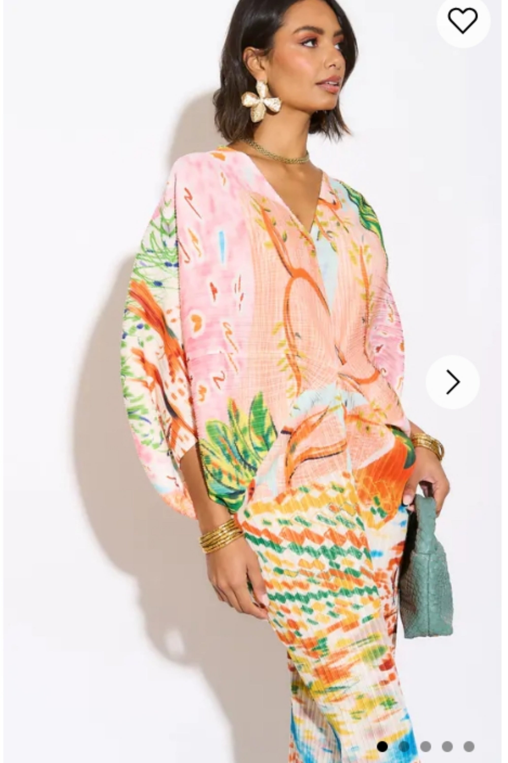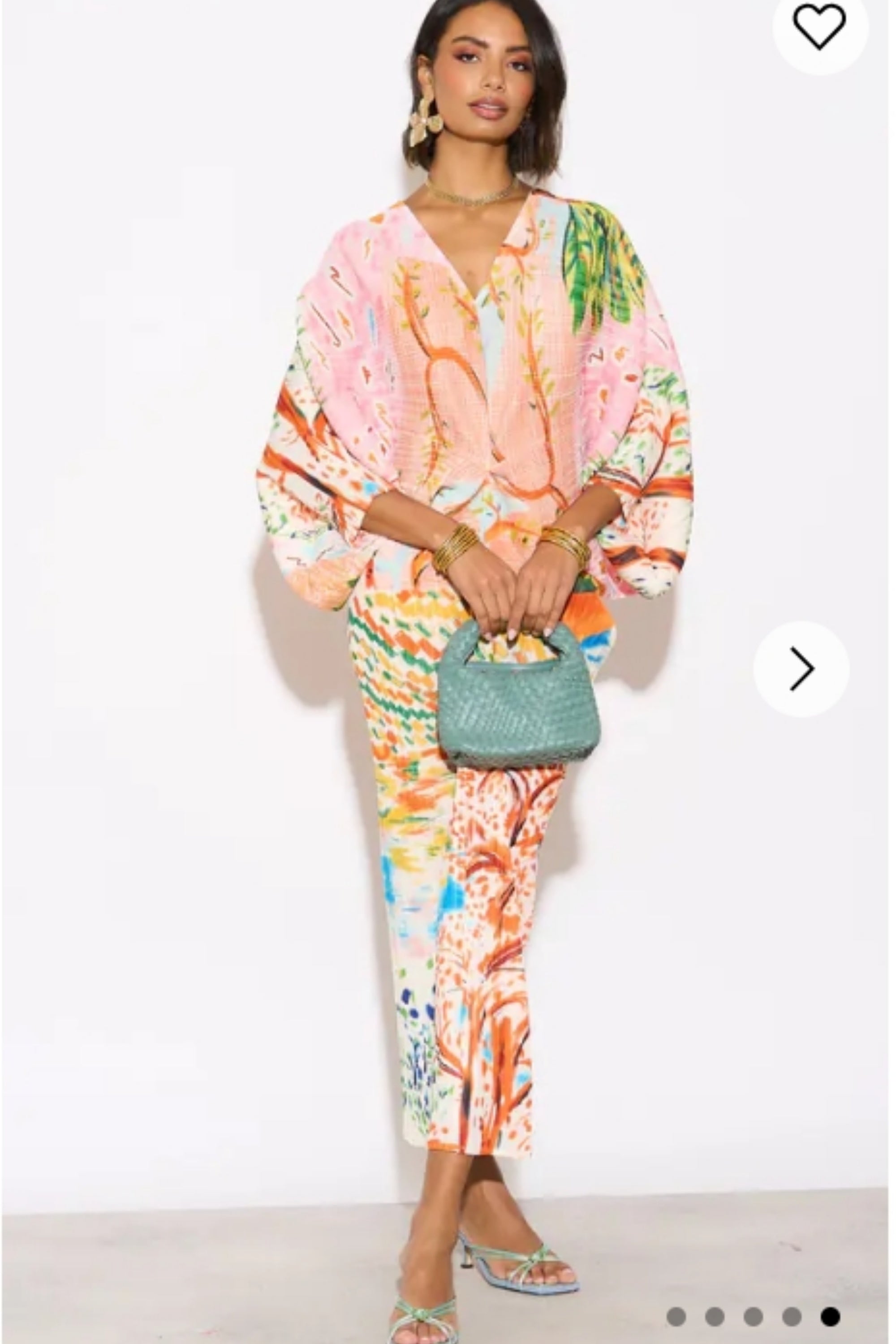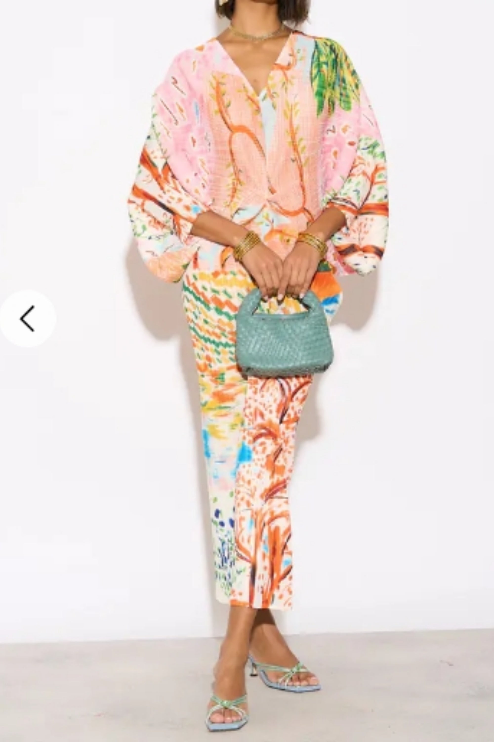 Leaves and Floral Scarf Pirnt Pleated Dress in Kimono sleeves in pink