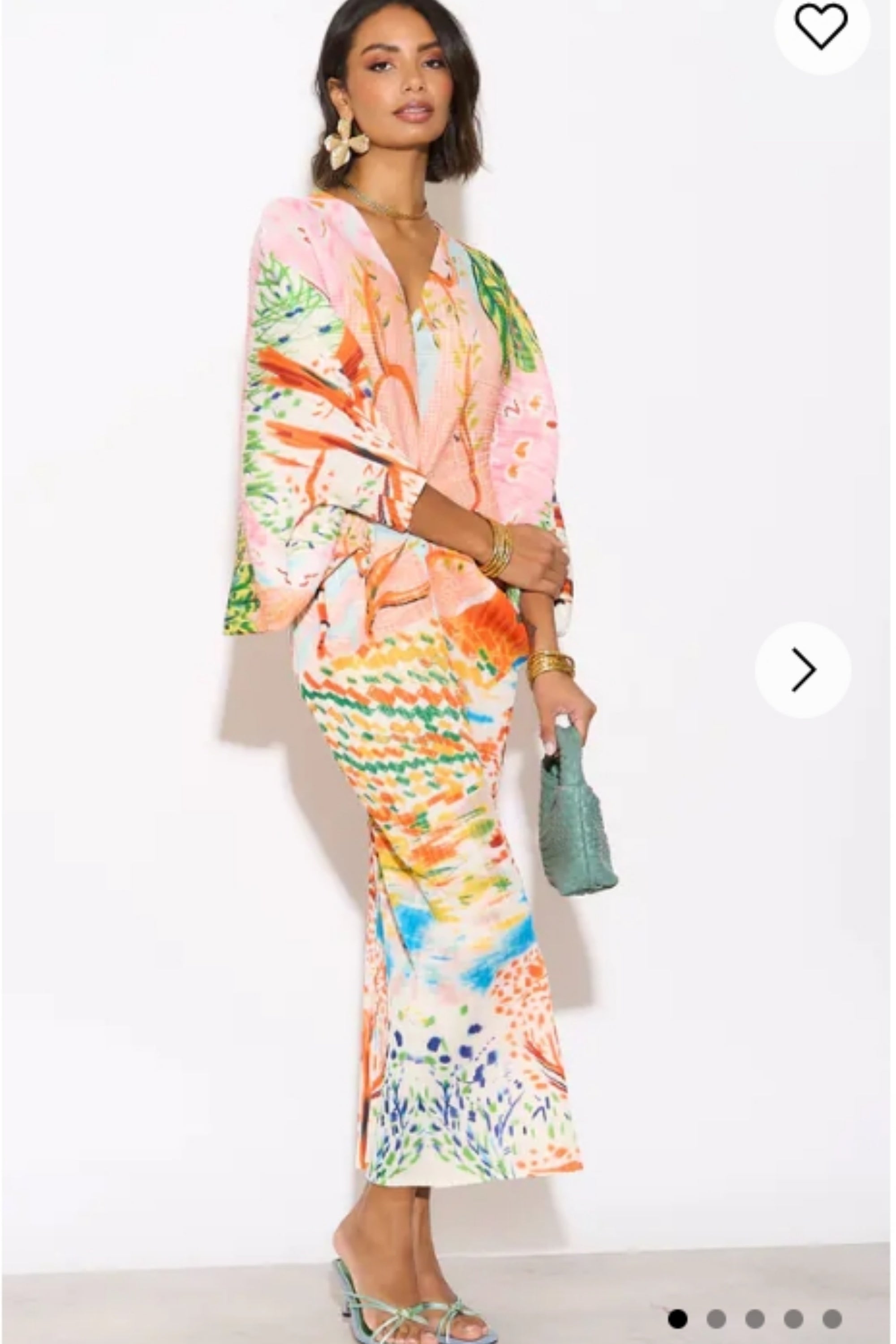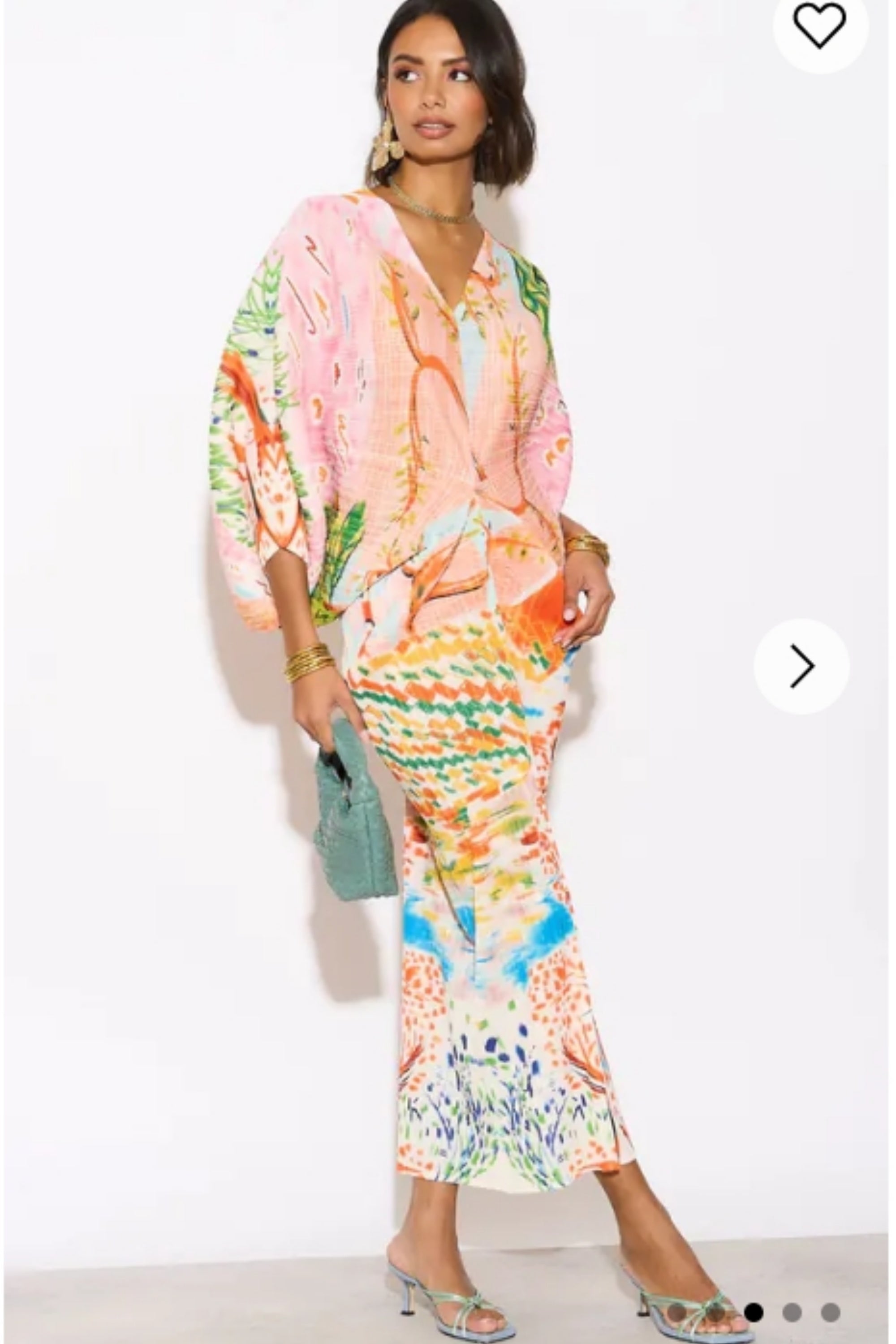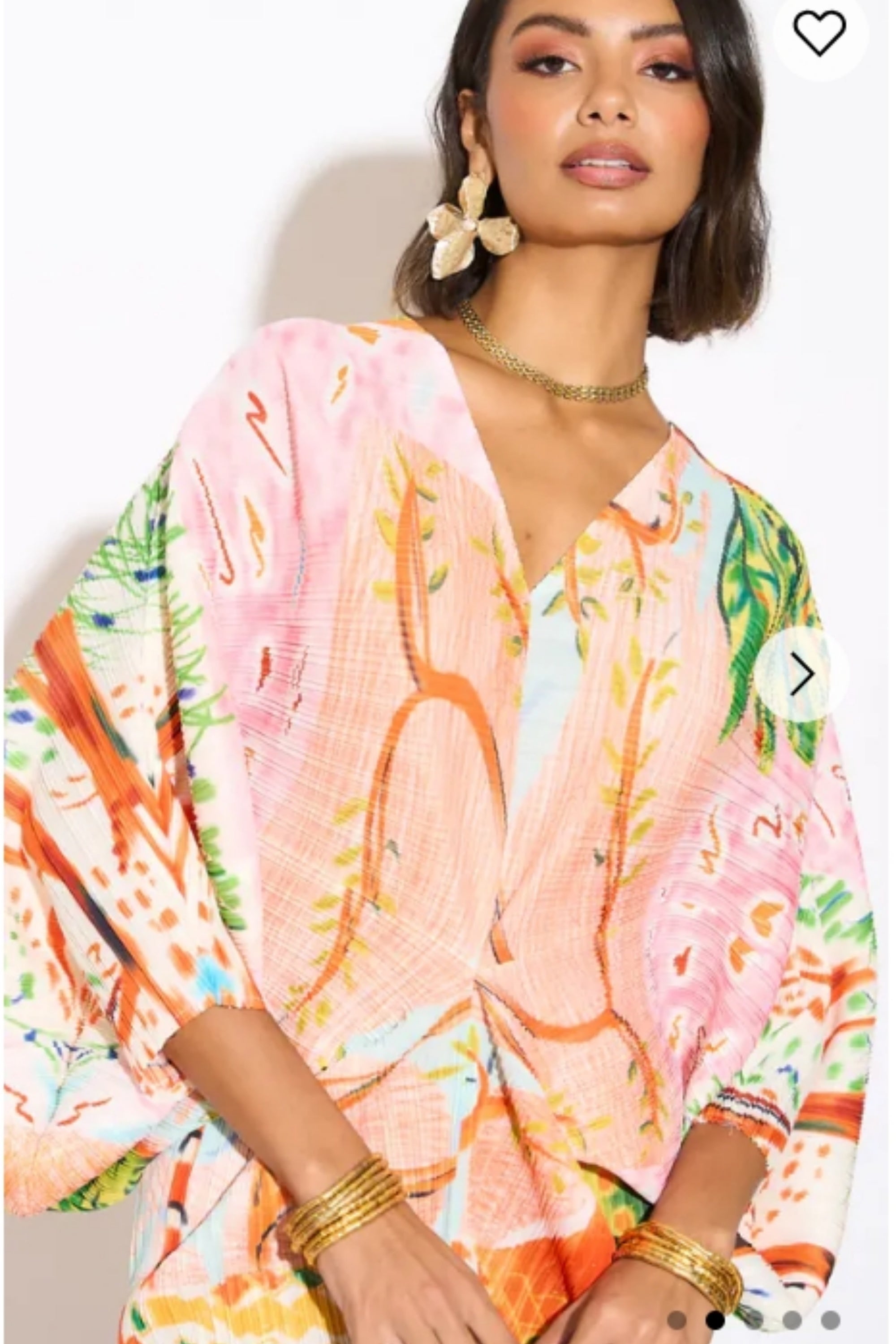 Leaves and Floral Scarf Pirnt Pleated Dress in Kimono sleeves in pink
