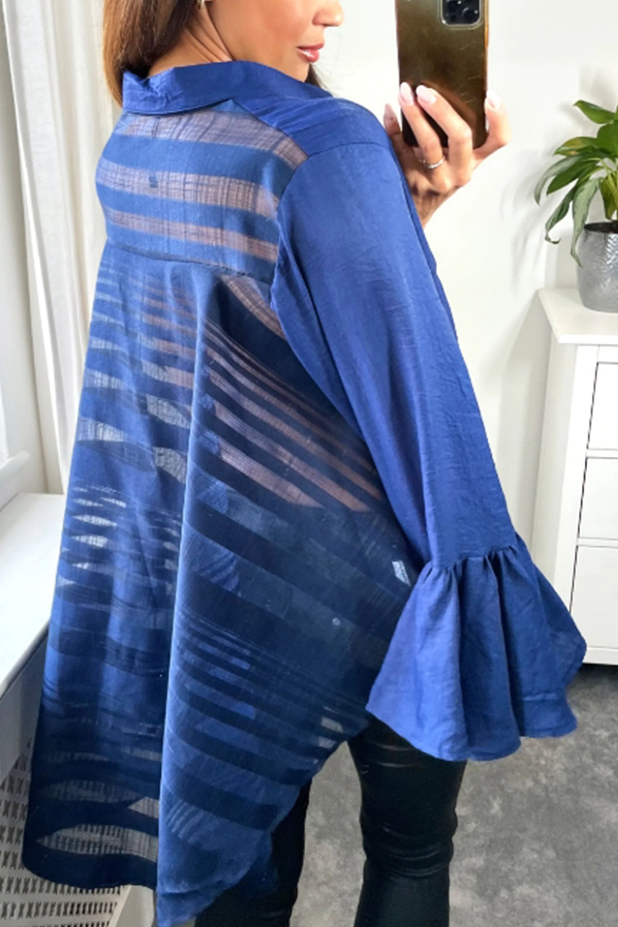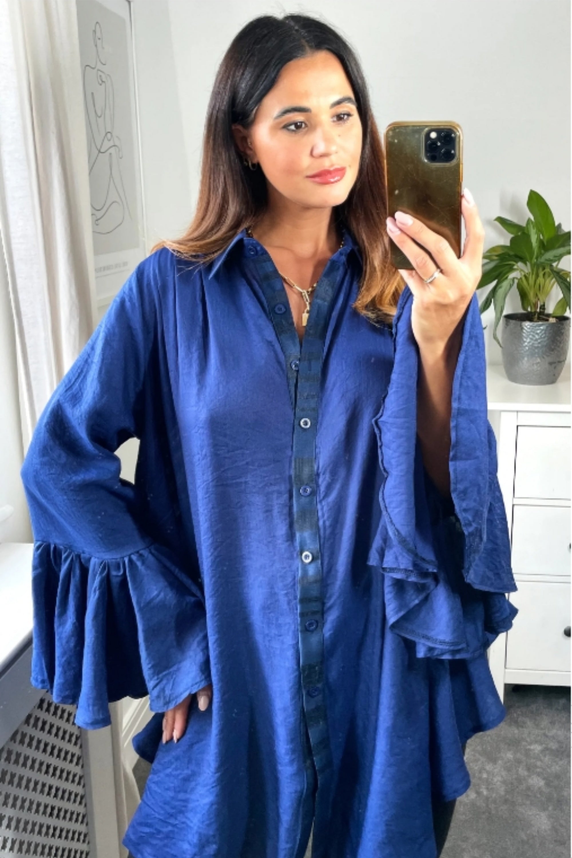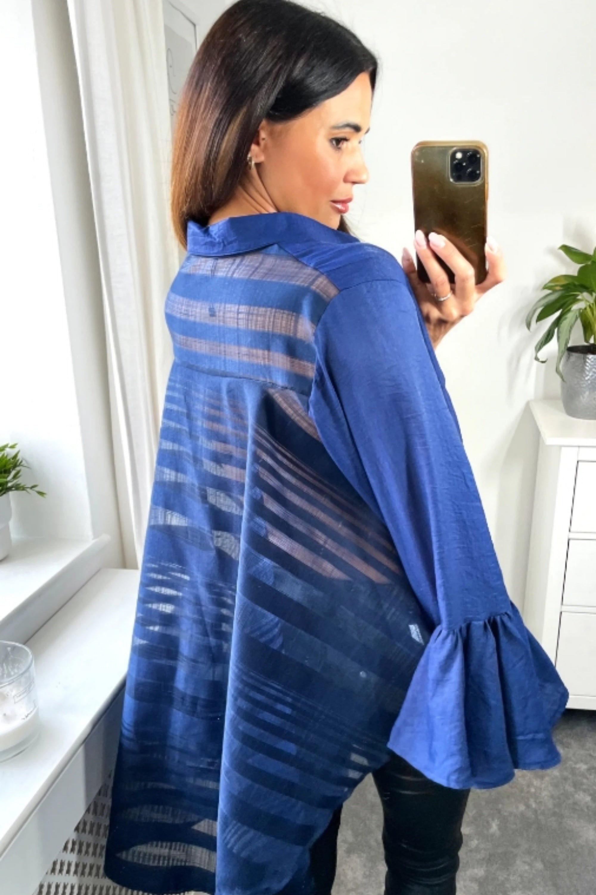 Oversized Shirt with Frilled Sleeves and Mesh Back in Blue