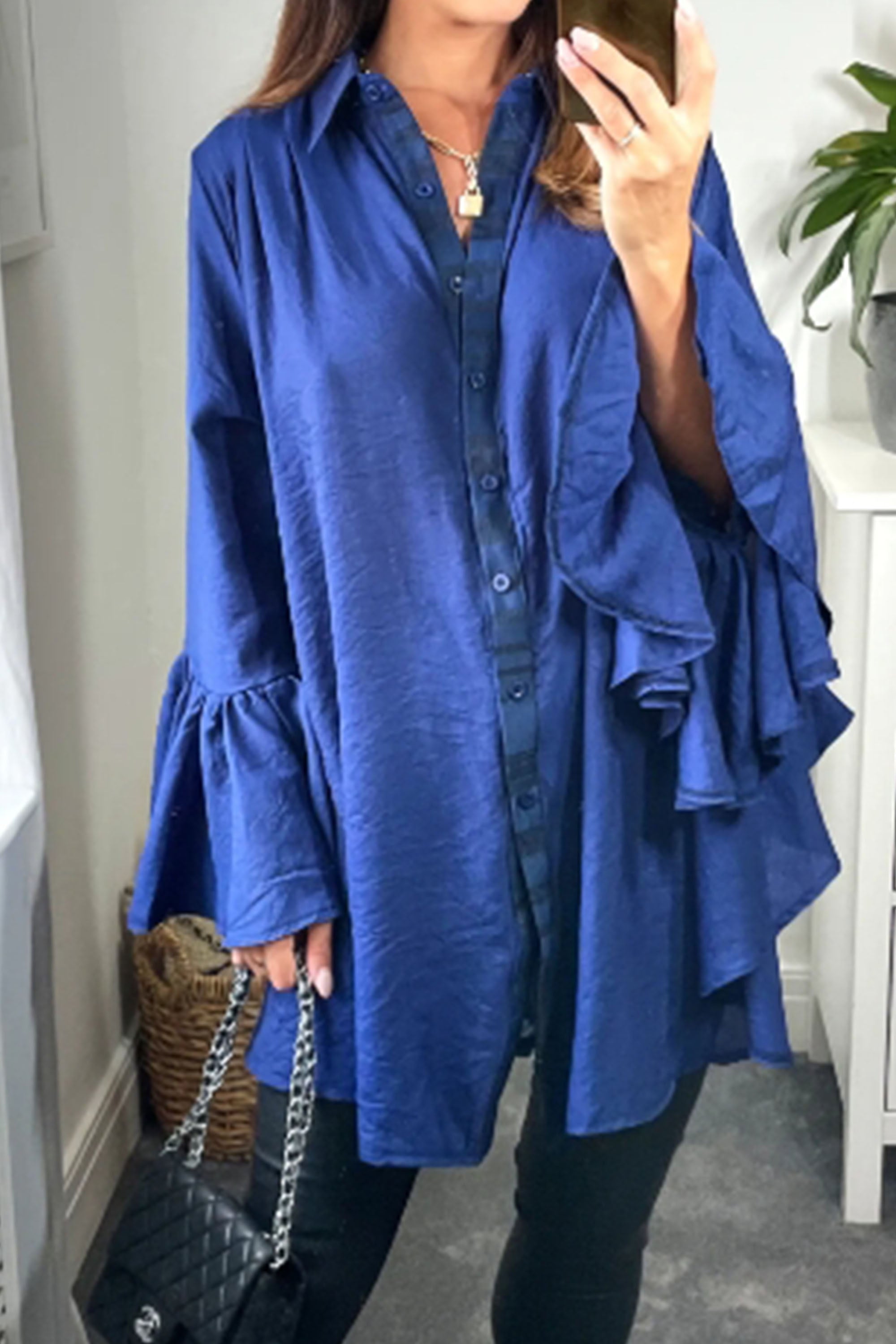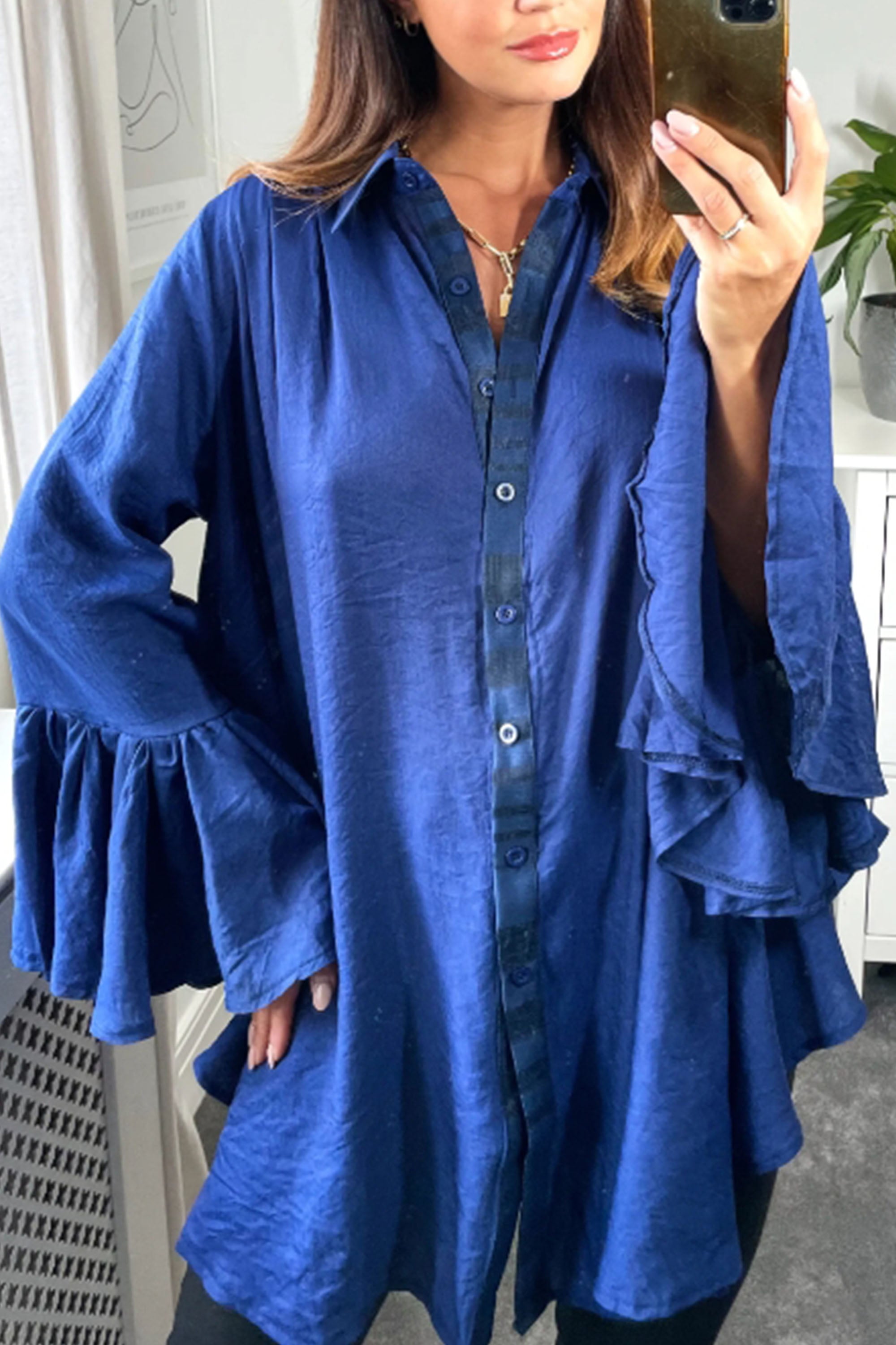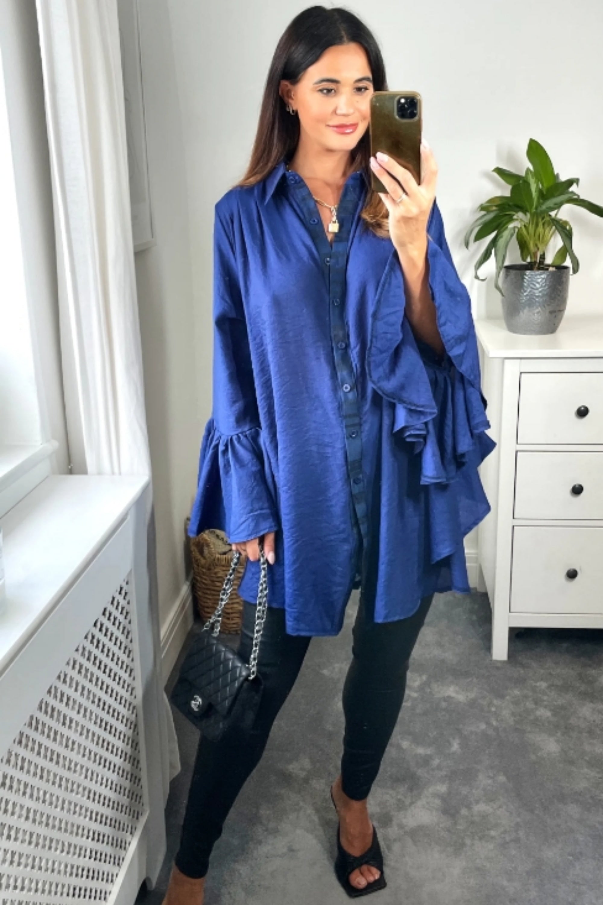 Oversized Shirt with Frilled Sleeves and Mesh Back in Blue