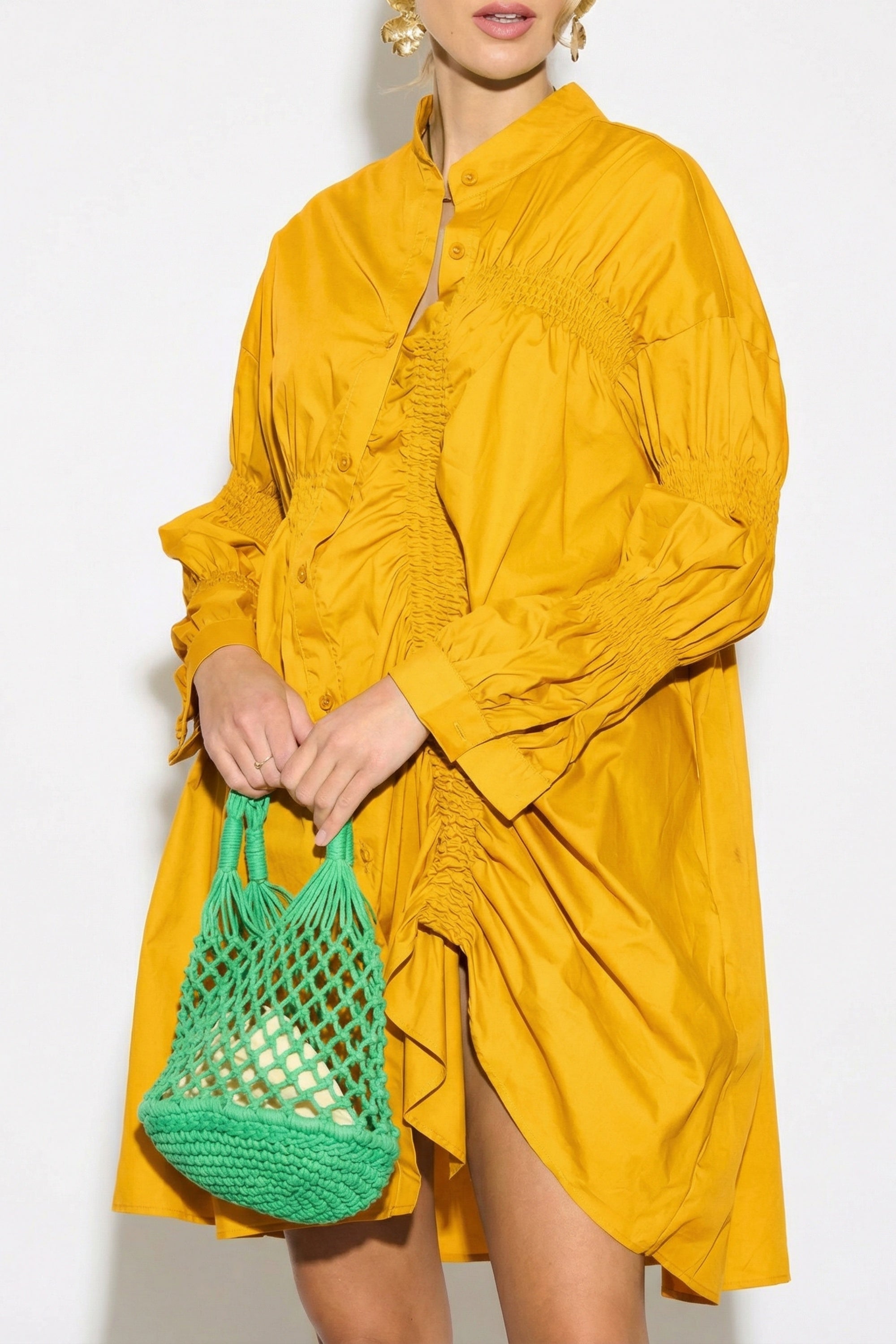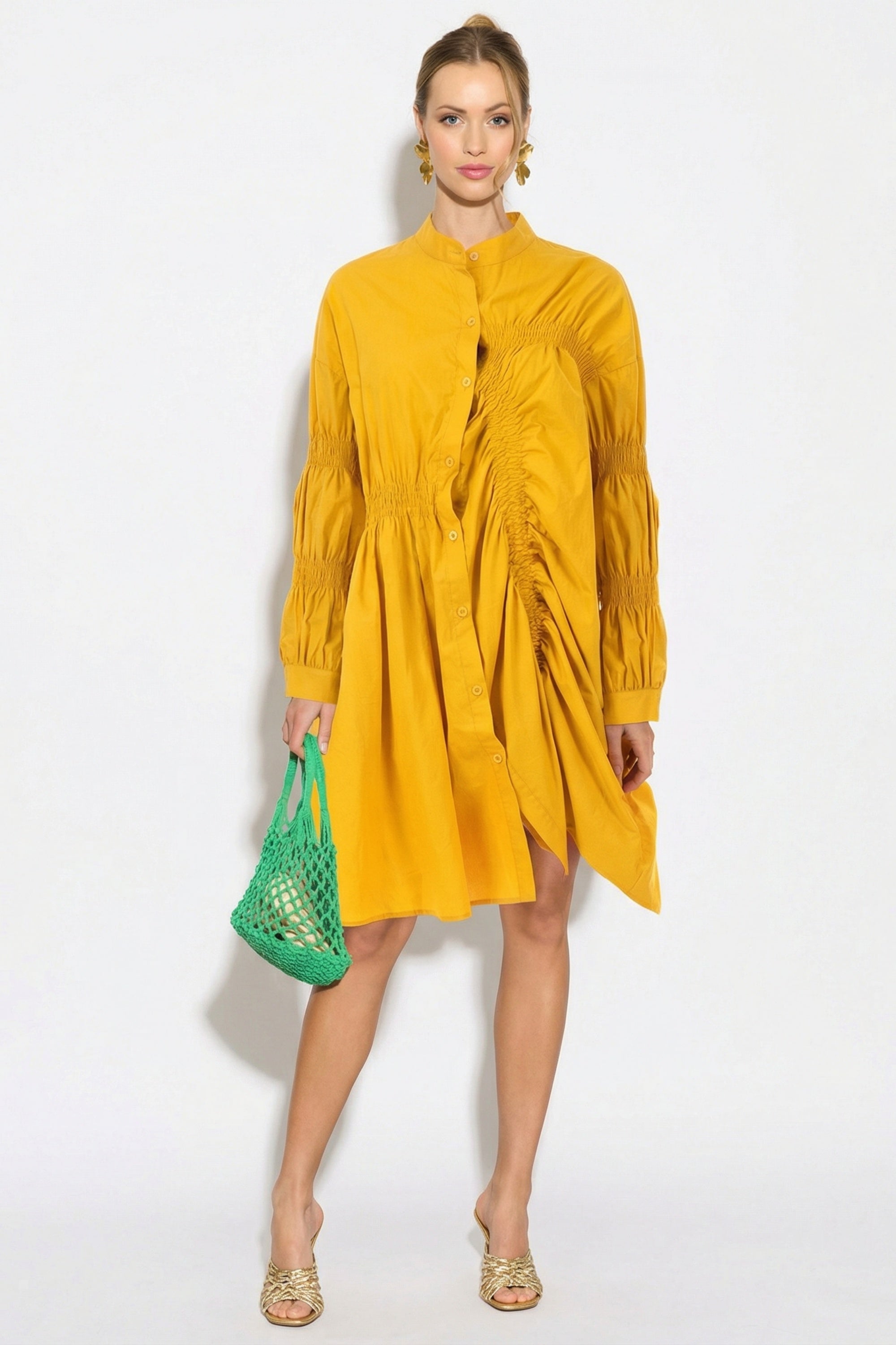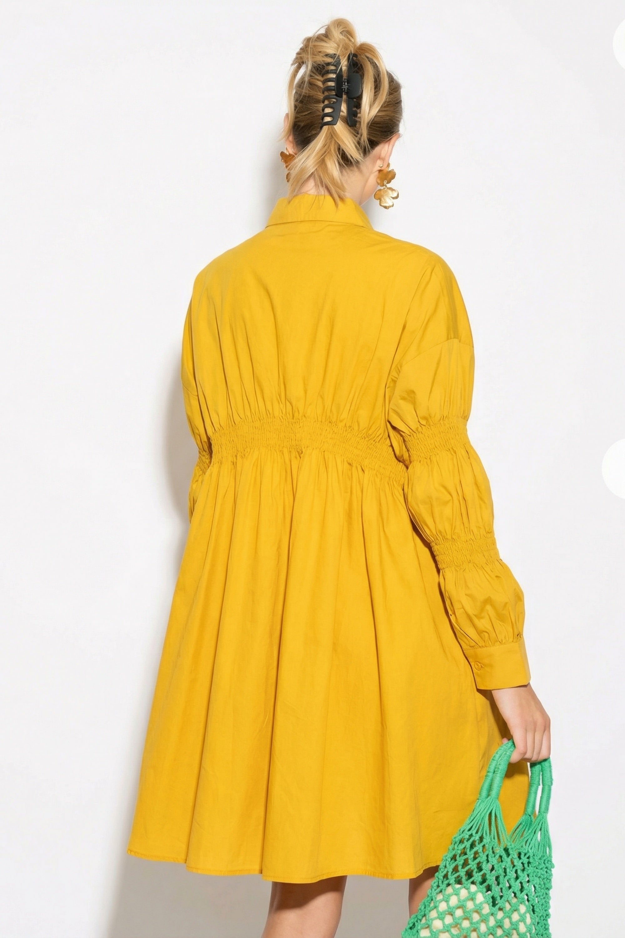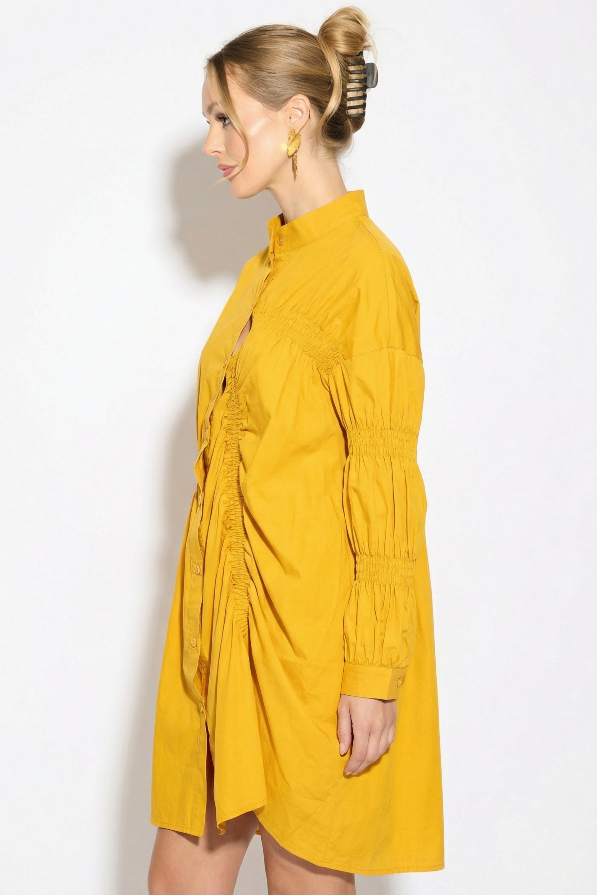 Asymmetry with Elasticated design cotton blend shirt dress in Yellow
