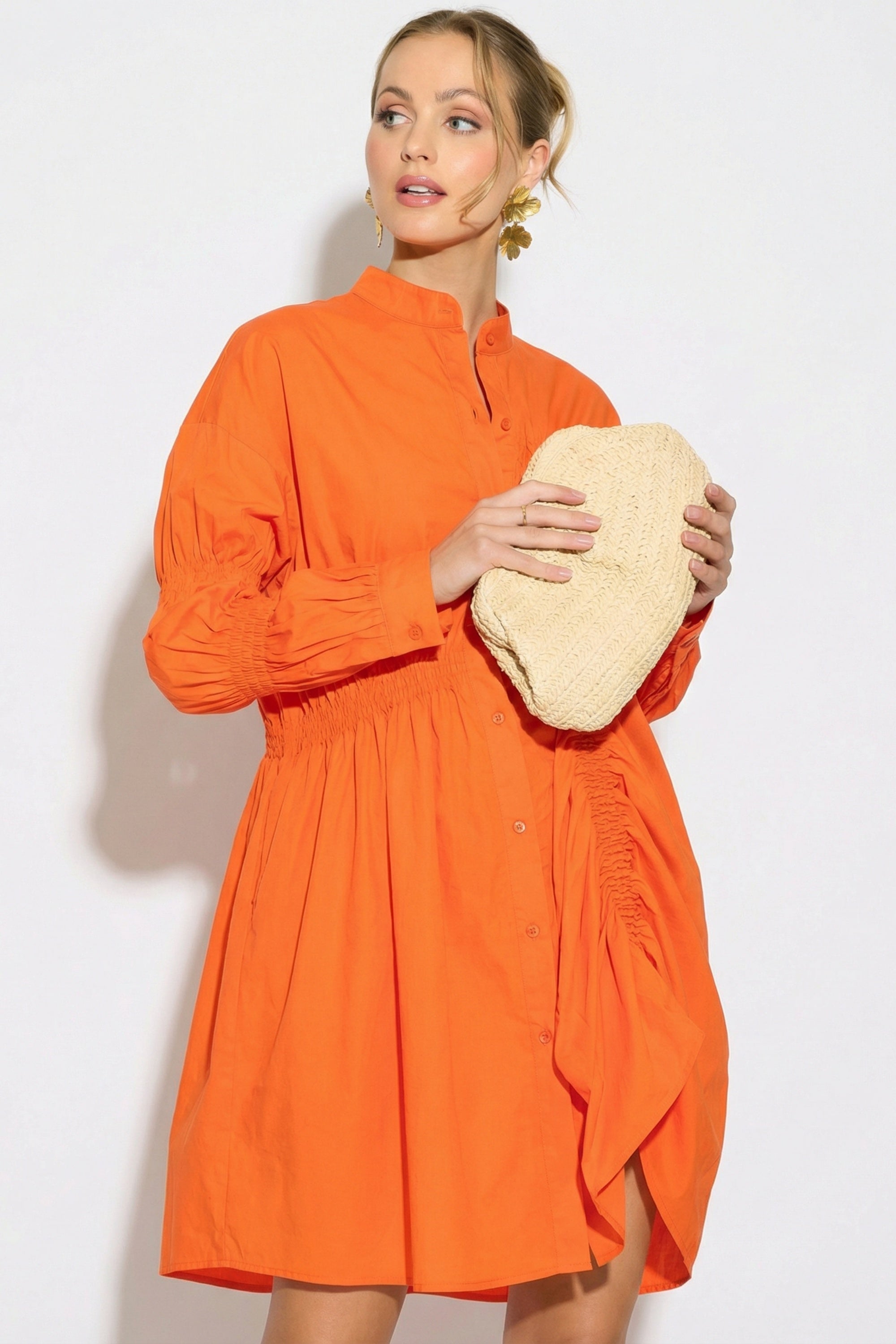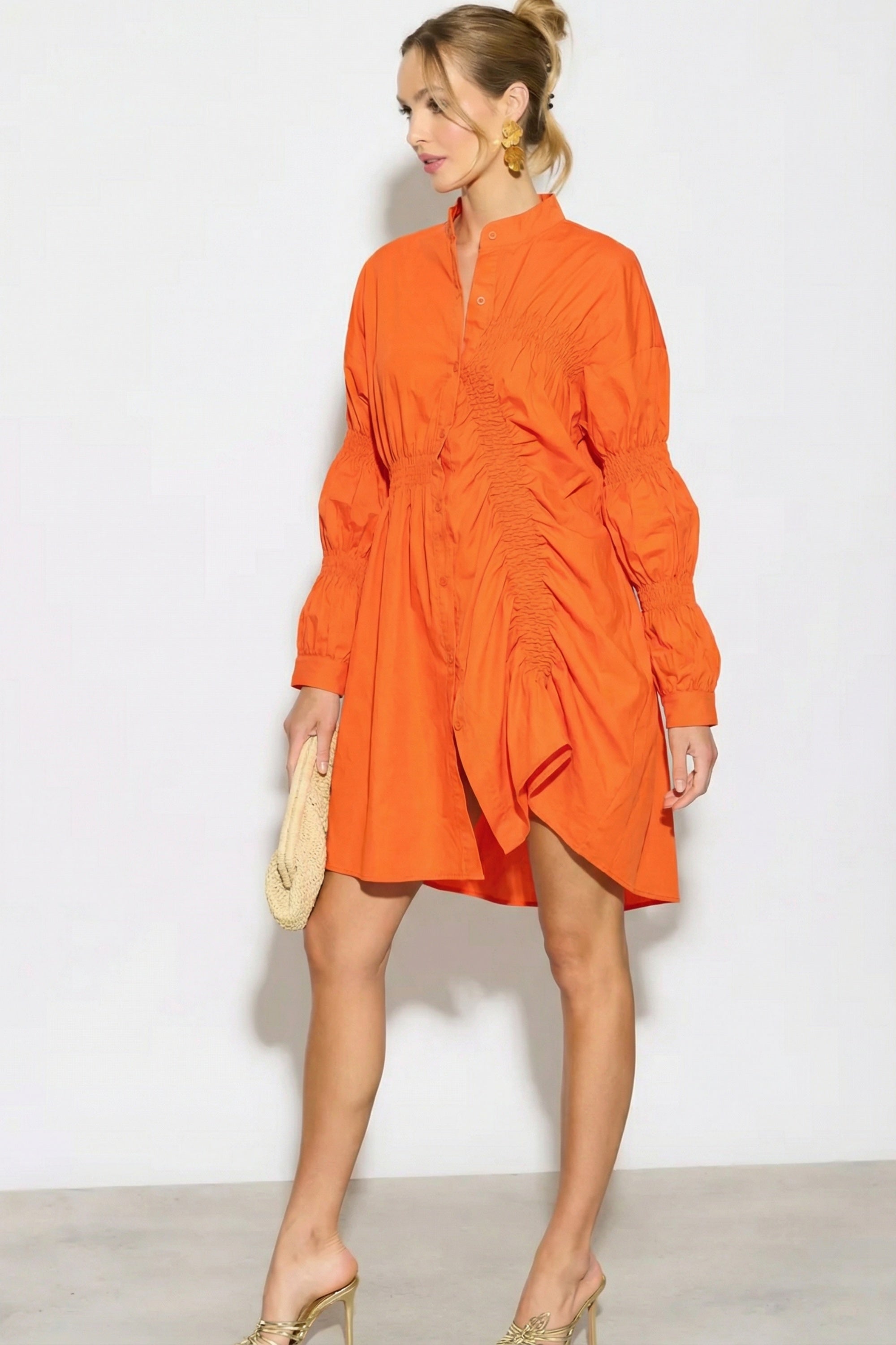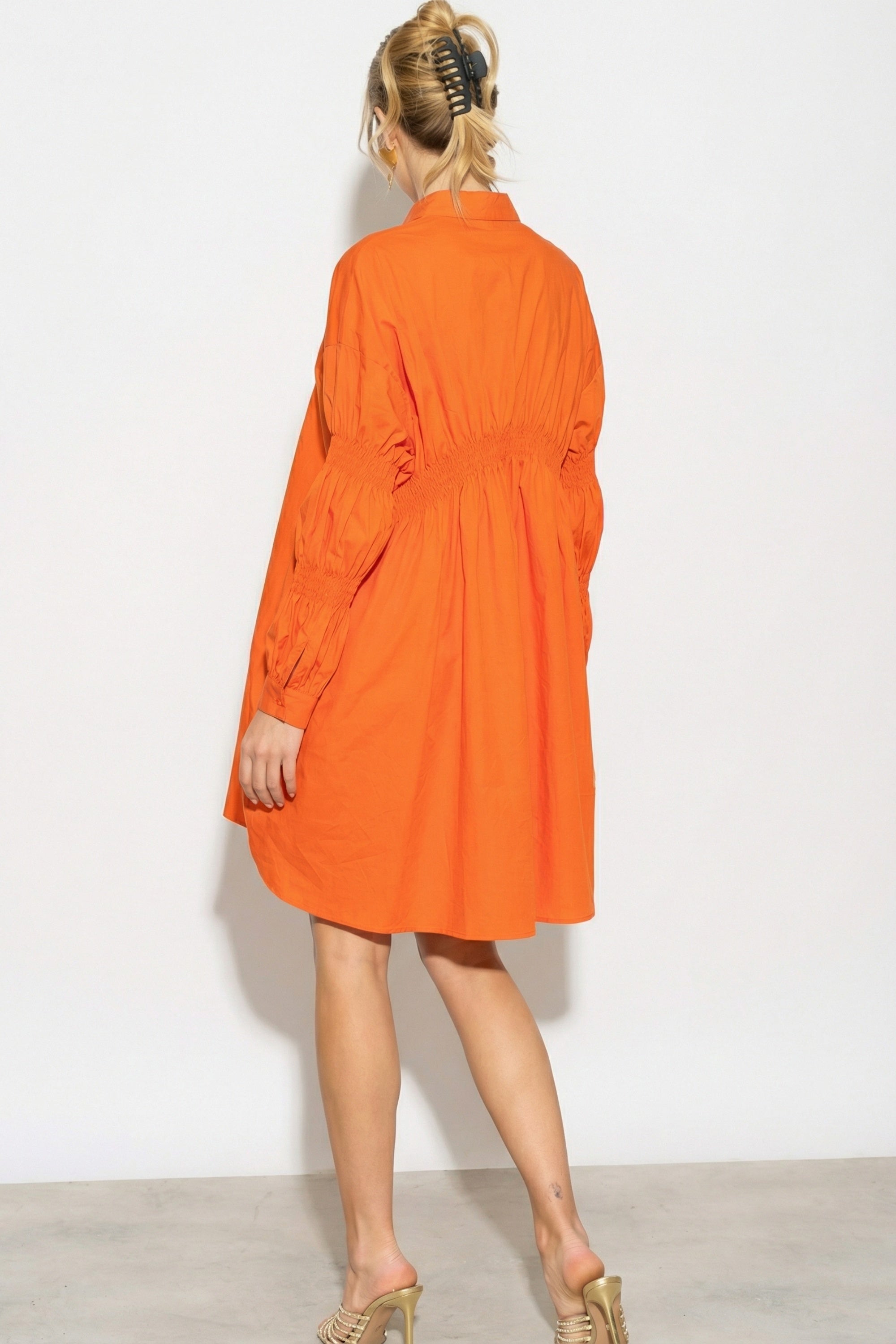Asymmetry with Elasticated design cotton blend shirt dress in Orange