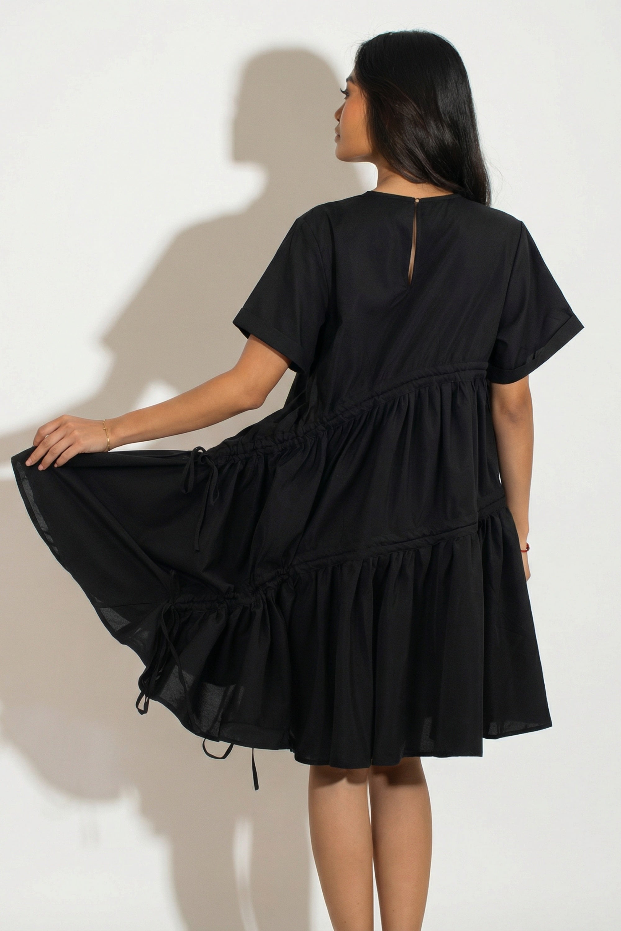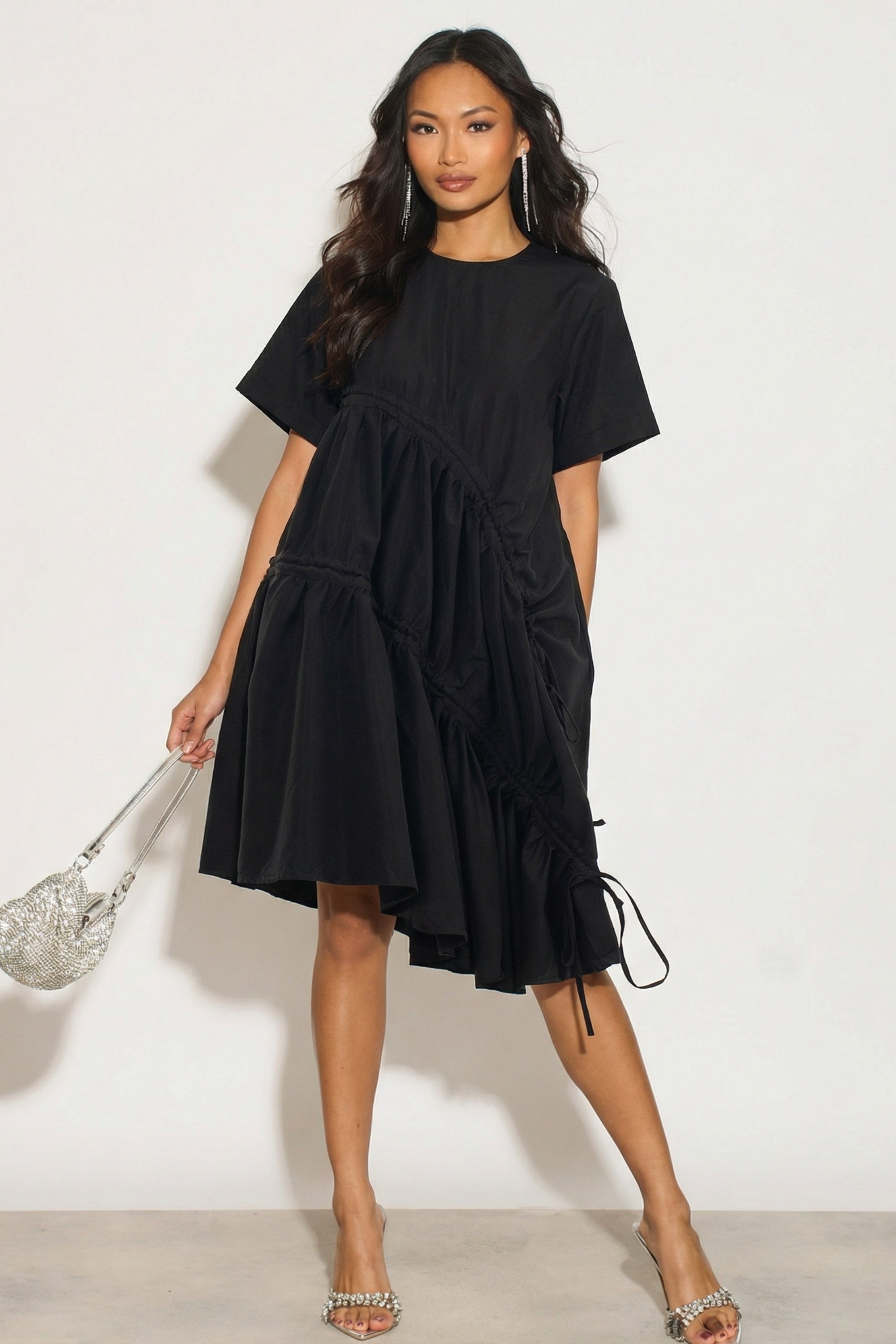 Asymmetry with adjustable ties design cotton blend dress in black
