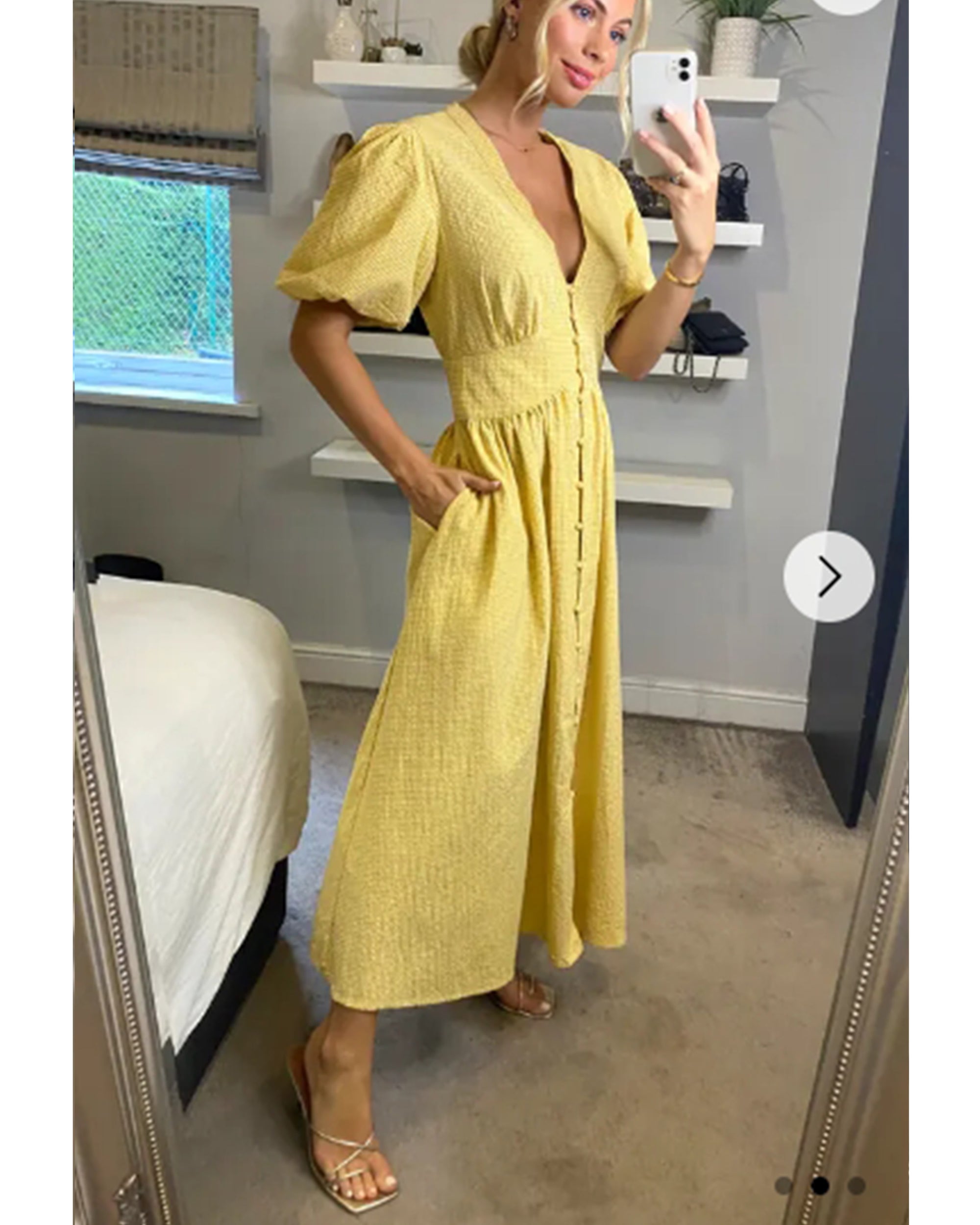 Check print Cotton Blend Puff sleeves midi dress in Yellow