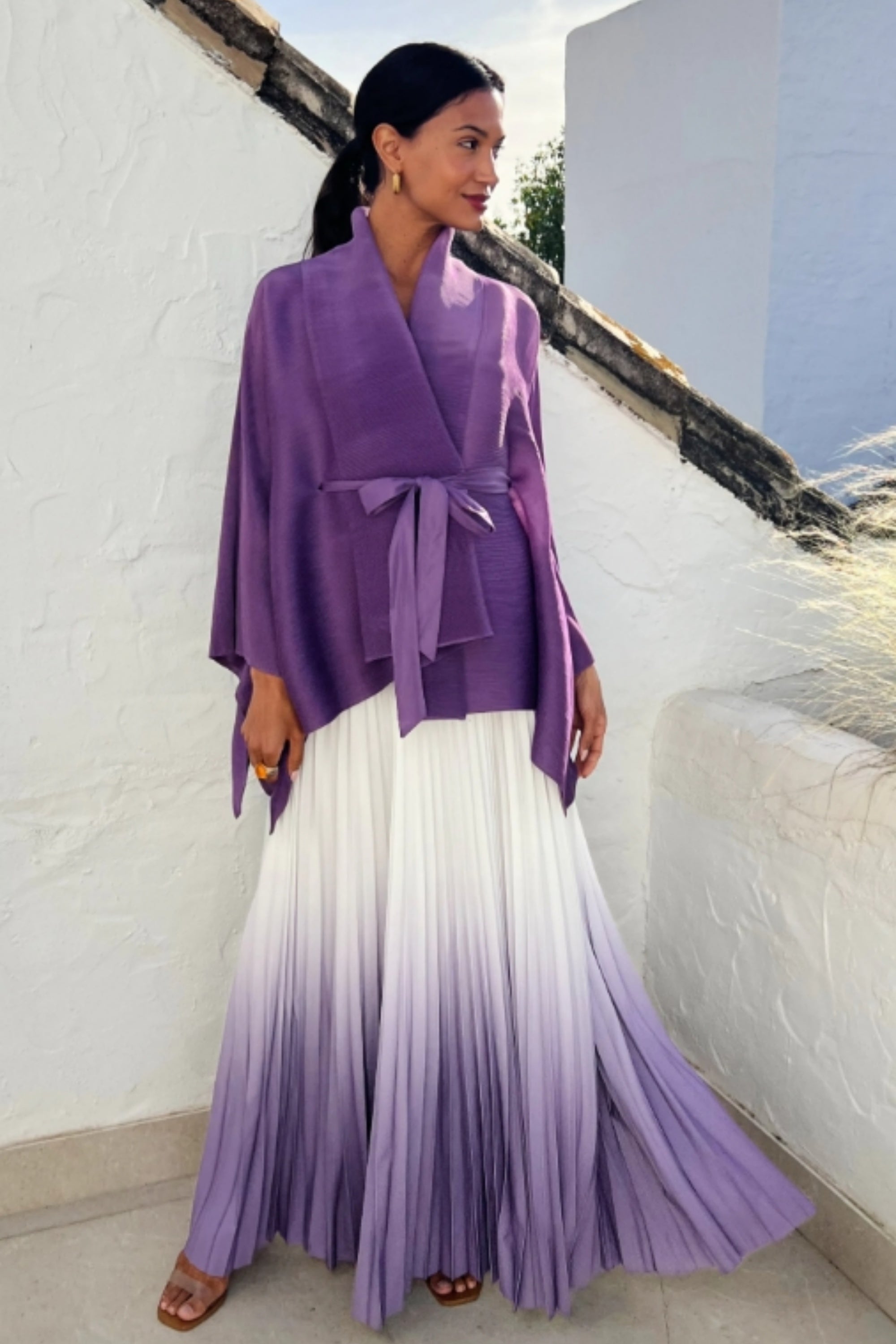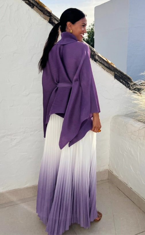 Full pleated Kimono sleeves cardigan top and tie dye print maxi skirt in purple