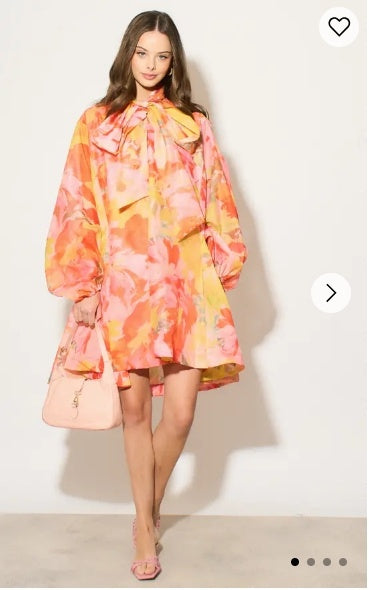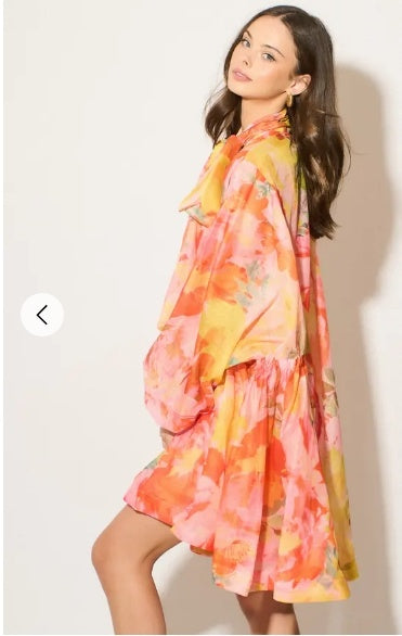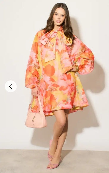 Oversized Pink Floral Print Billow Dress With Blouson Sleeves