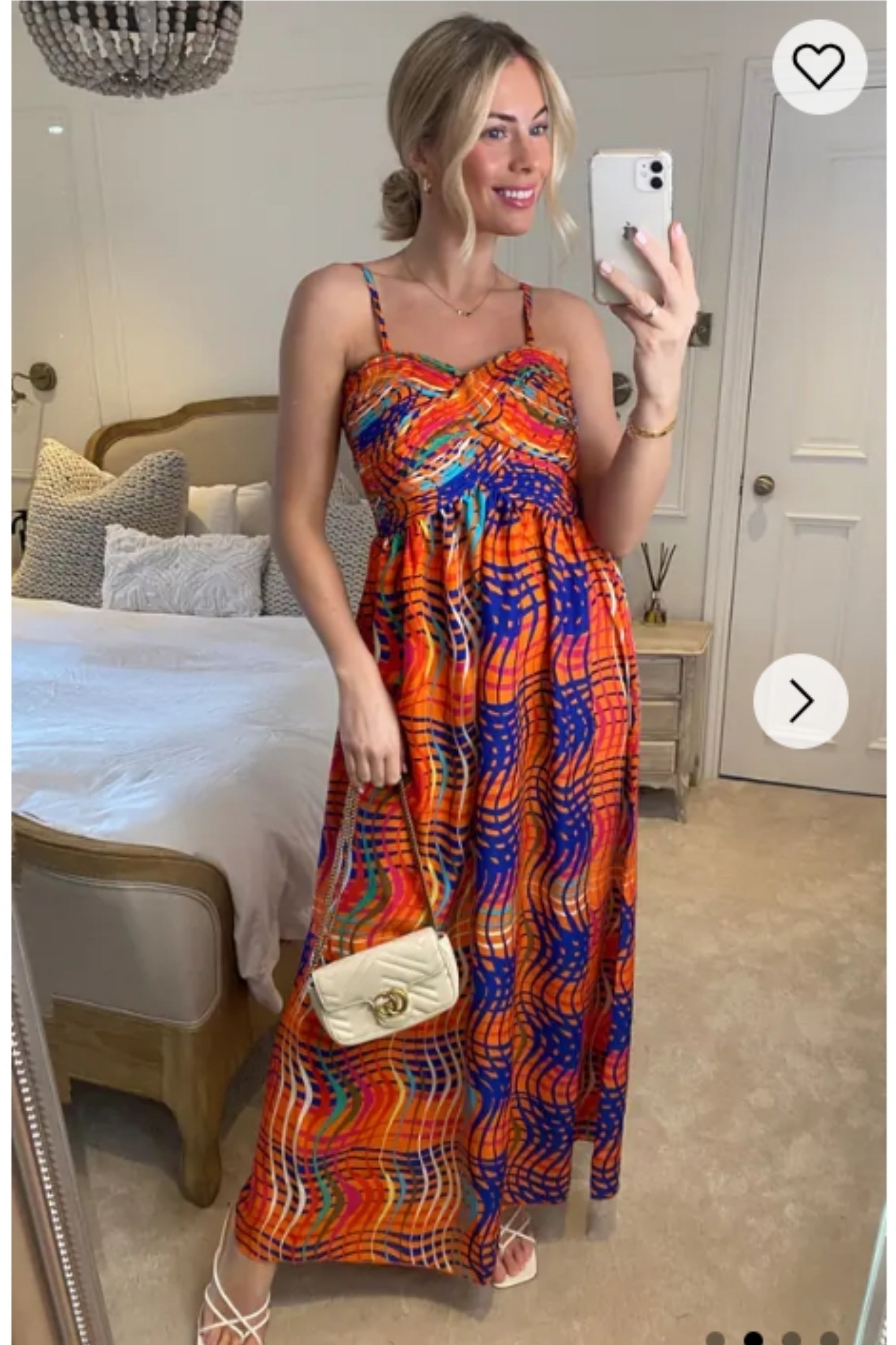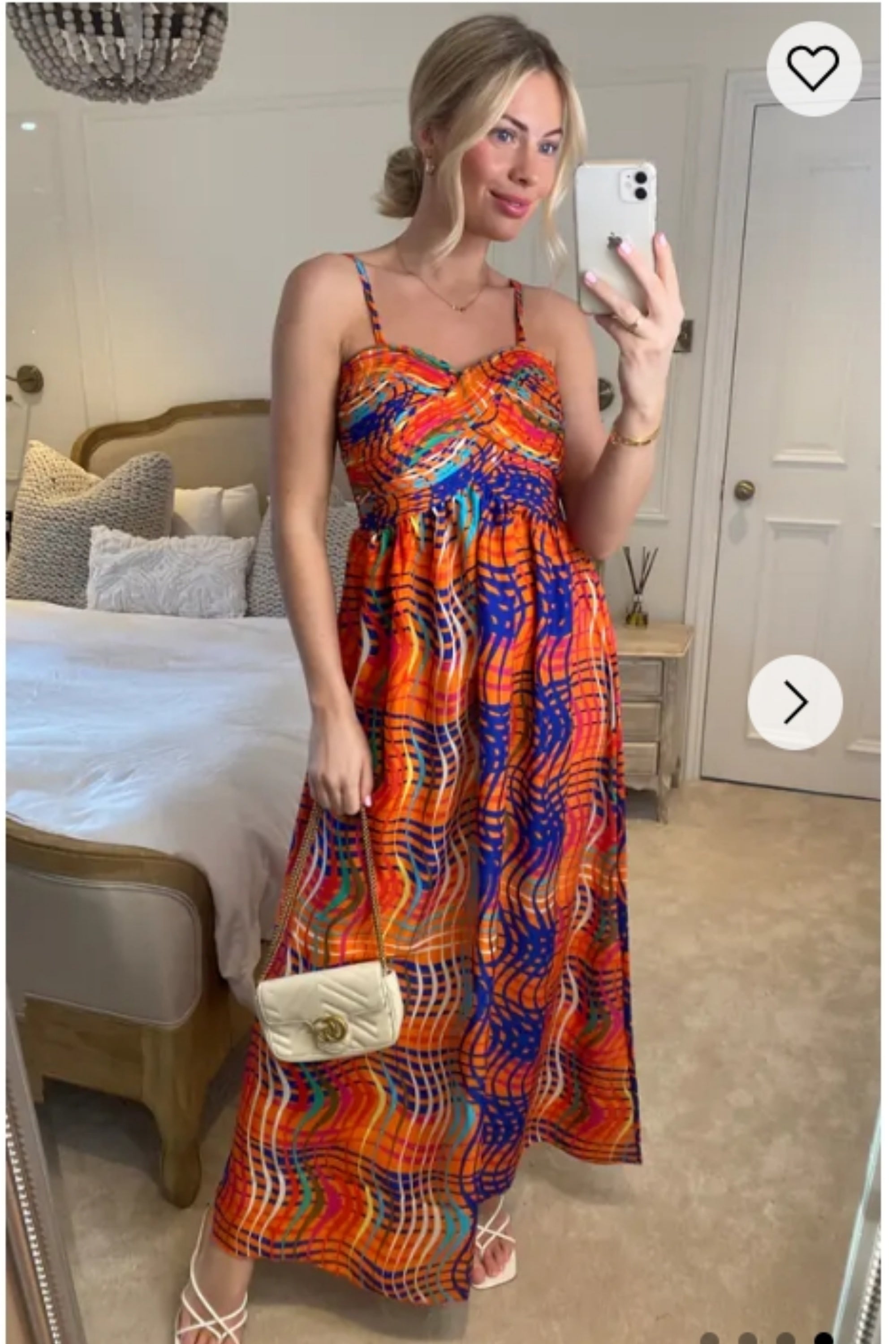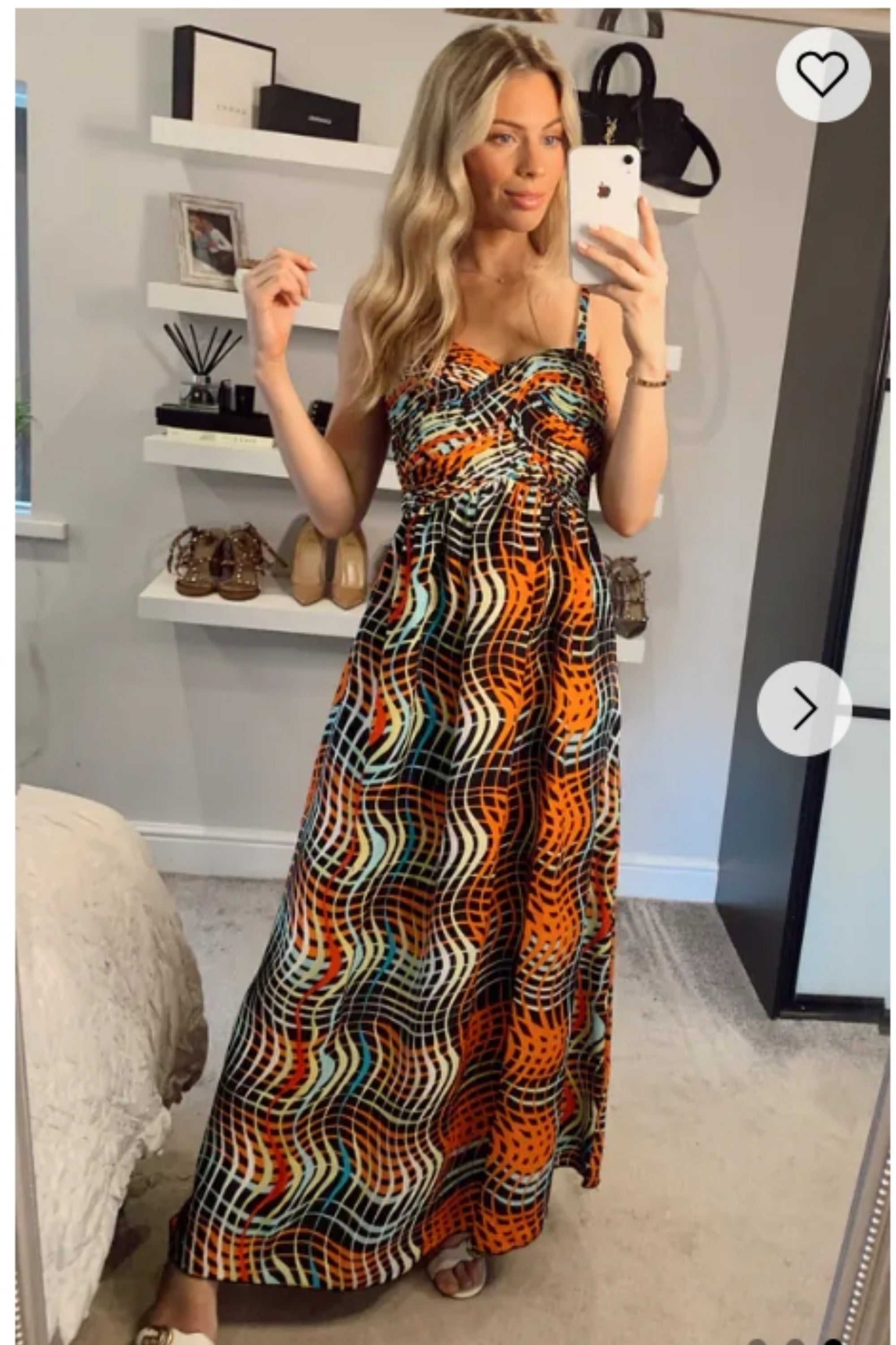 Peach Floral Print Chiffon Pleated Bust & Sweetheart Neckline Maxi Dress
