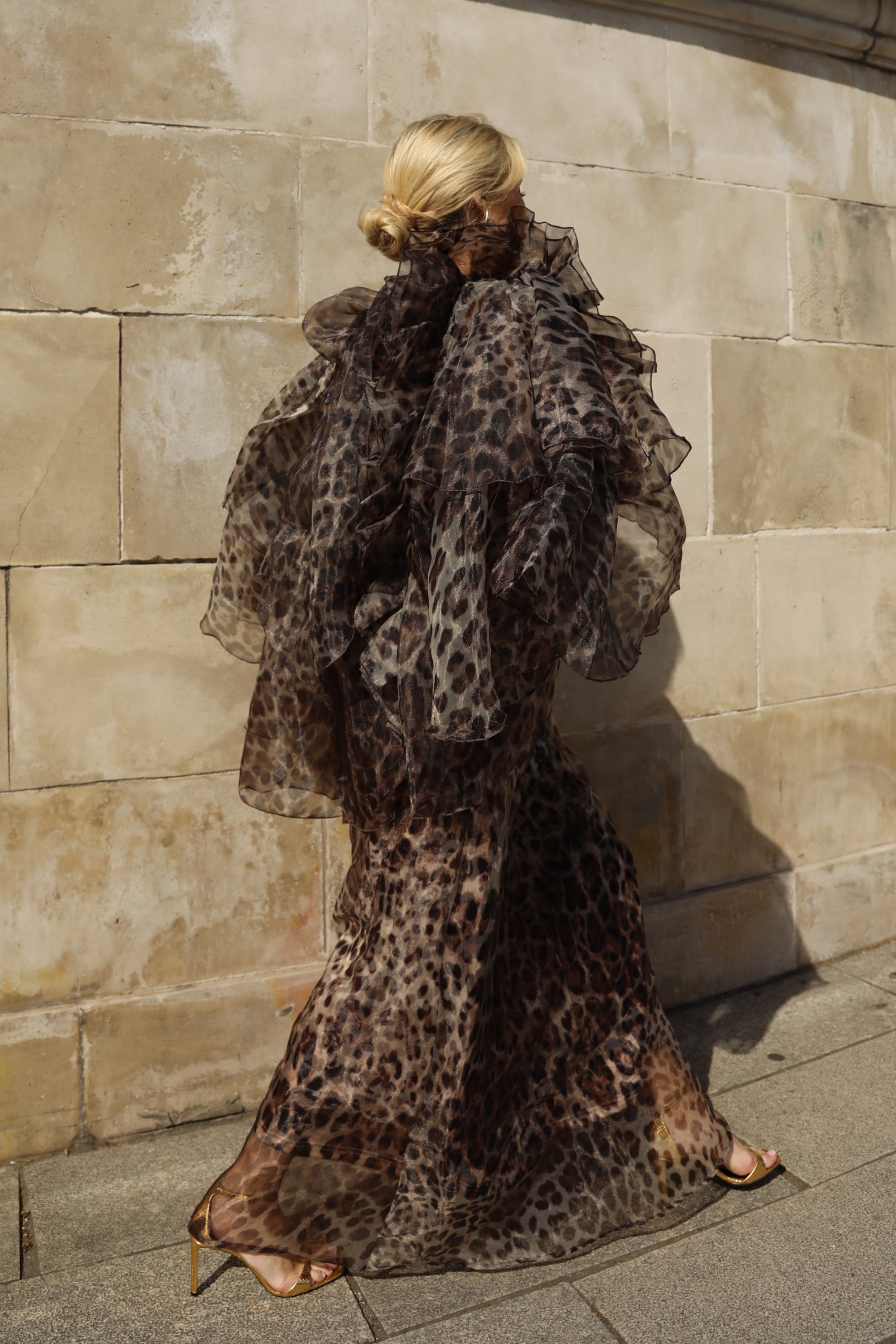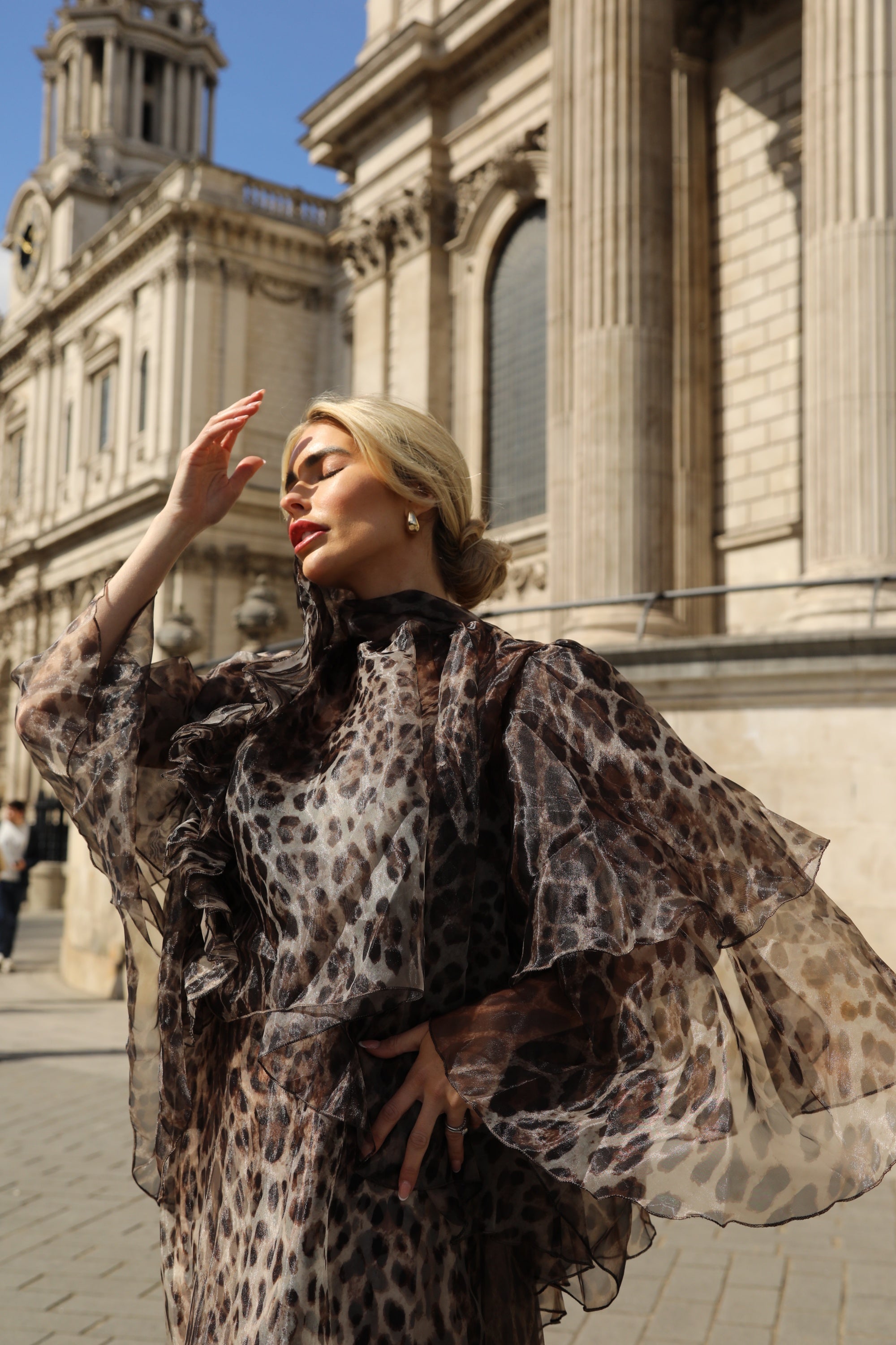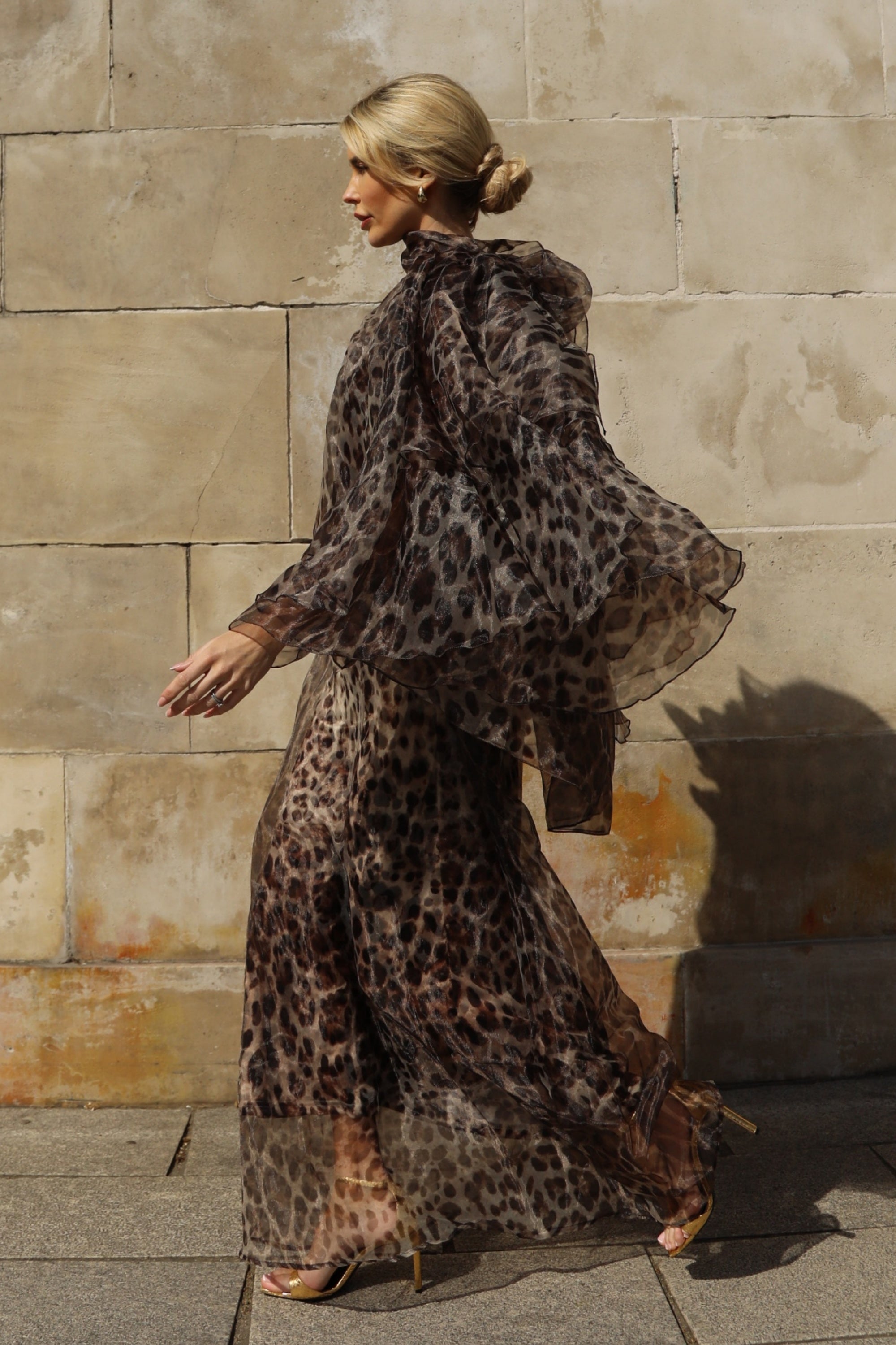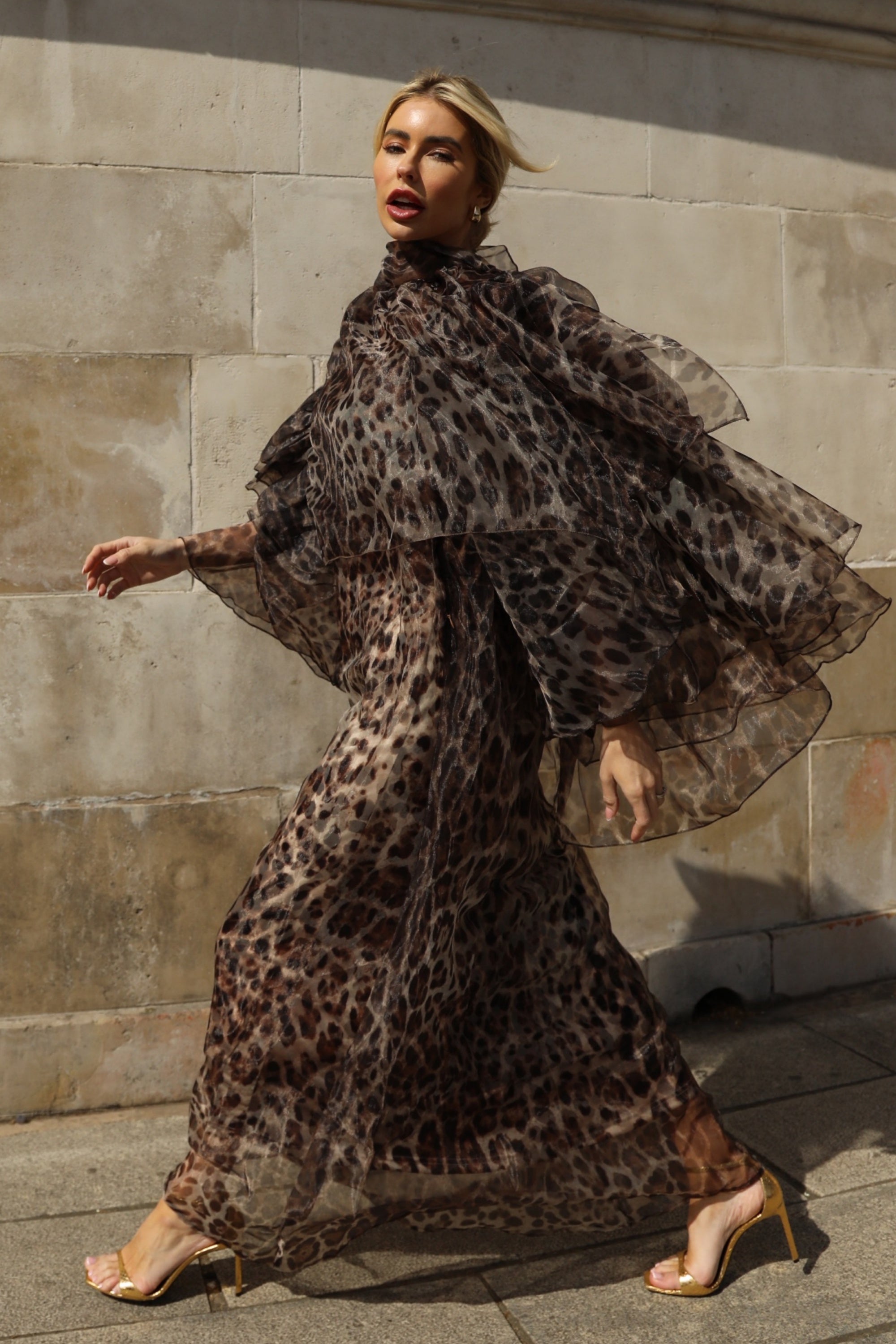 Leopard Print Organza Ruffle Statement Maxi Dress