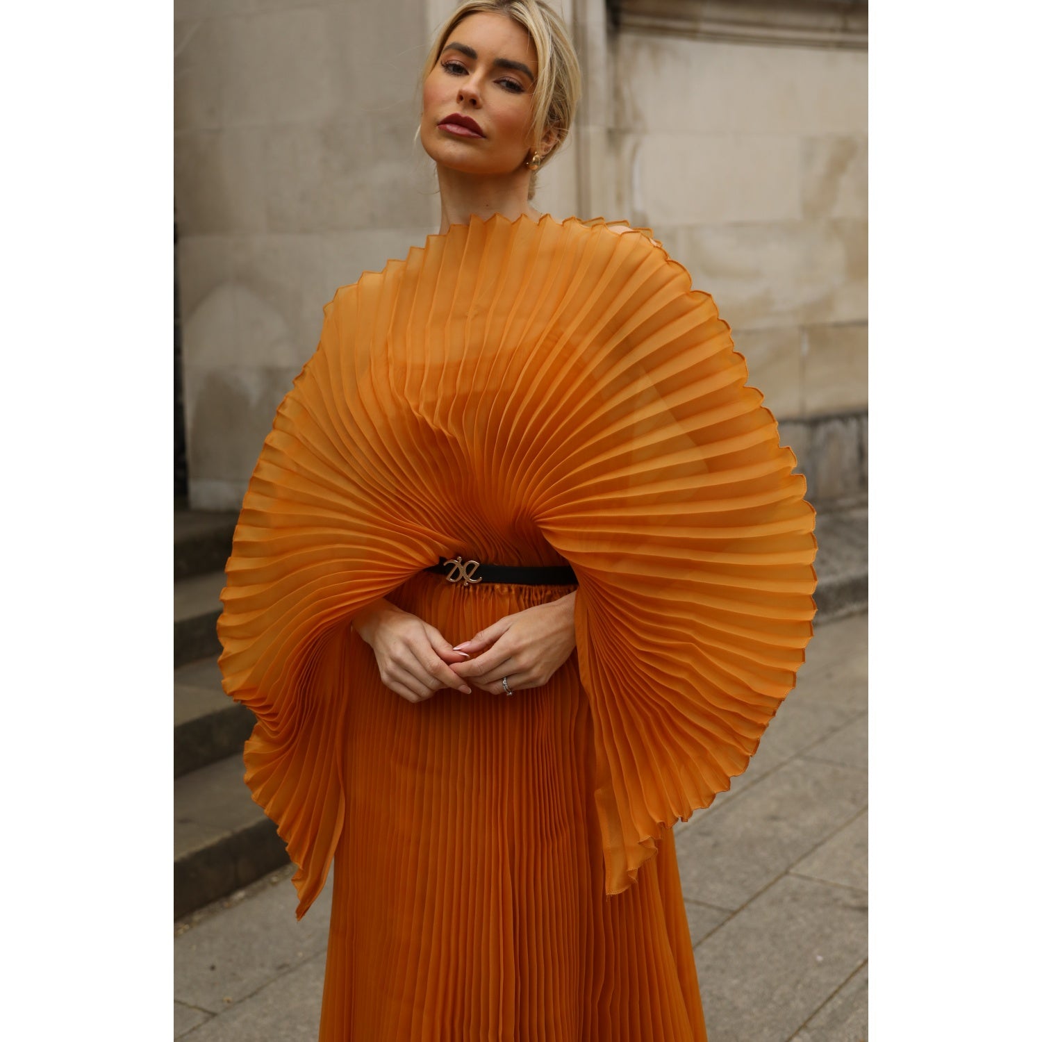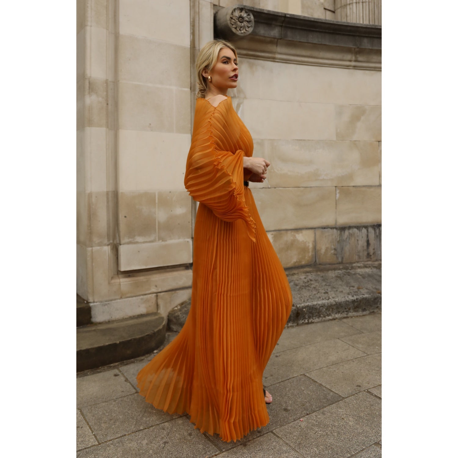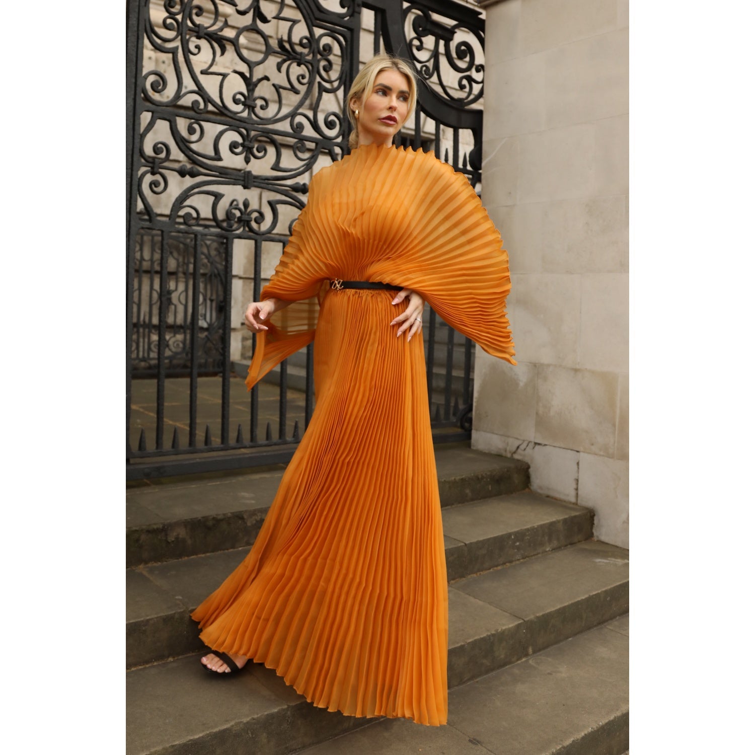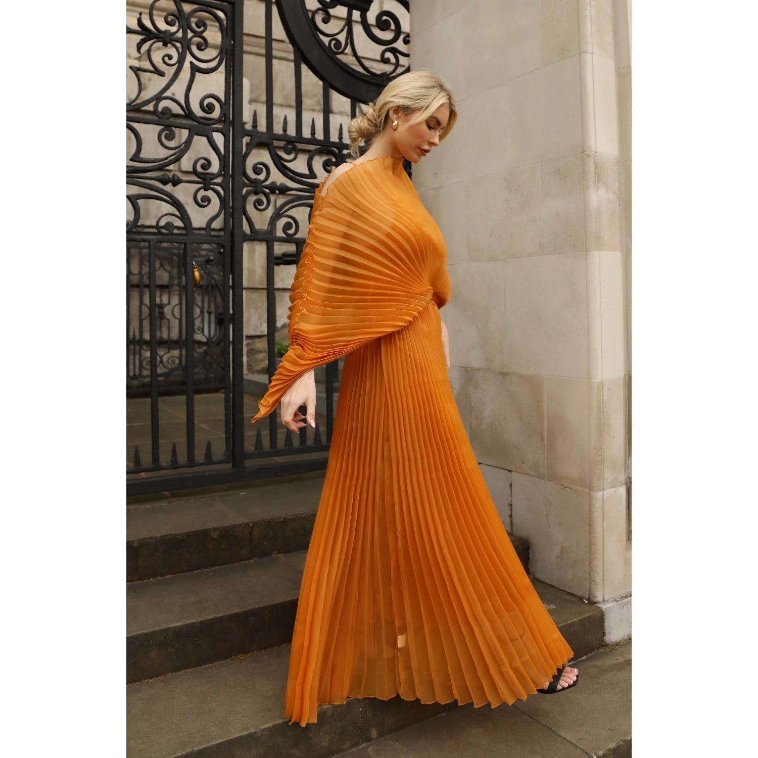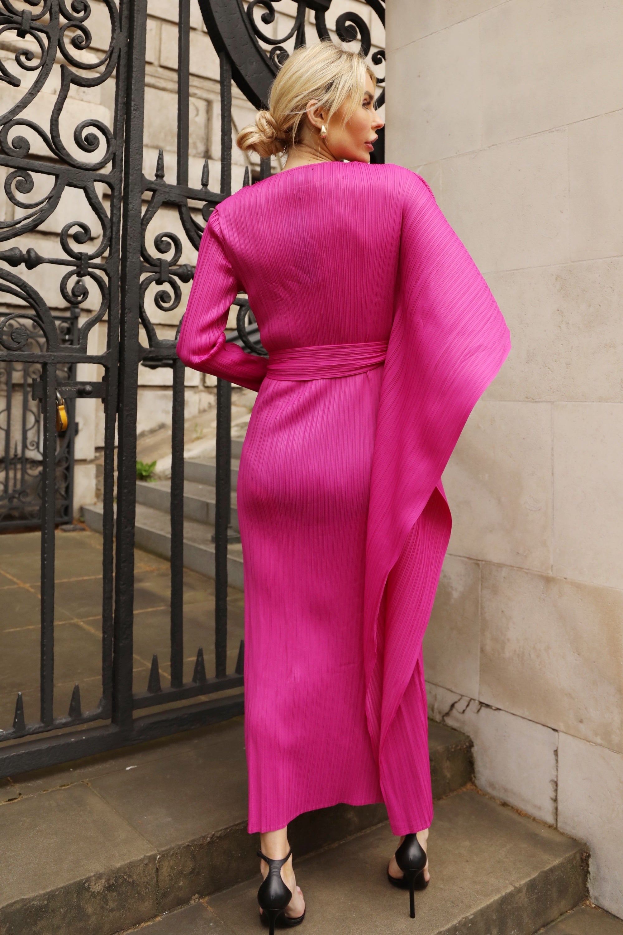 Pleated long dress with organza pleated cape sleeves in Hot Pink