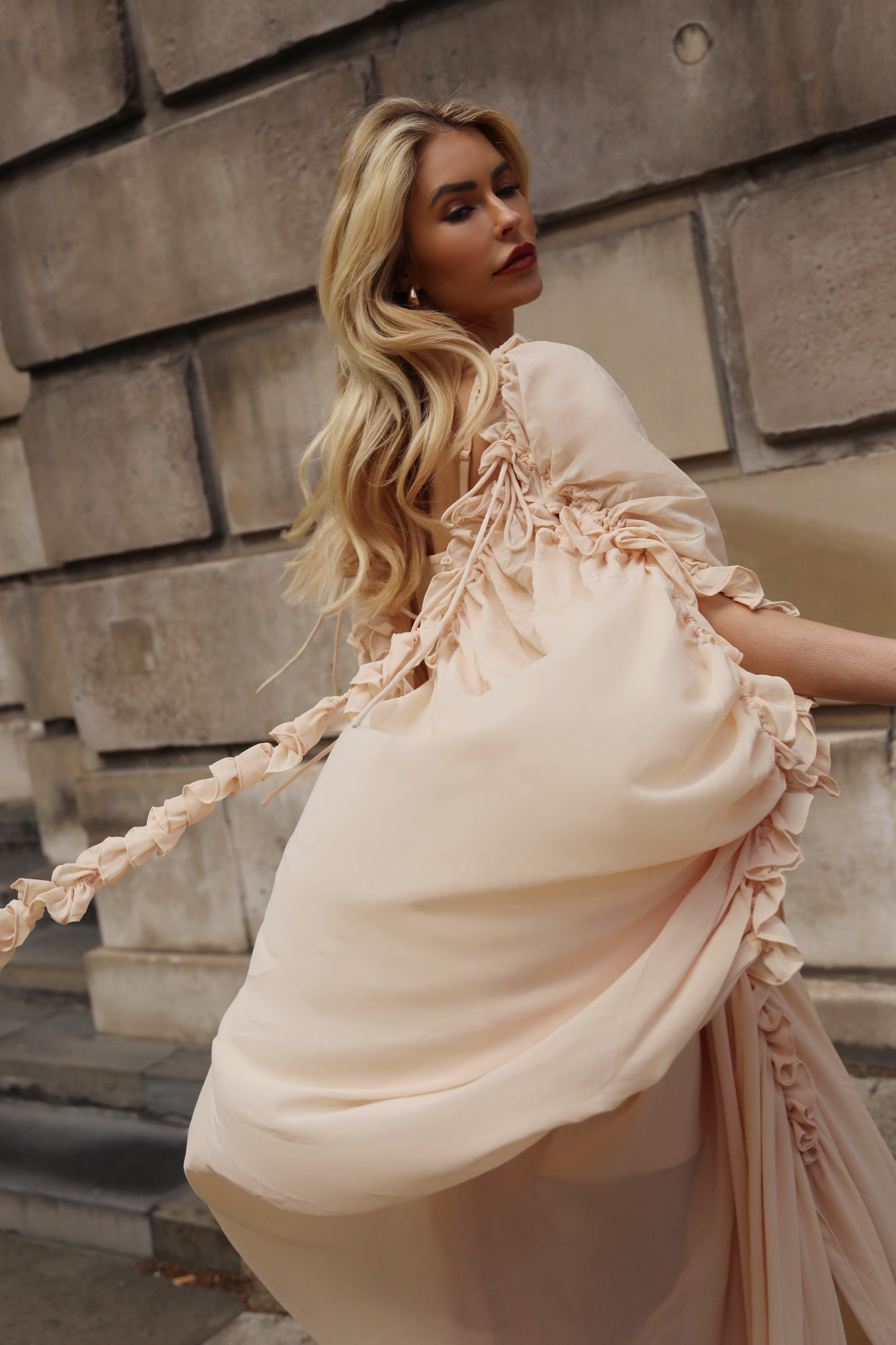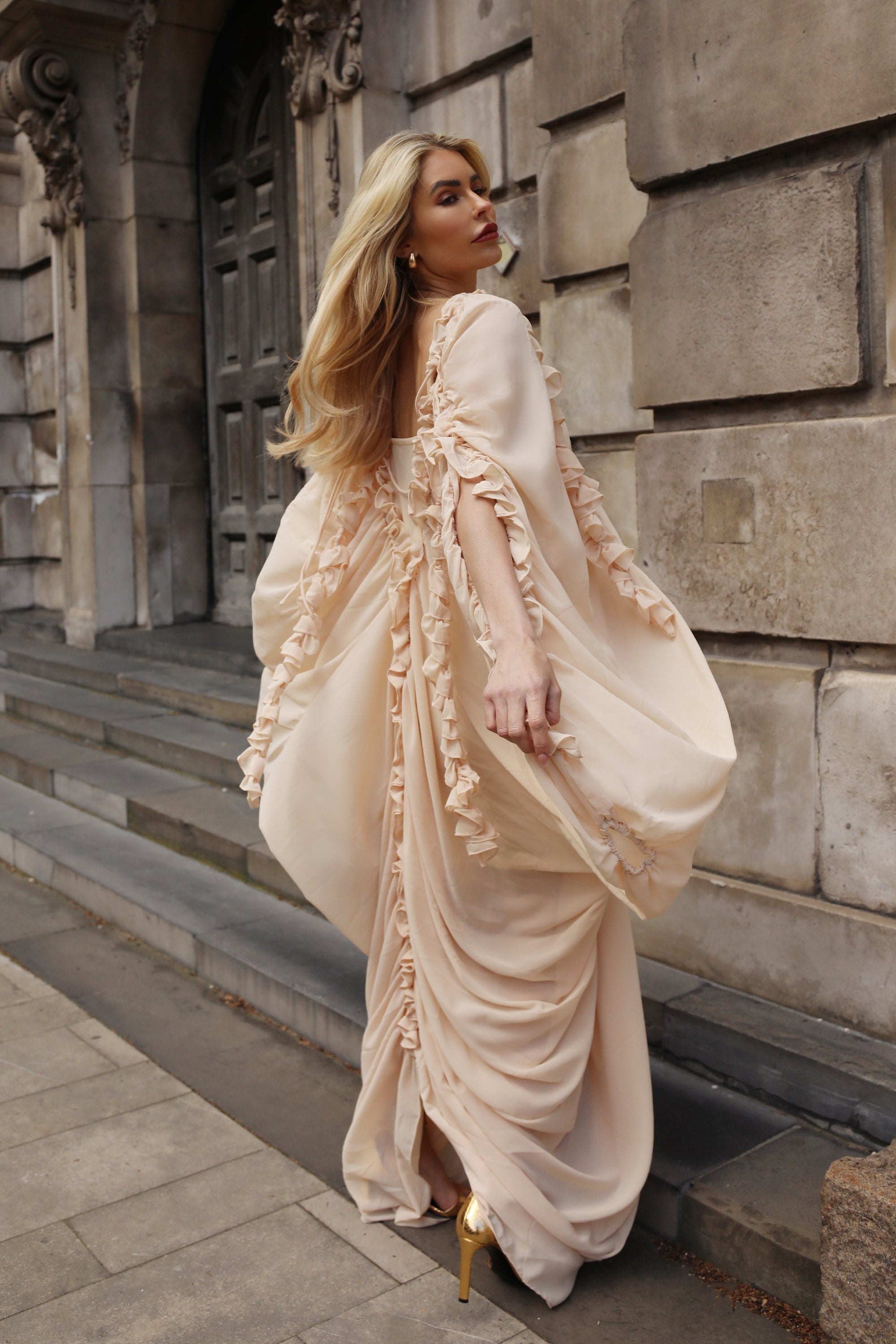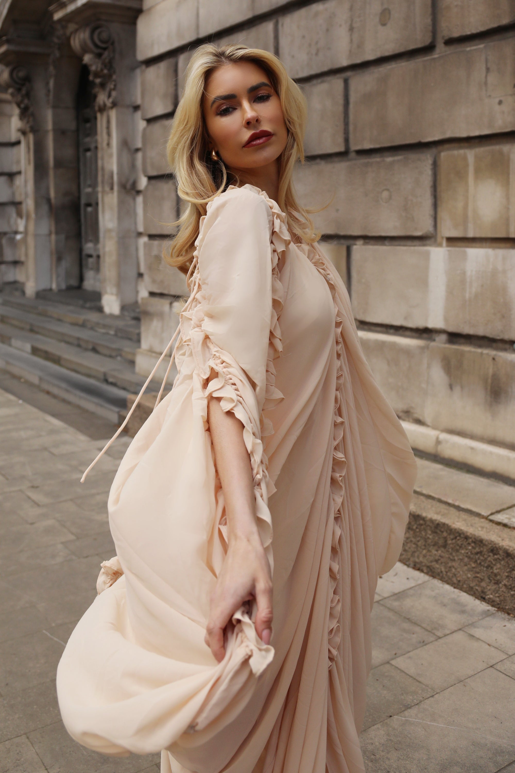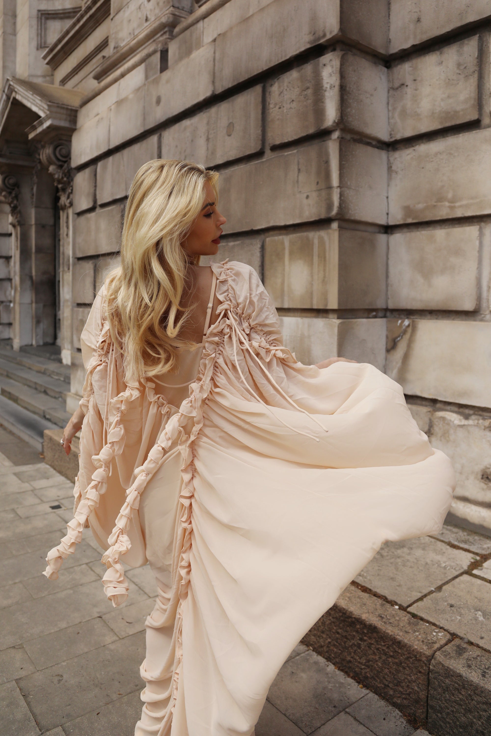 Pleated long dress with organza pleated cape sleeves in Light Pink