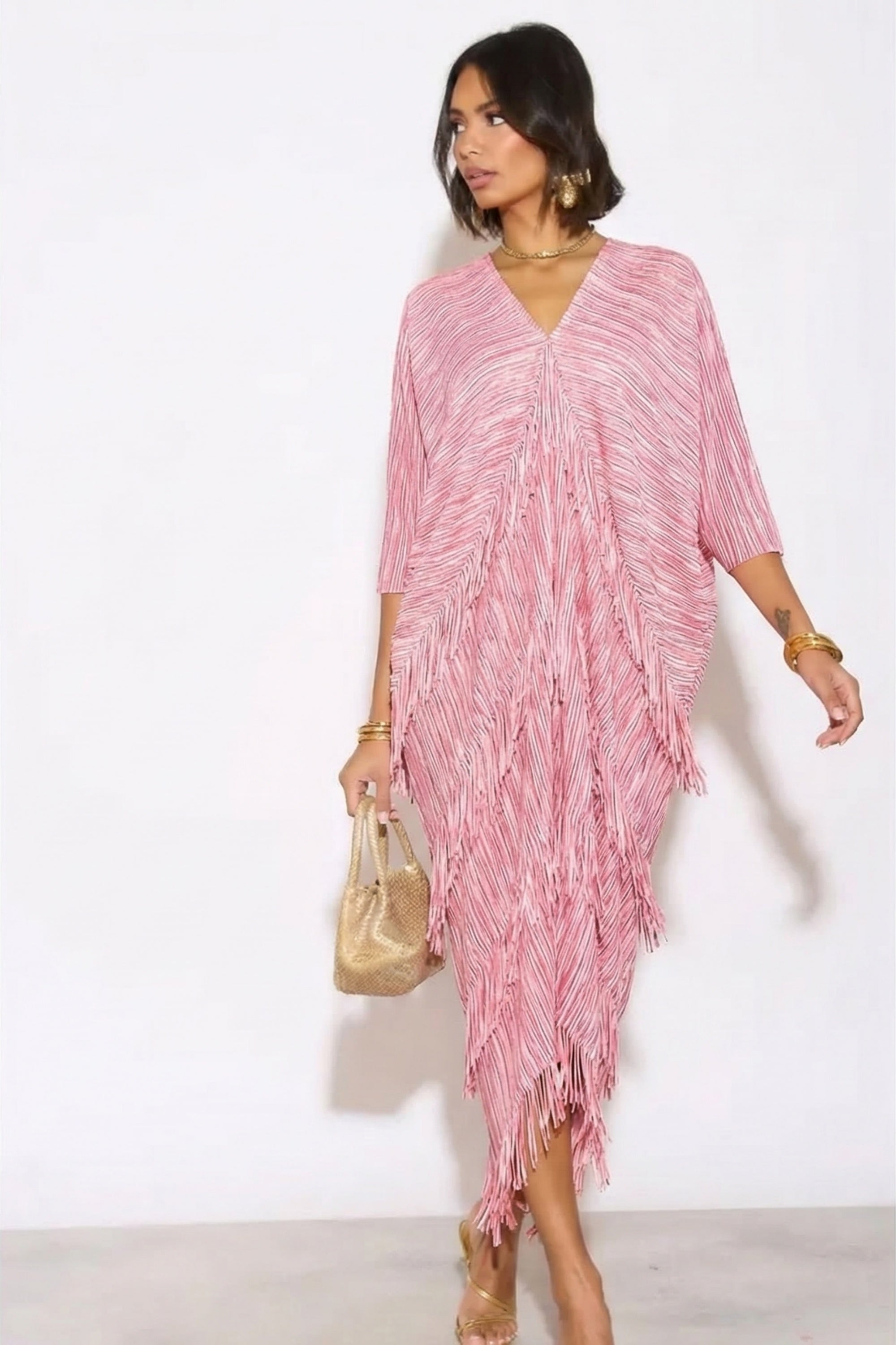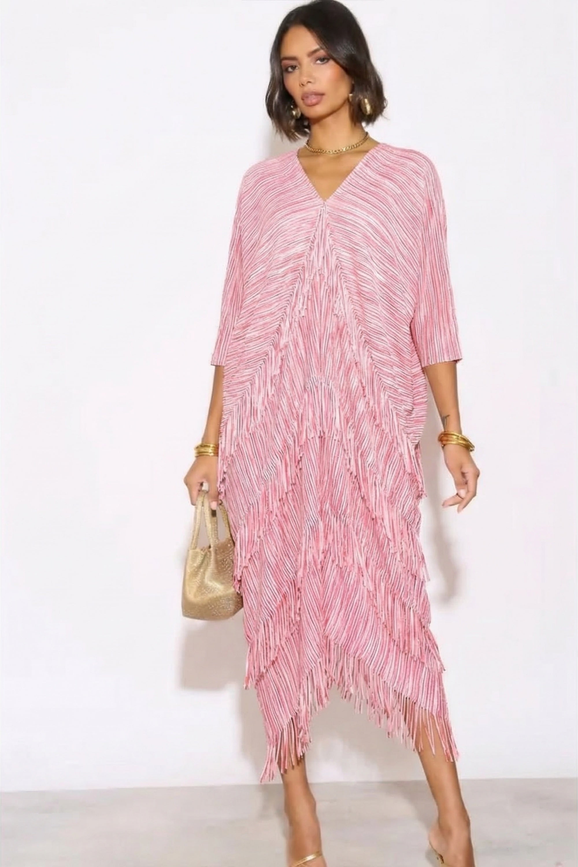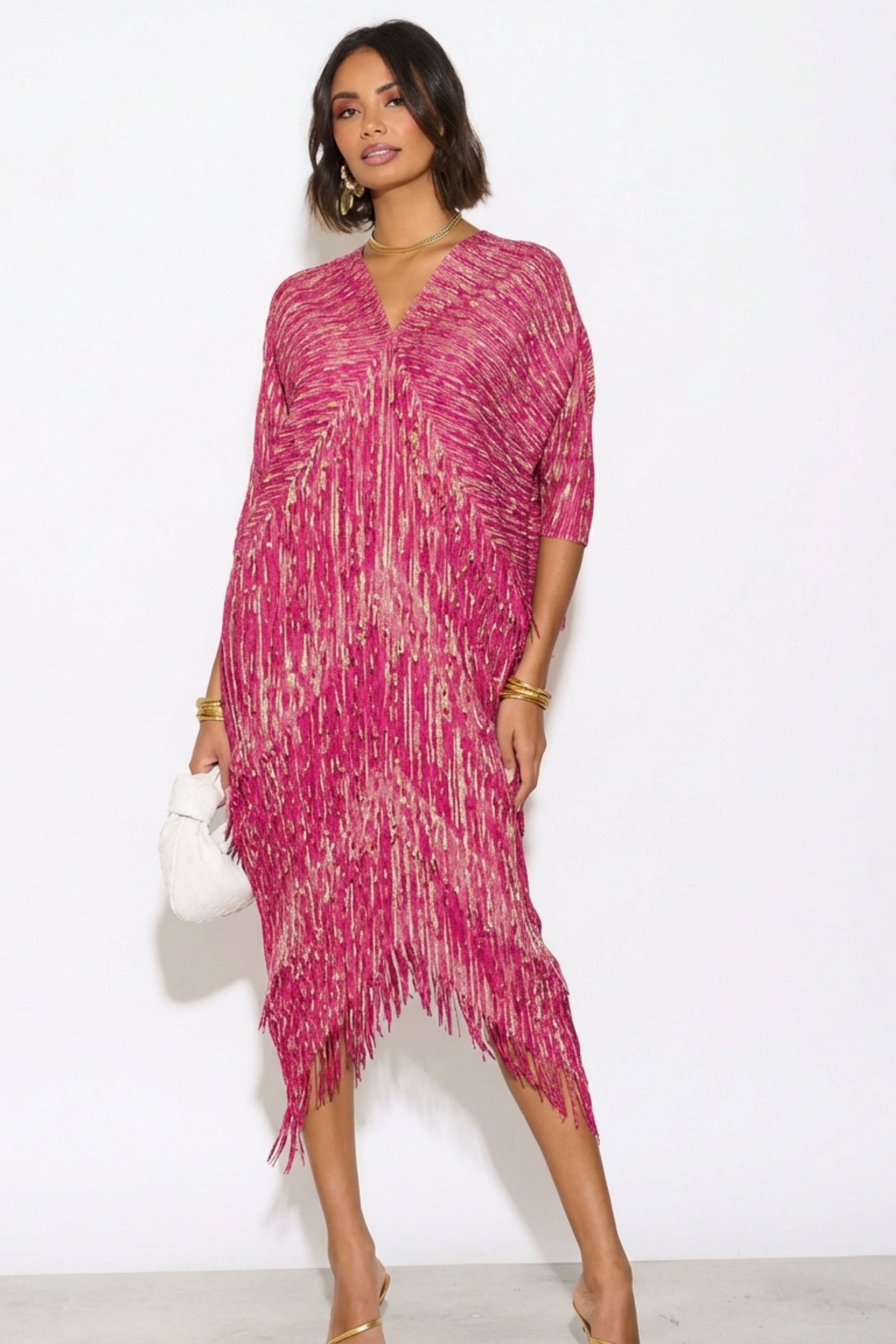 Layers Multi Fringed Tassel Pleated Midi Dress in Pink