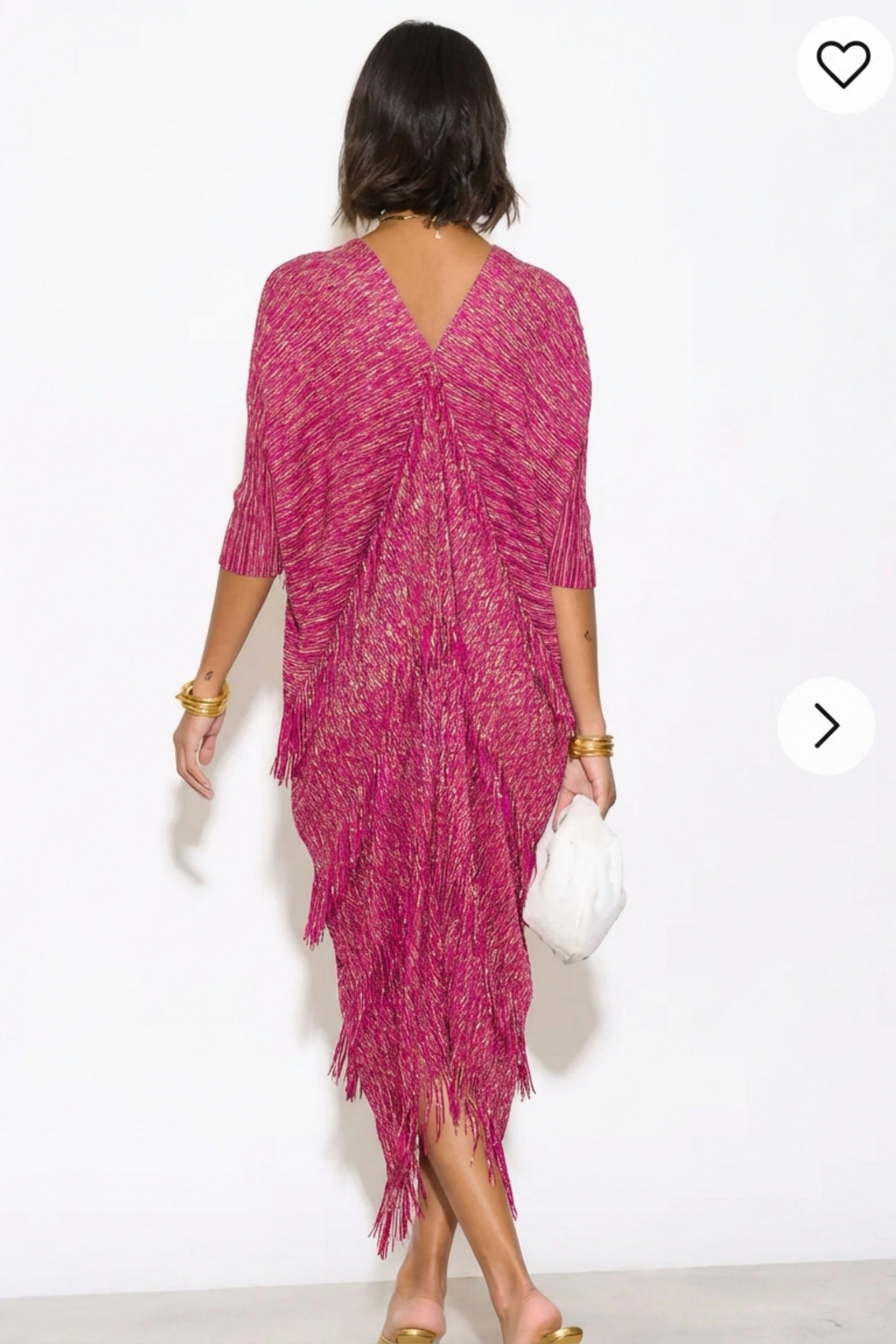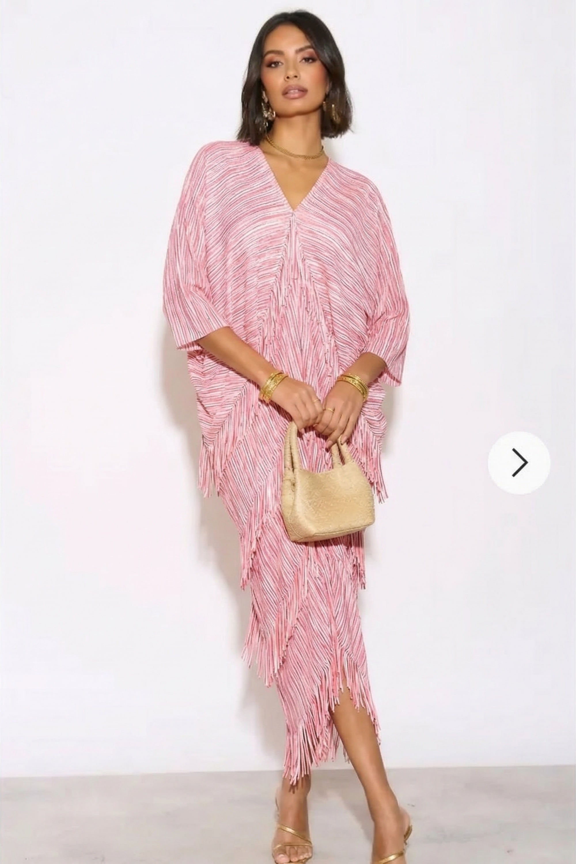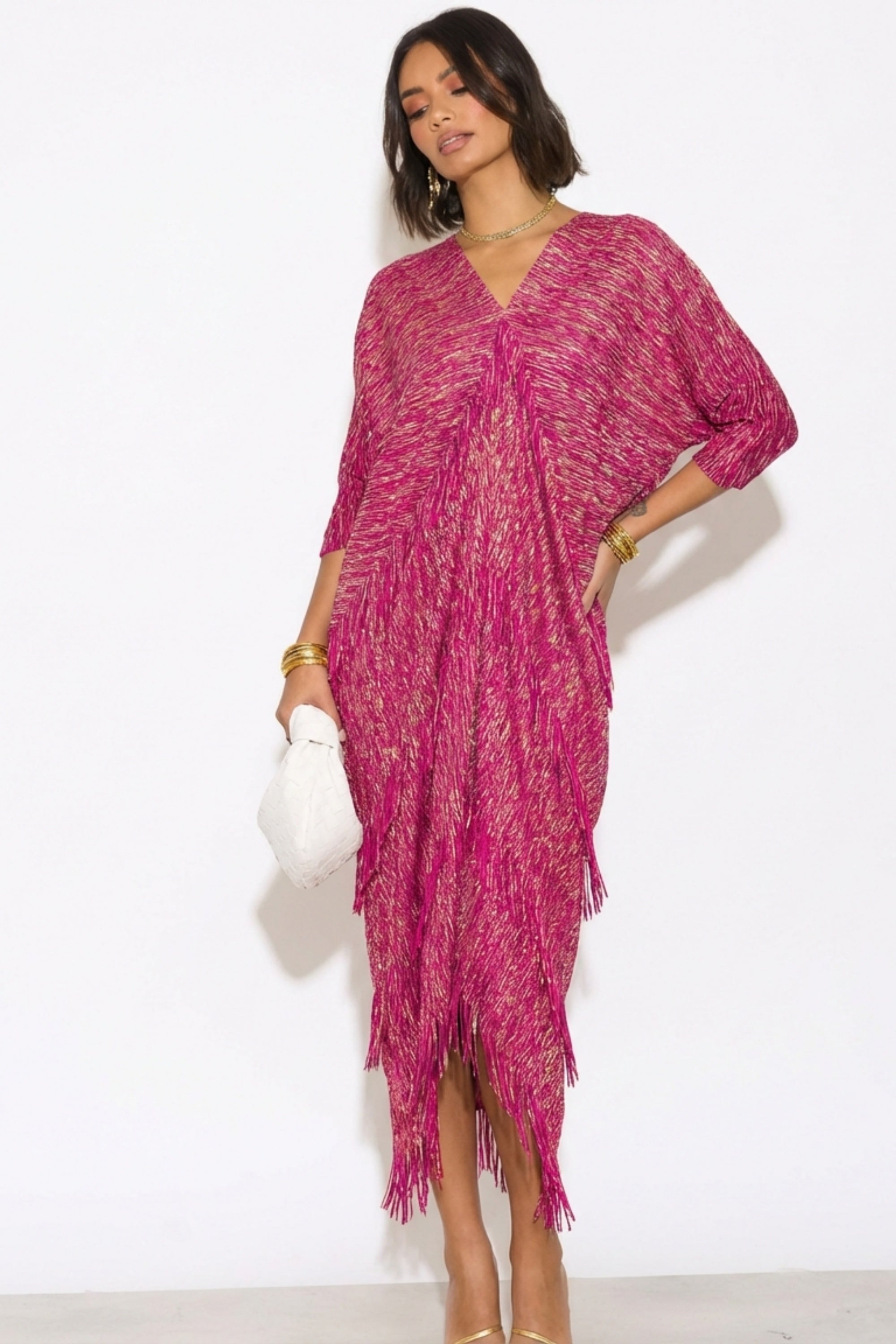 Layers Multi Fringed Tassel Pleated Midi Dress in Pink