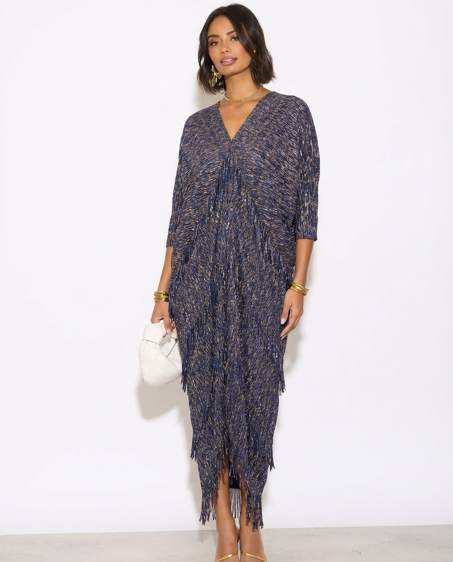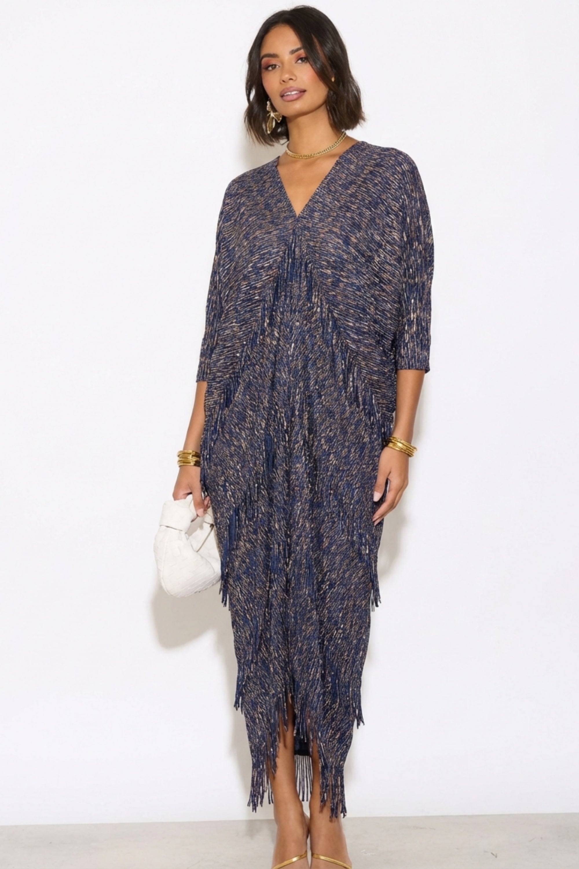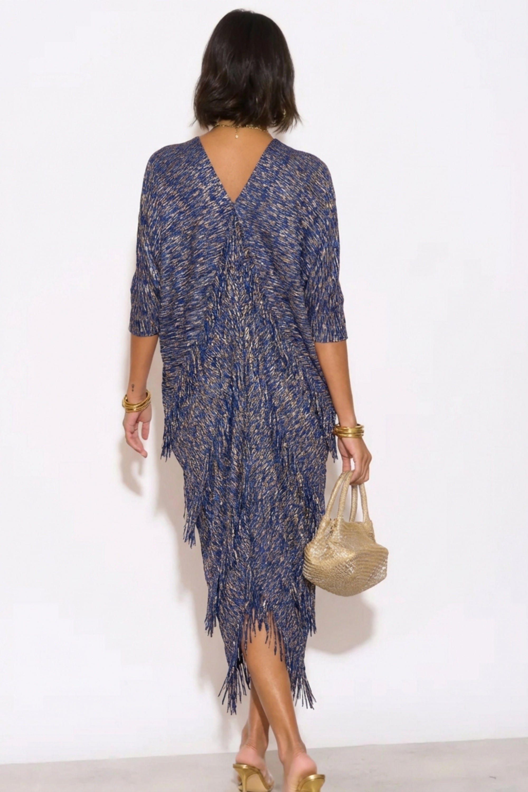 Layers Multi Fringed Tassel Pleated Midi Dress in Blue