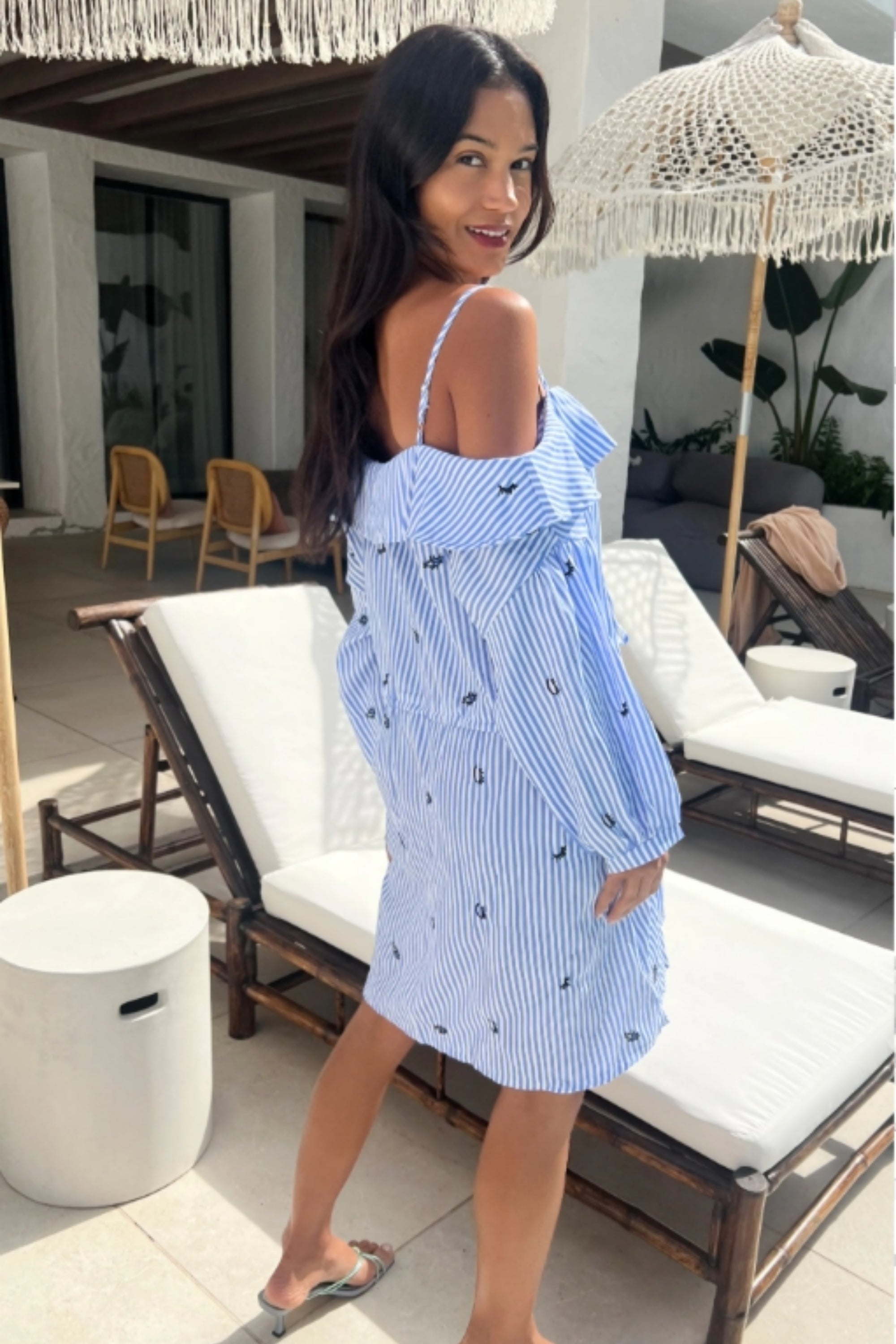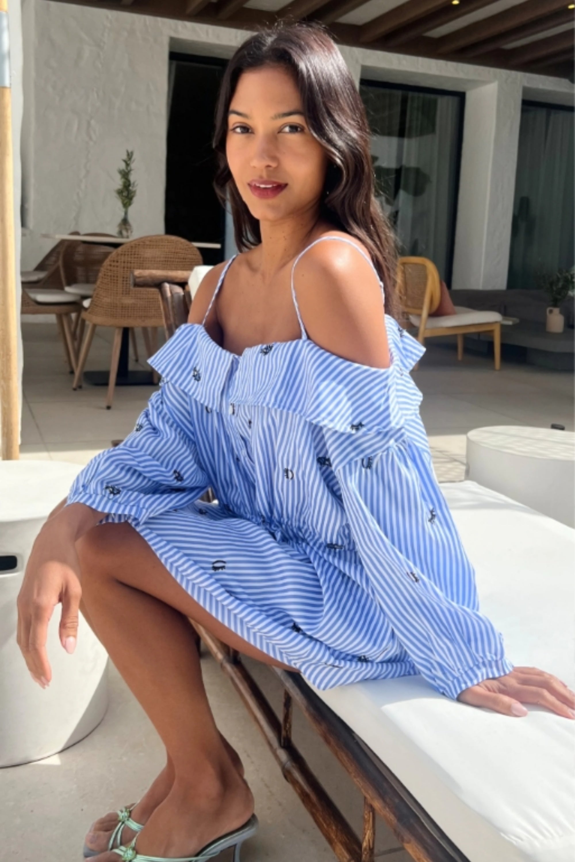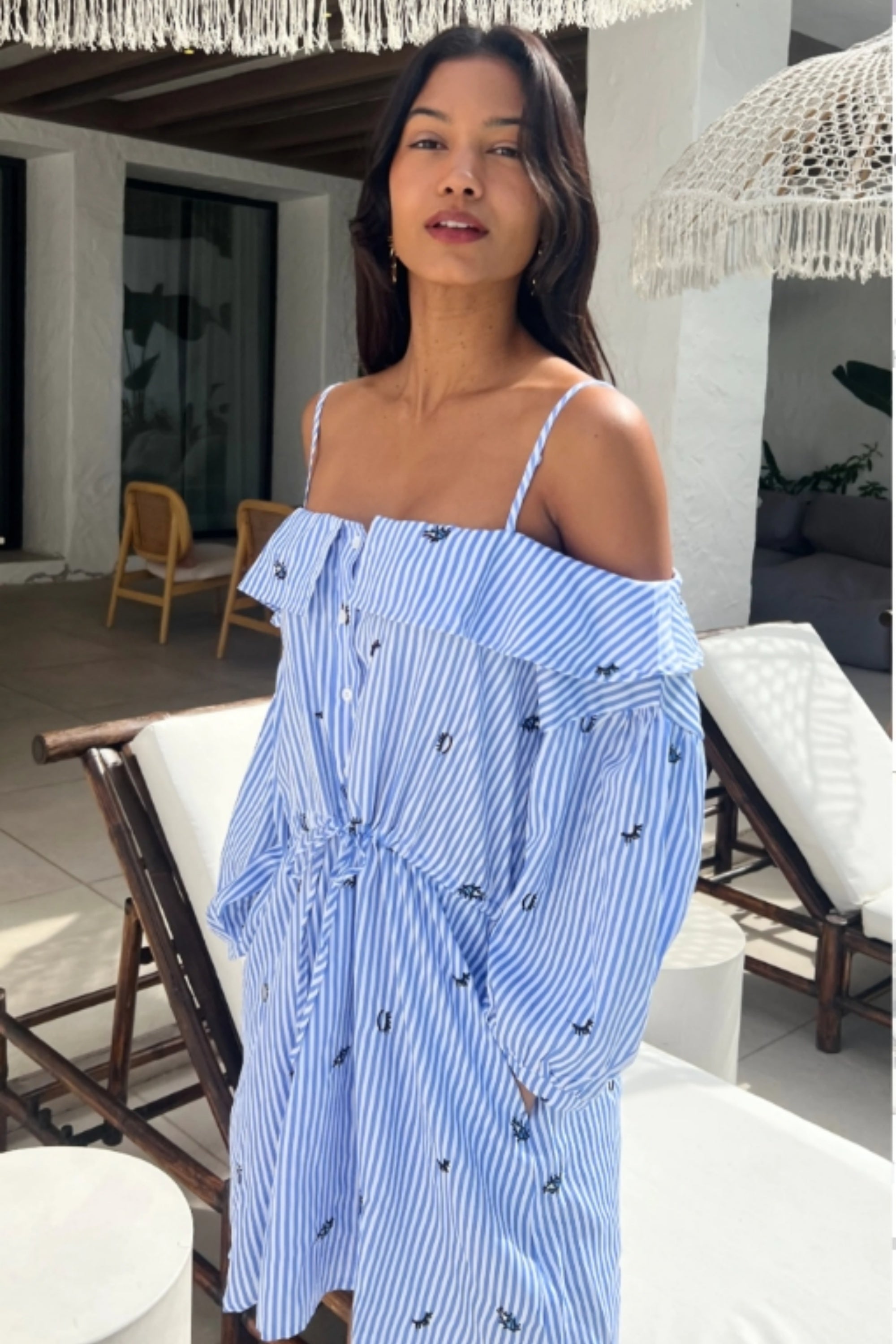 Eyelash Embroidery Blue Stripe Cold Shoulder Dress (Light Blue )