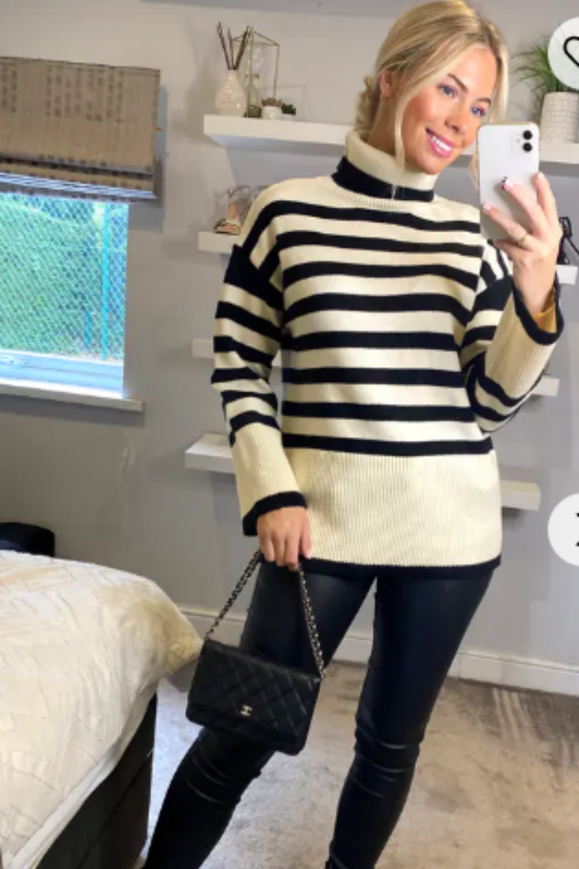 Soft Knit Striped roll-neck design cozy wool-blended jumper in black