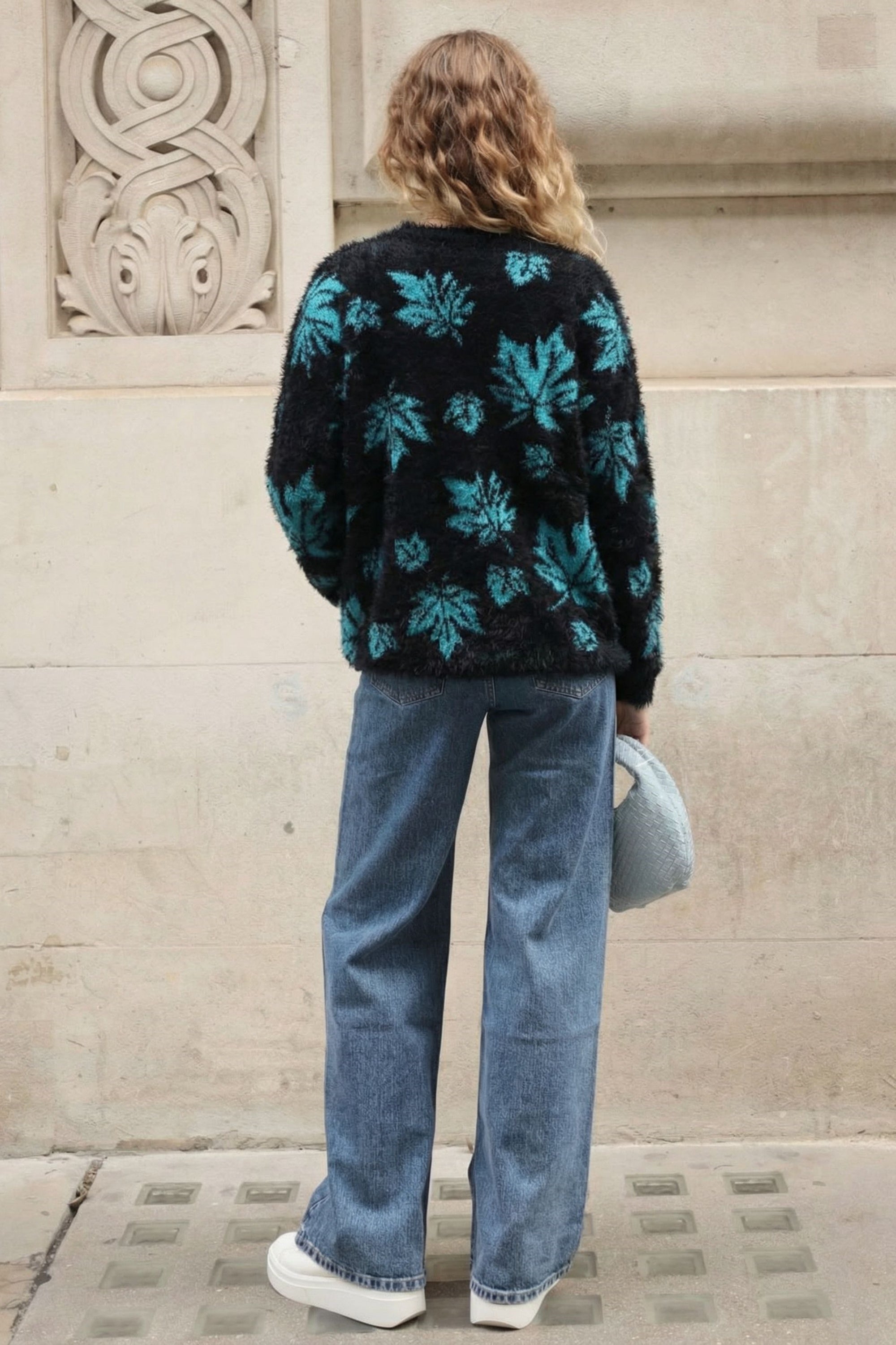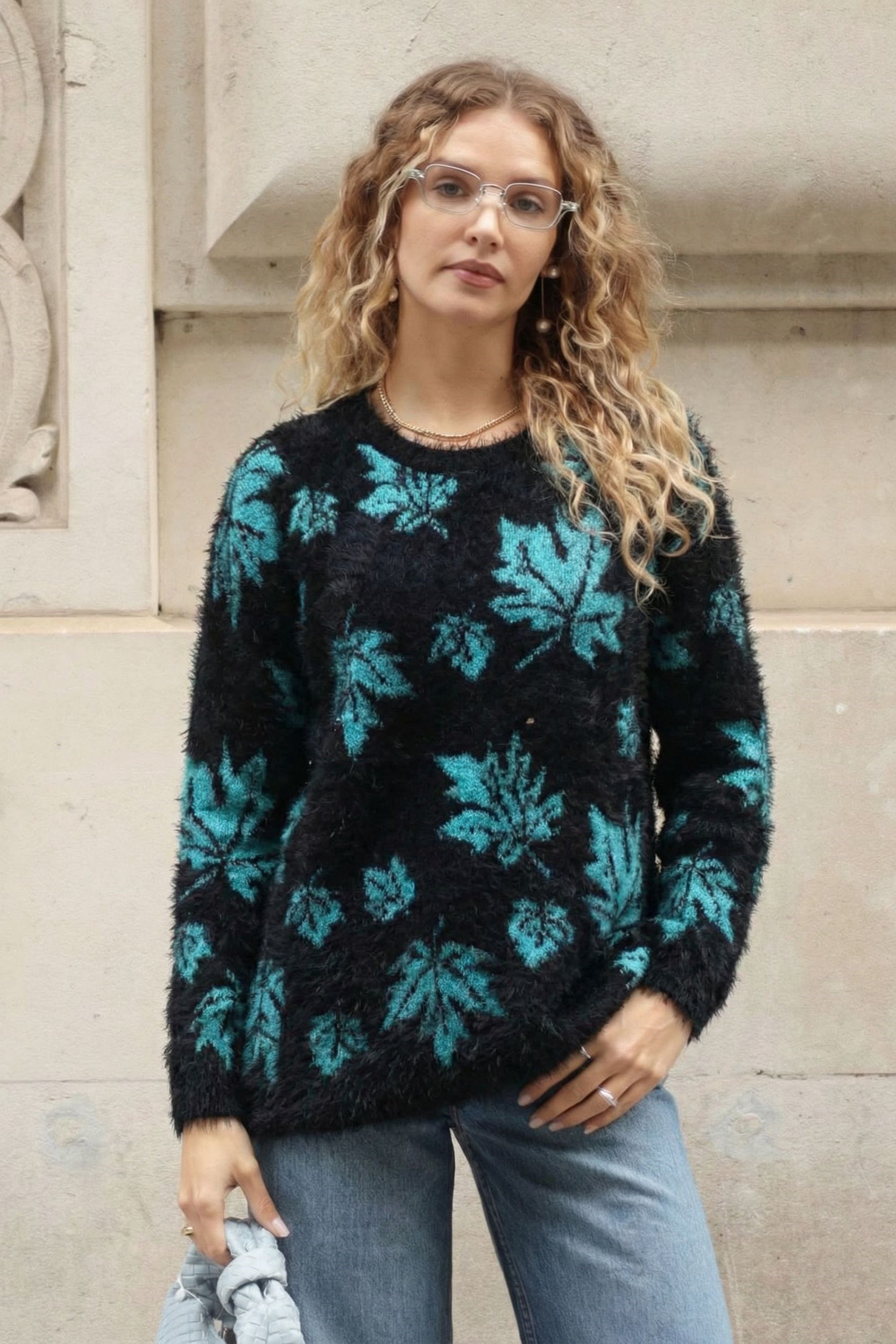 Leaves Print Neon Colour Fluffy Jumper (Blue)