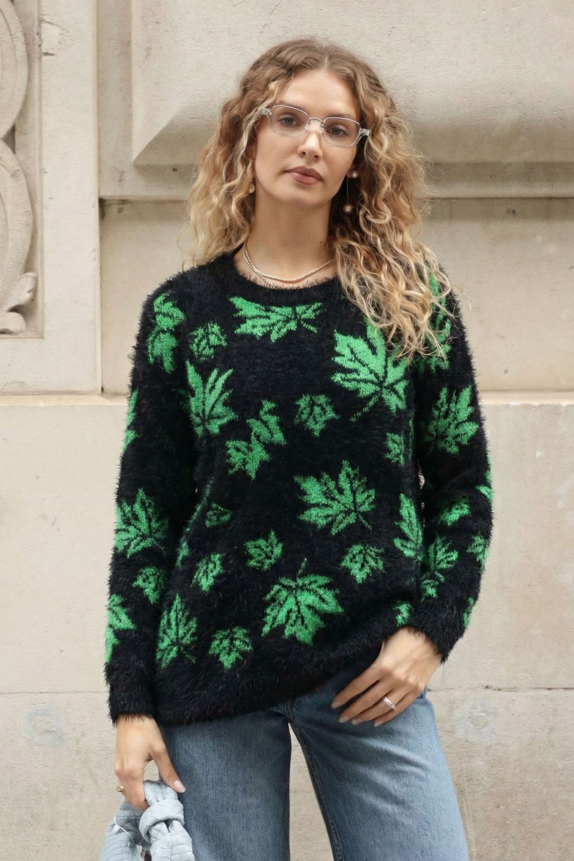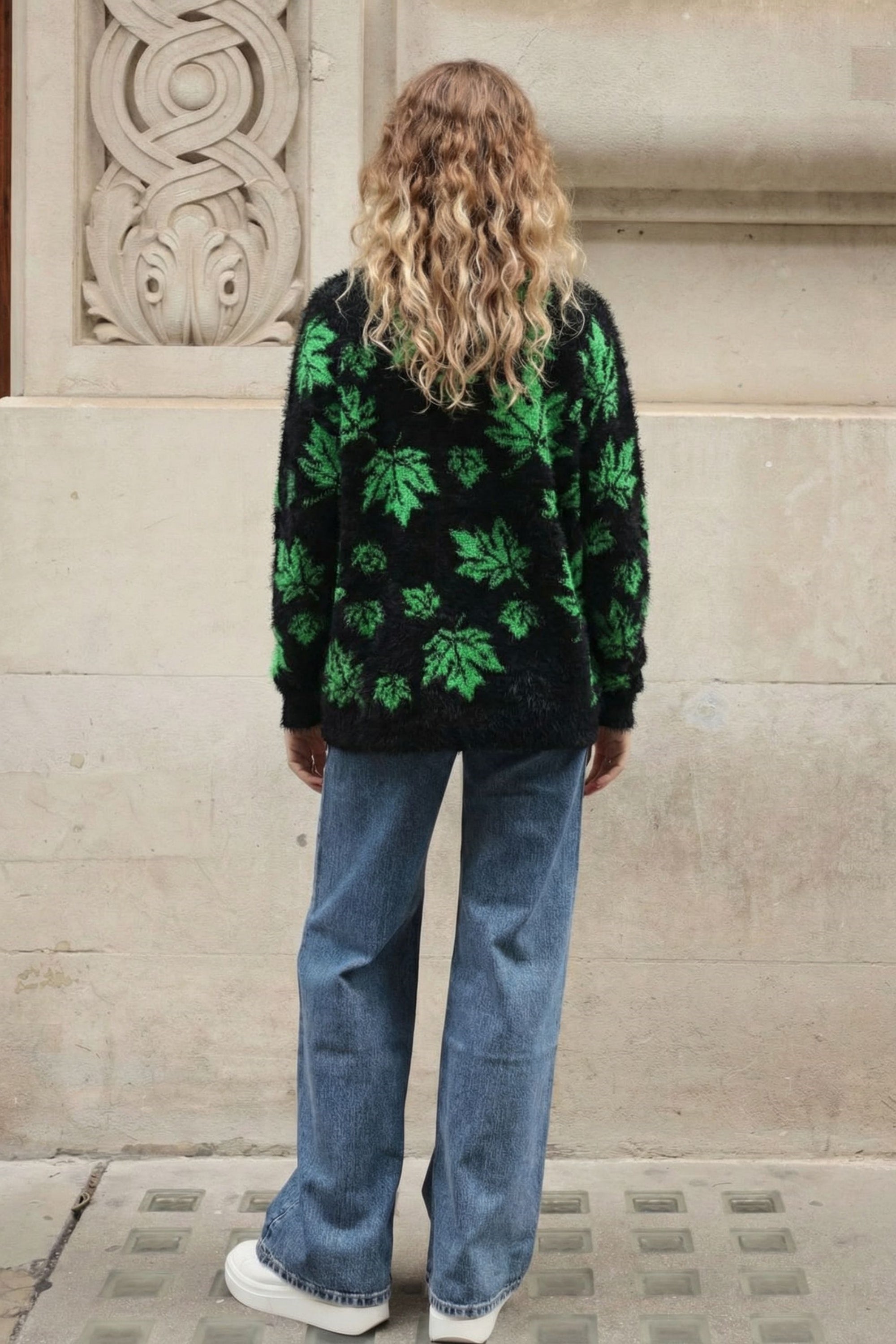 Leaves Print Neon Colour Fluffy Jumper (Green)