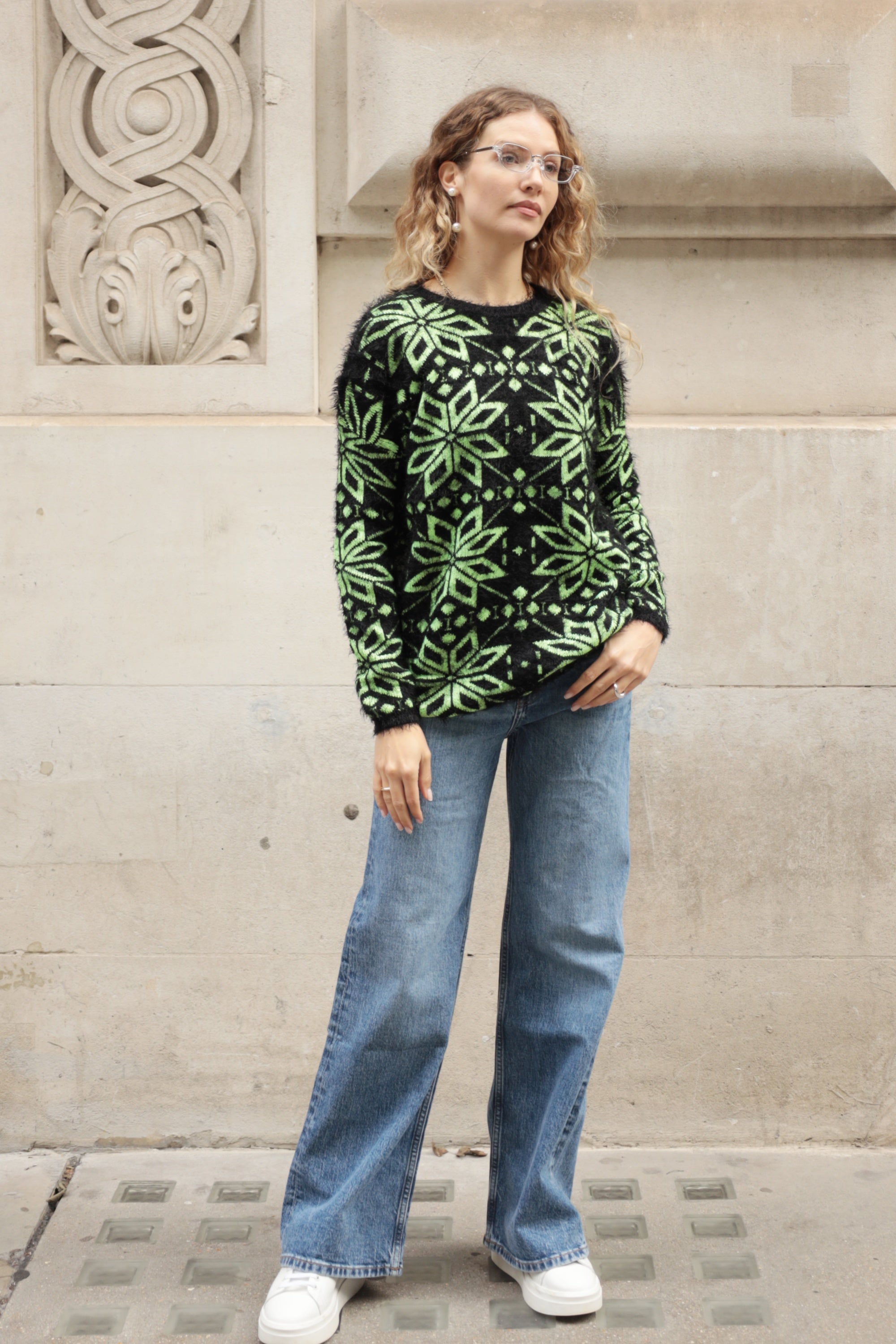 Leaves Print Neon Colour Fluffy Jumper (Green)