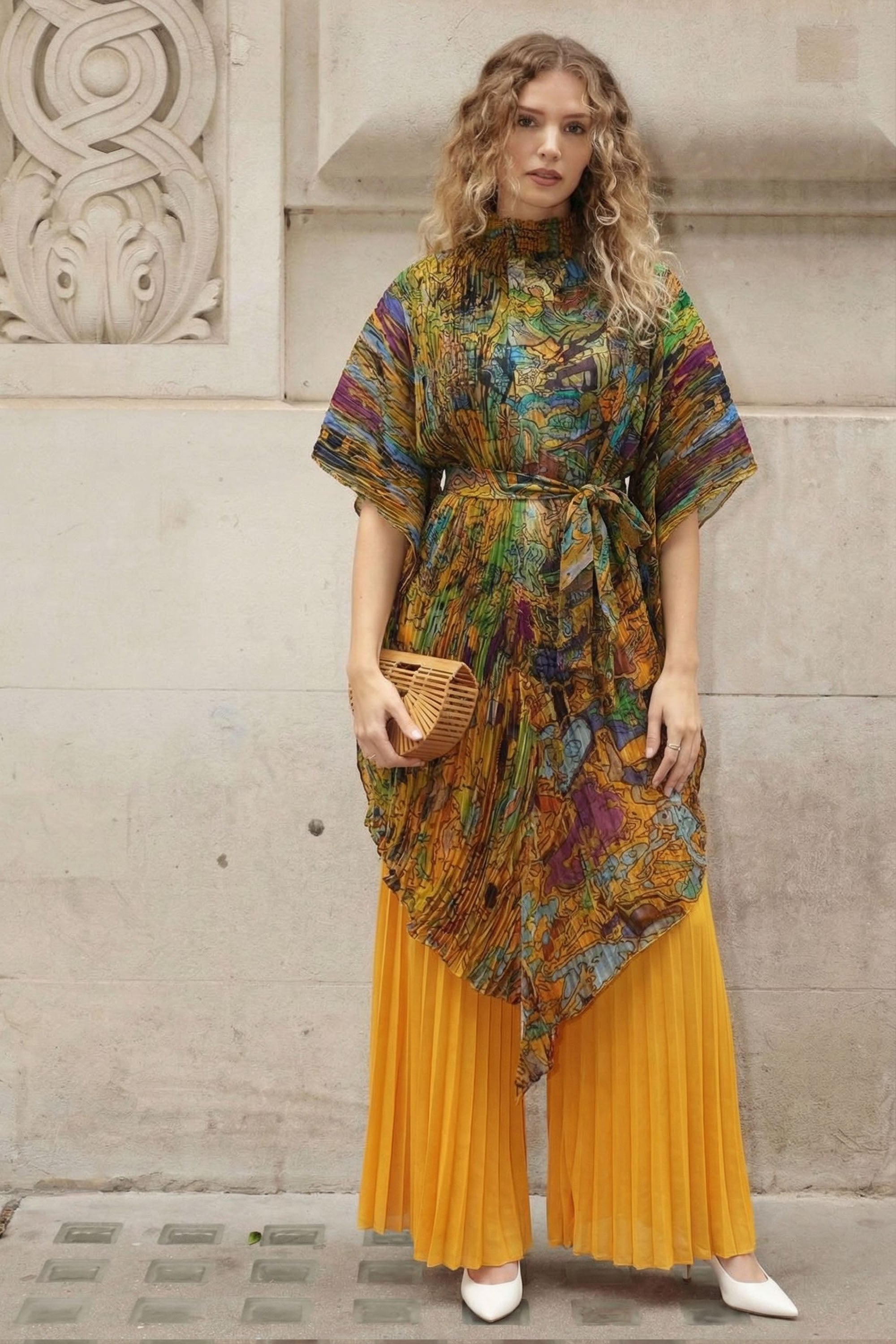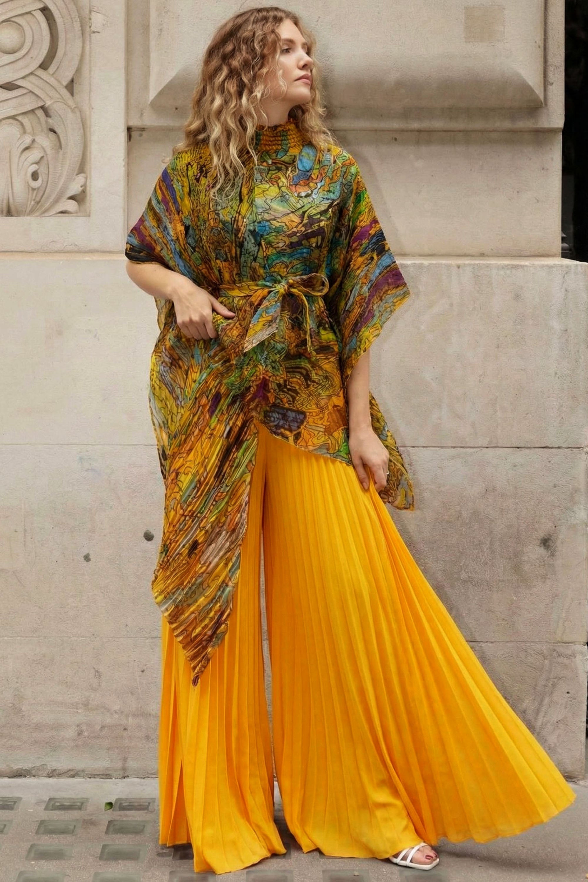 Full pleated Printed top and wide-leg trousers in Green