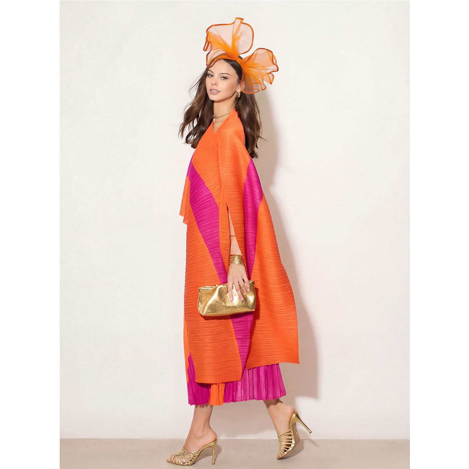 Pleated long dress with organza pleated cape sleeves in Hot Pink
