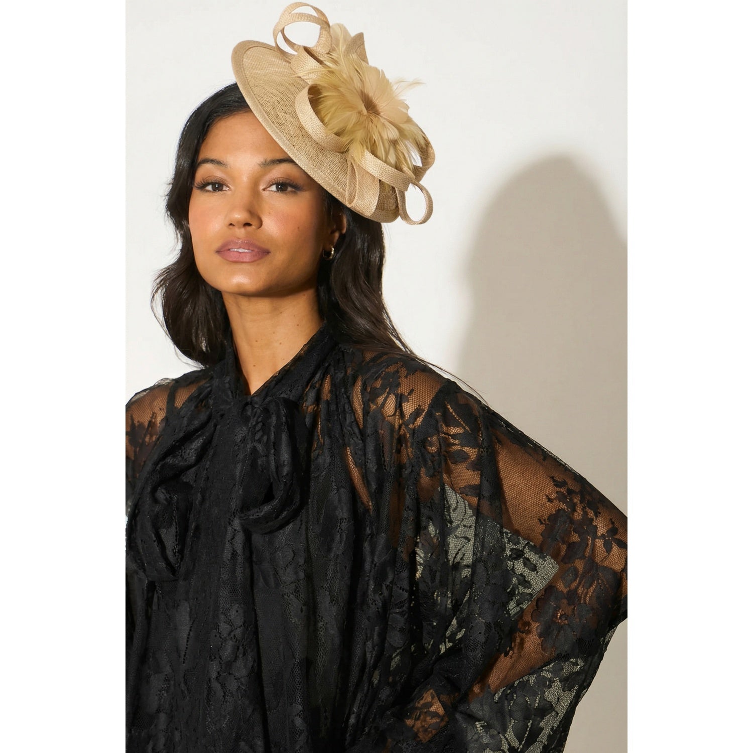 Fascinator With Feather & Sculptural Loop Detail In Beige