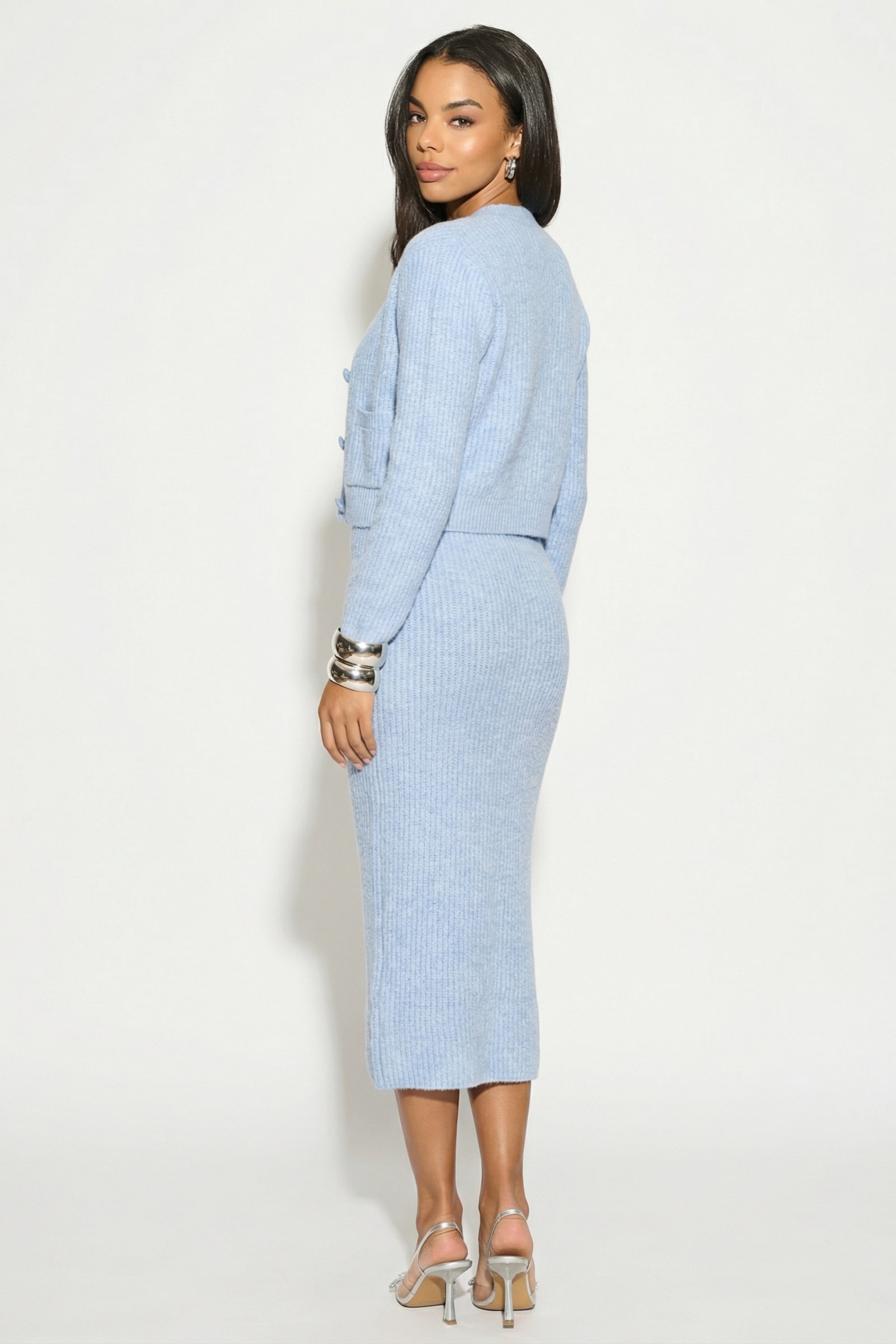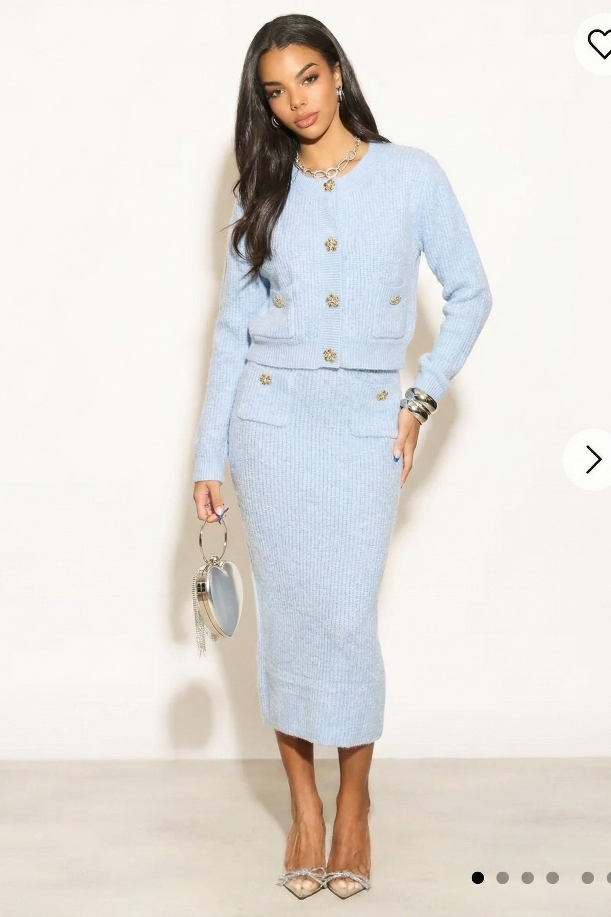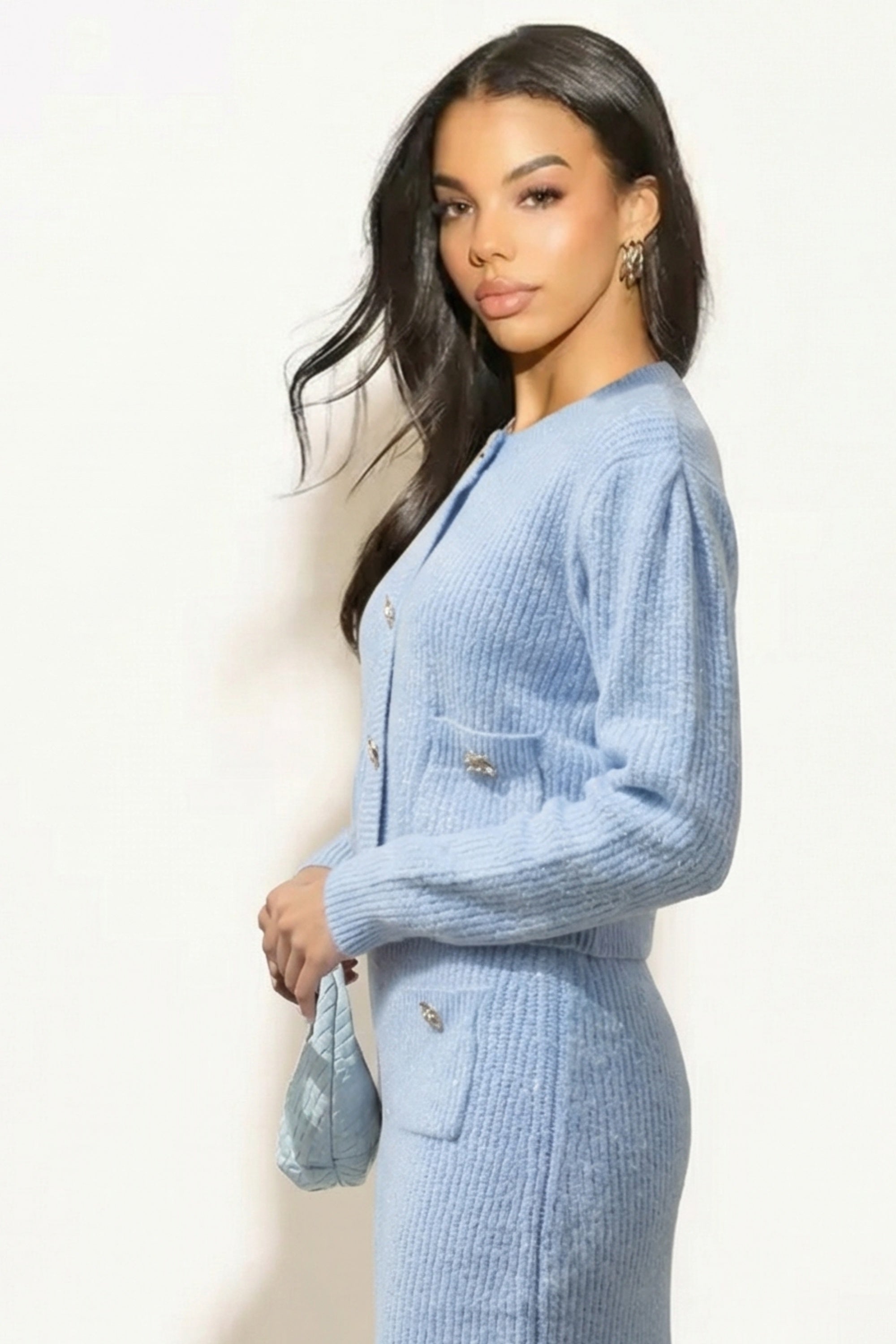Cosy Knit Co-ords set with Floral button design in pale blue