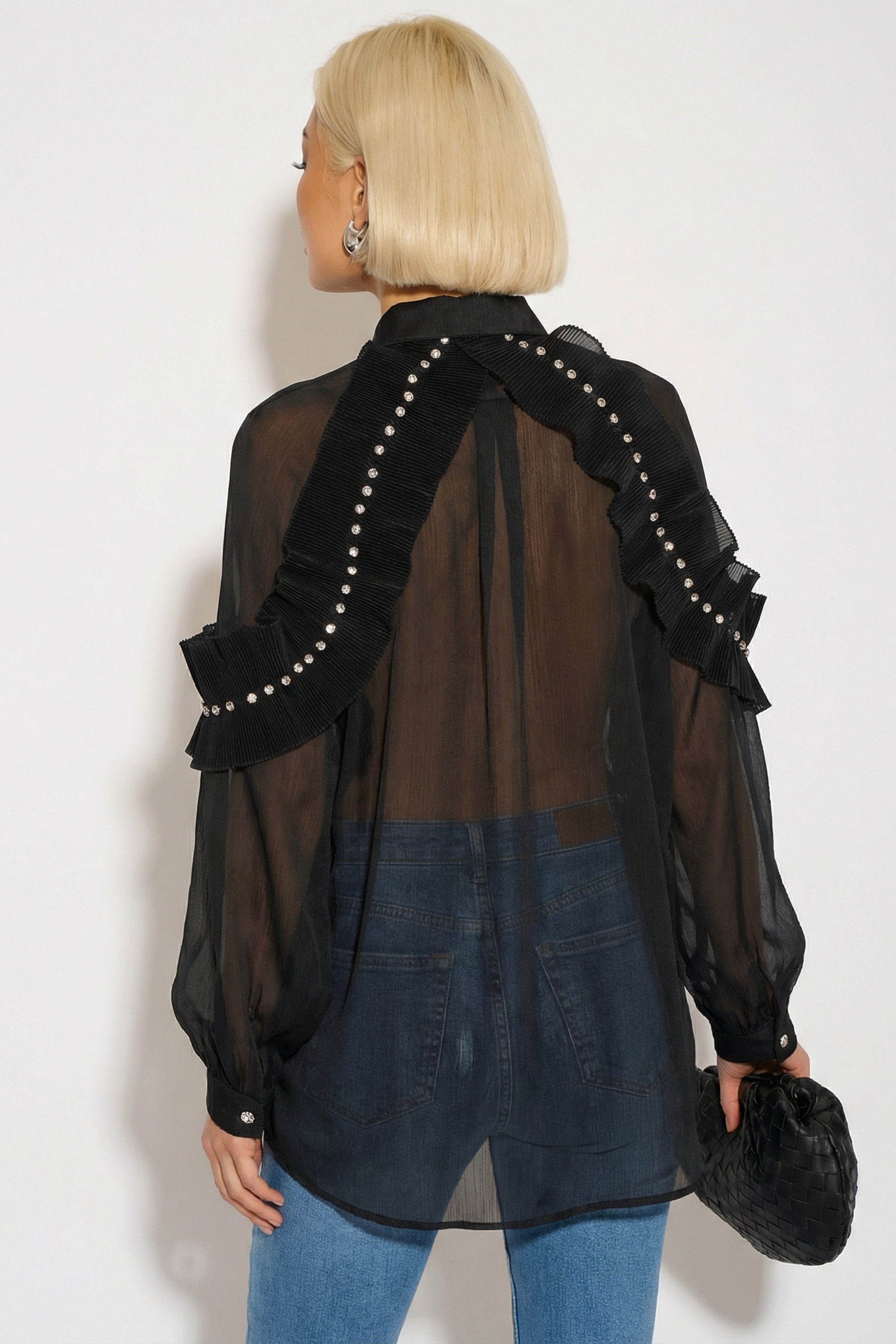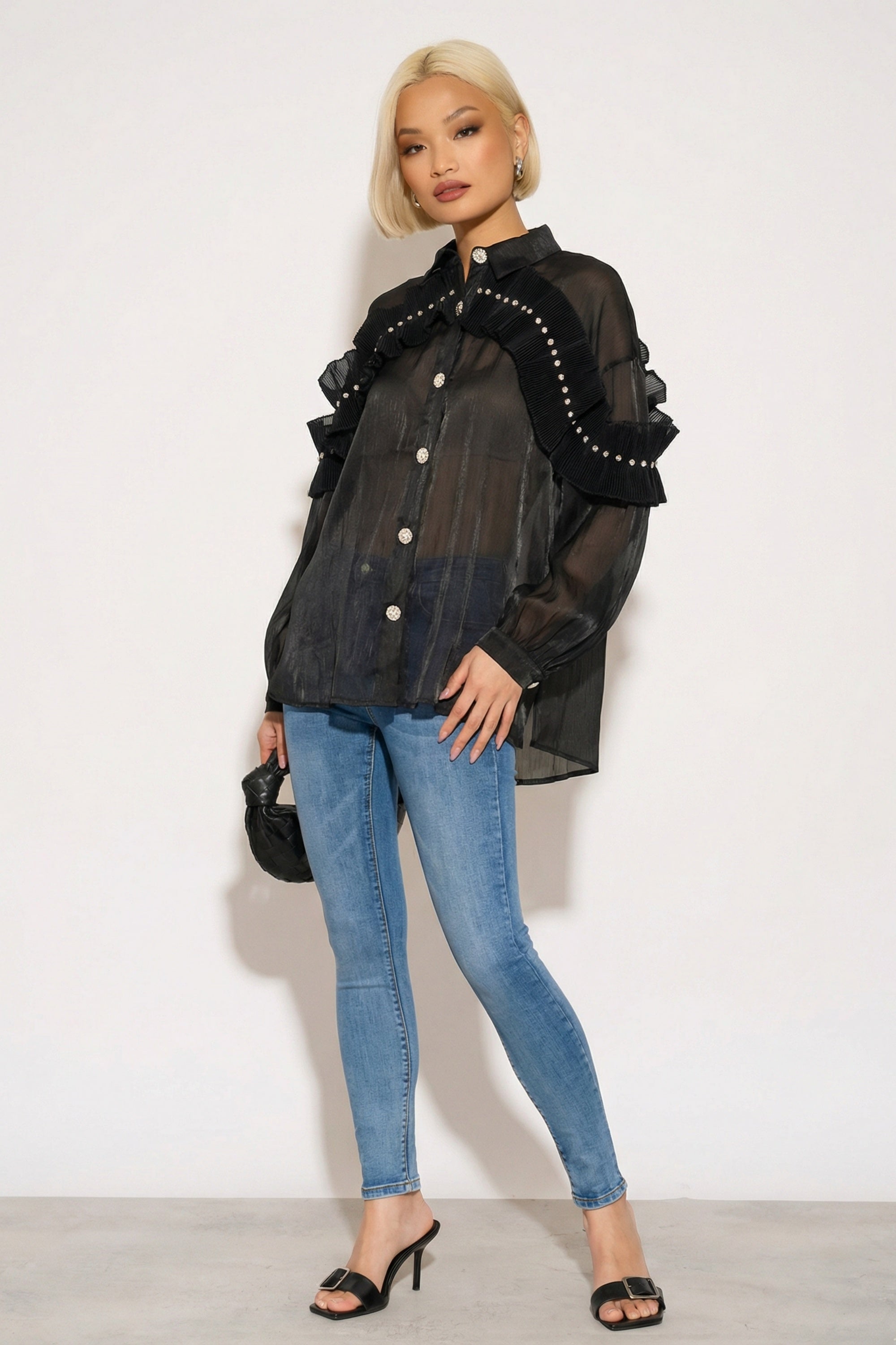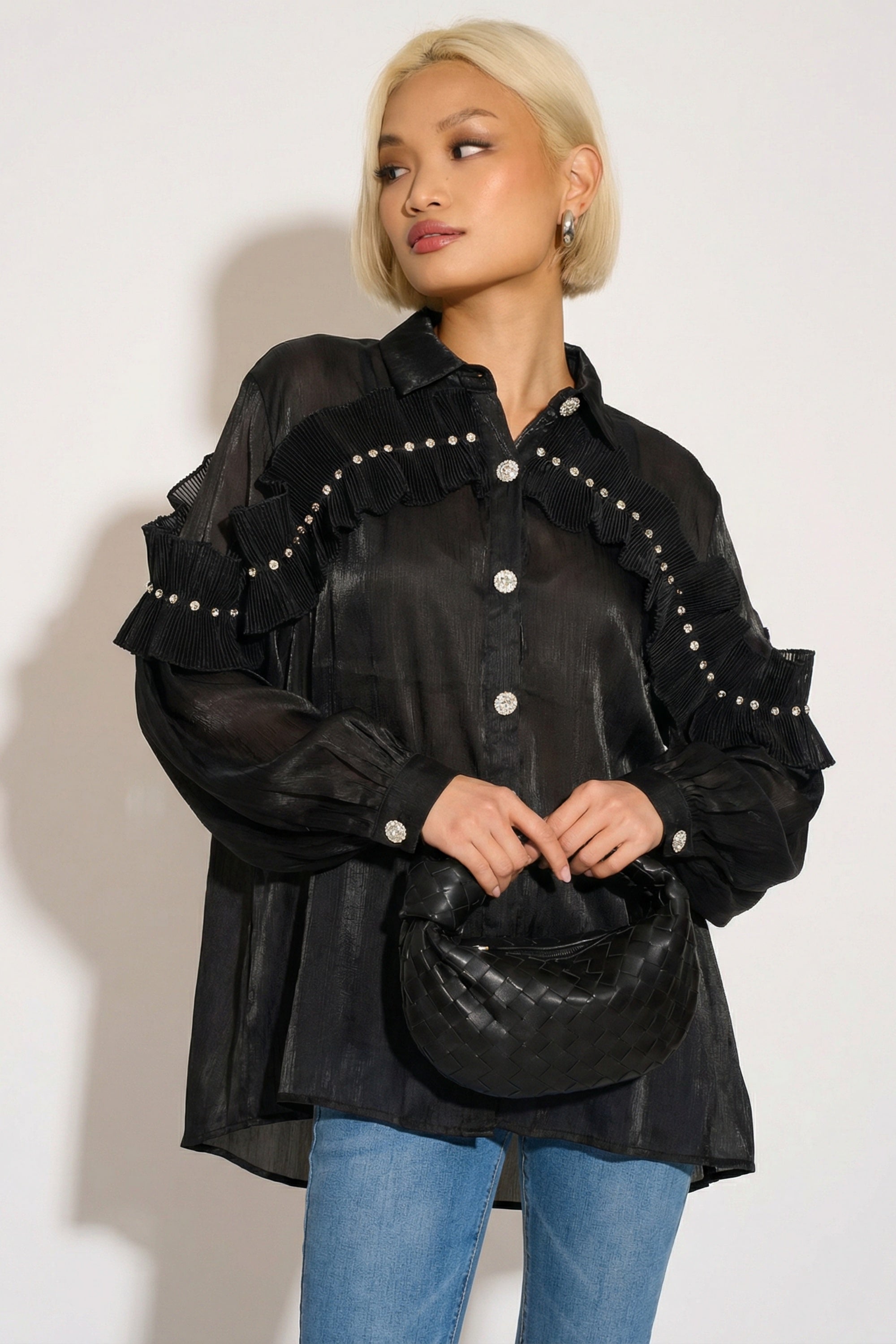 Pleated ruffles with multi dimoned stone embellished sleeves design organza shirt in black