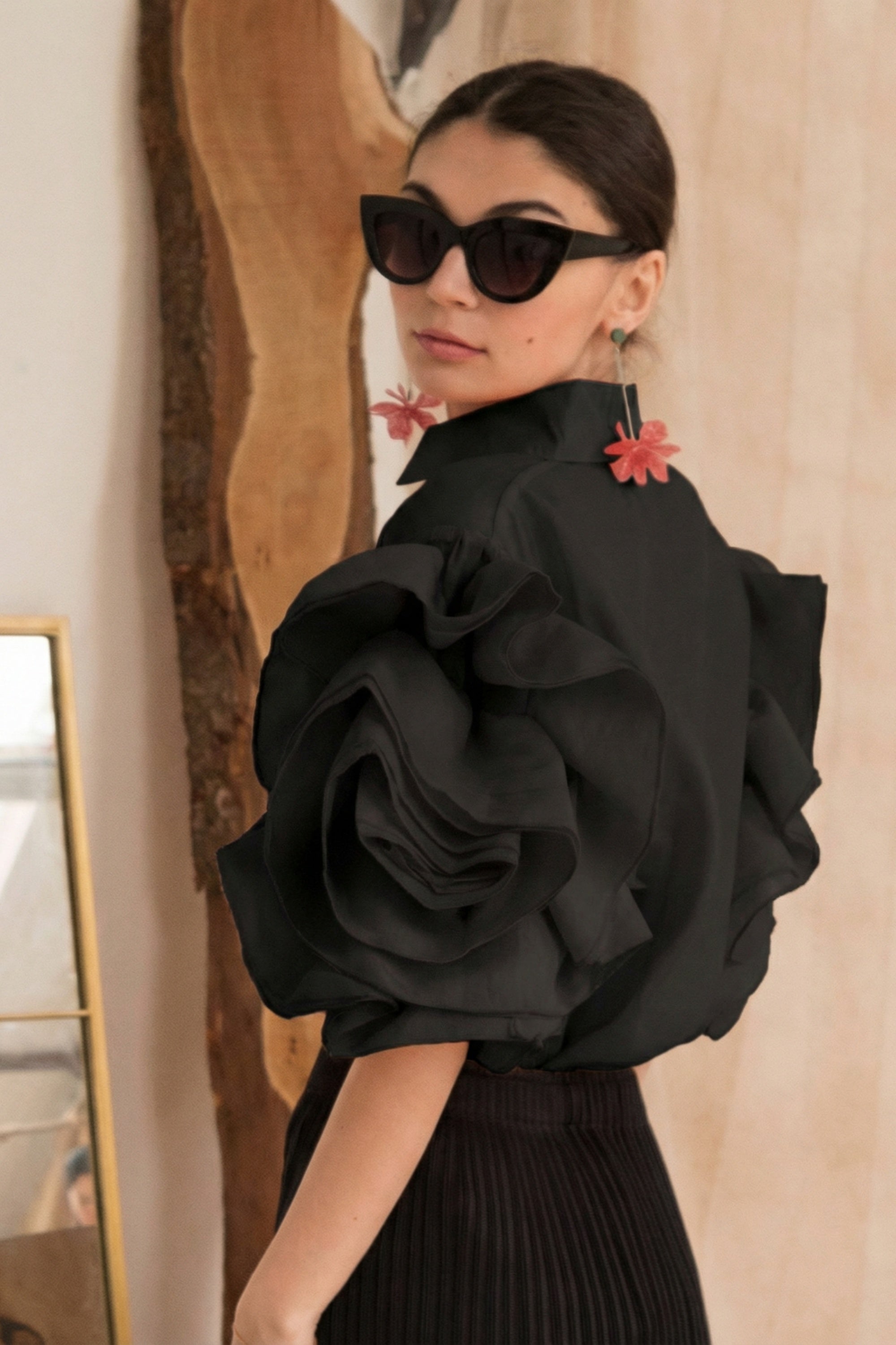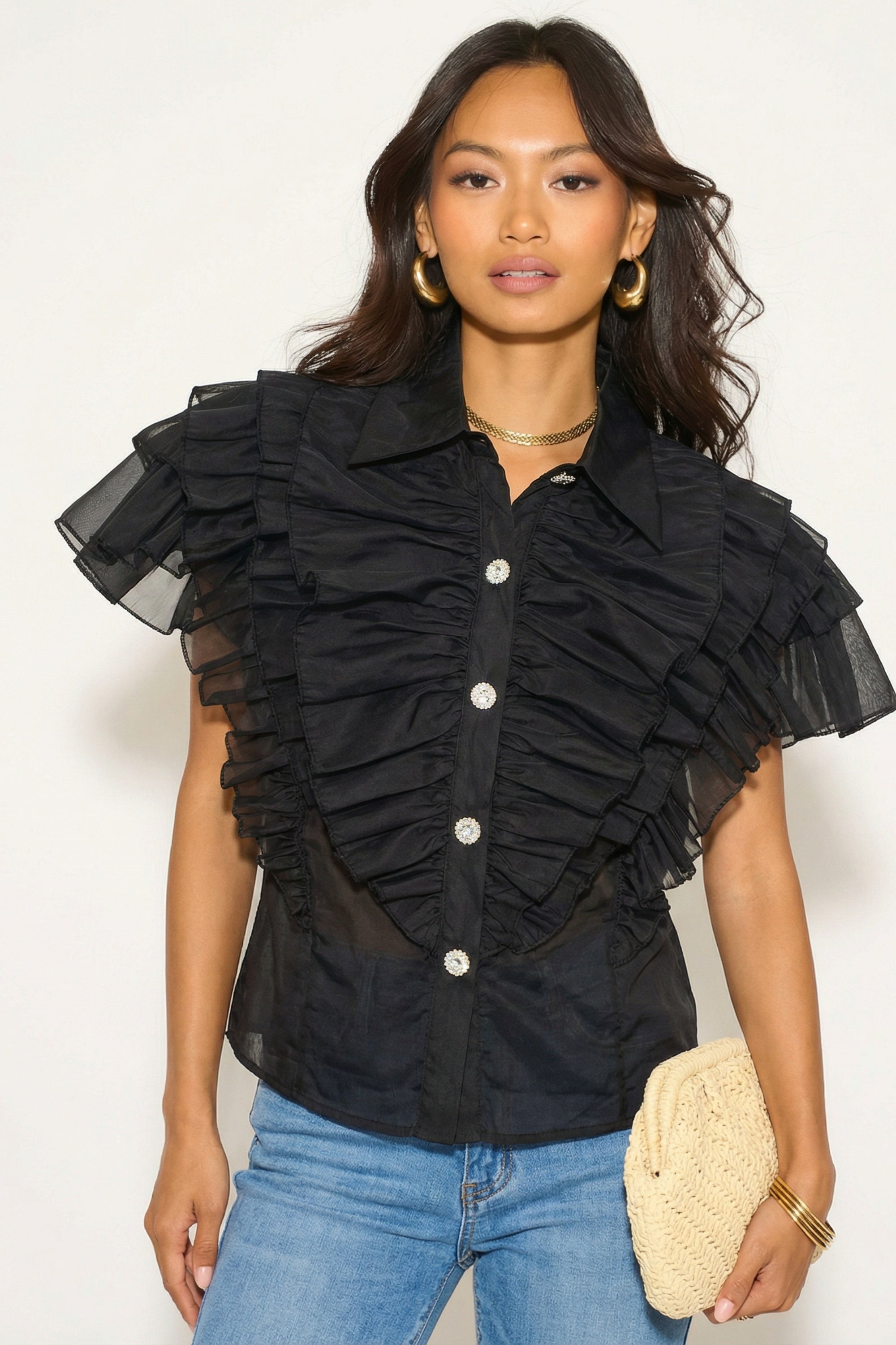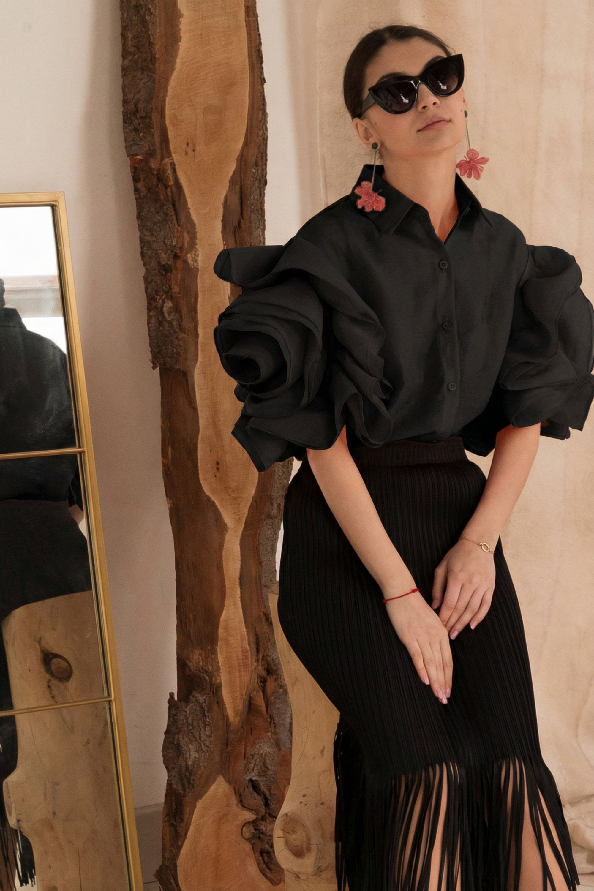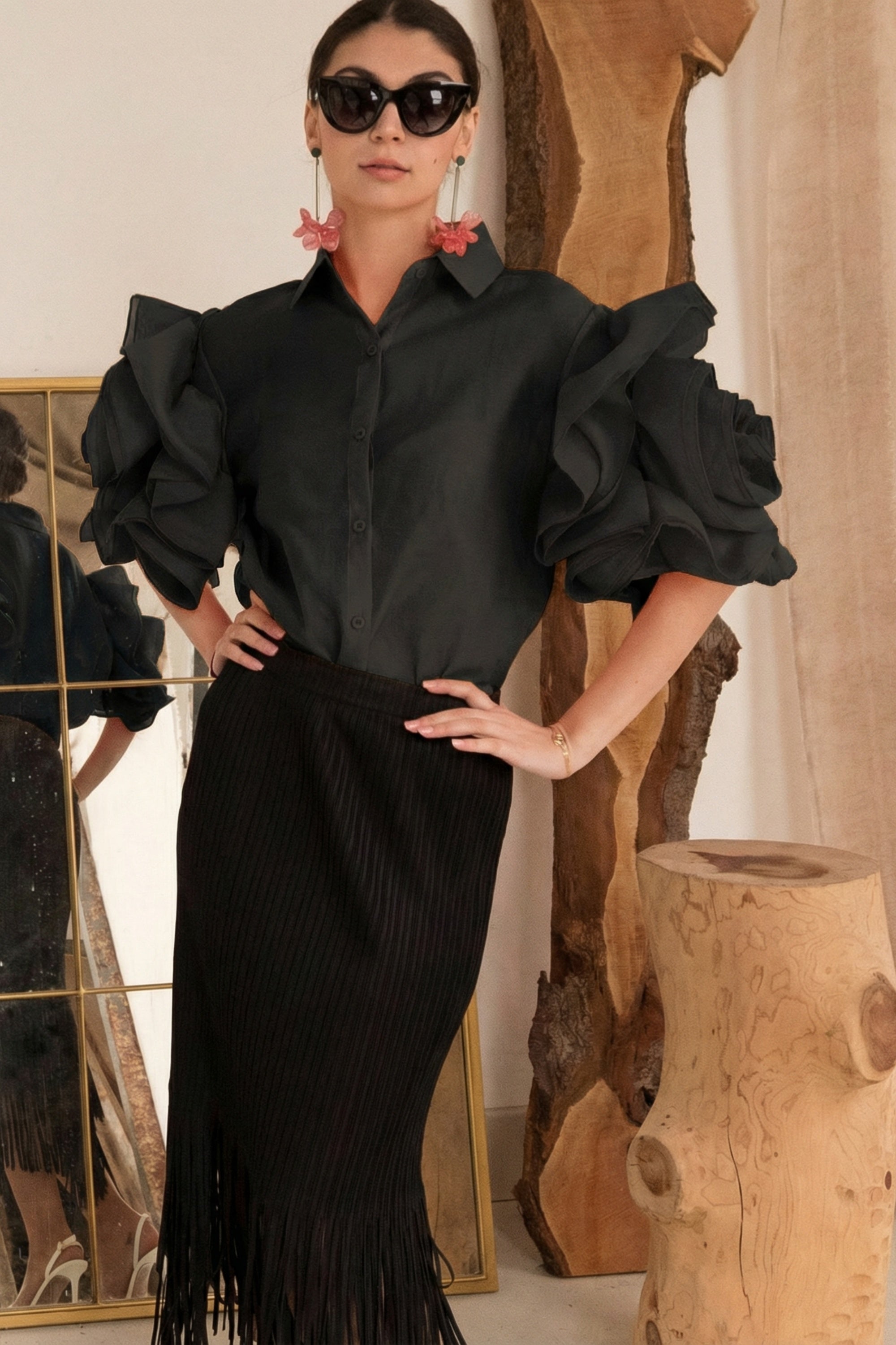 Pleated ruffles with multi dimoned stone embellished sleeves design organza shirt in black