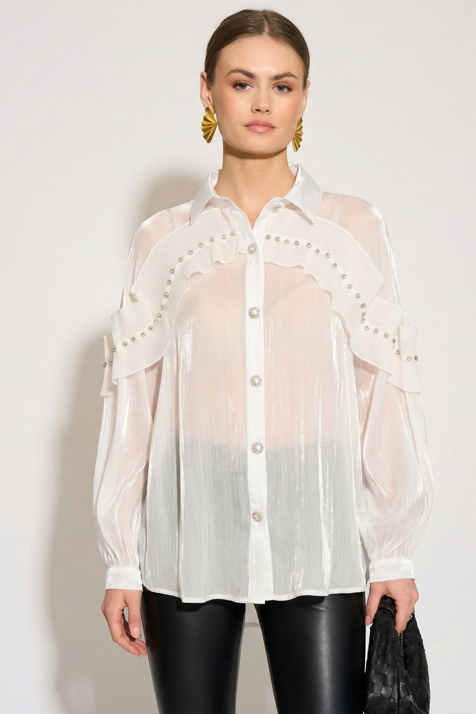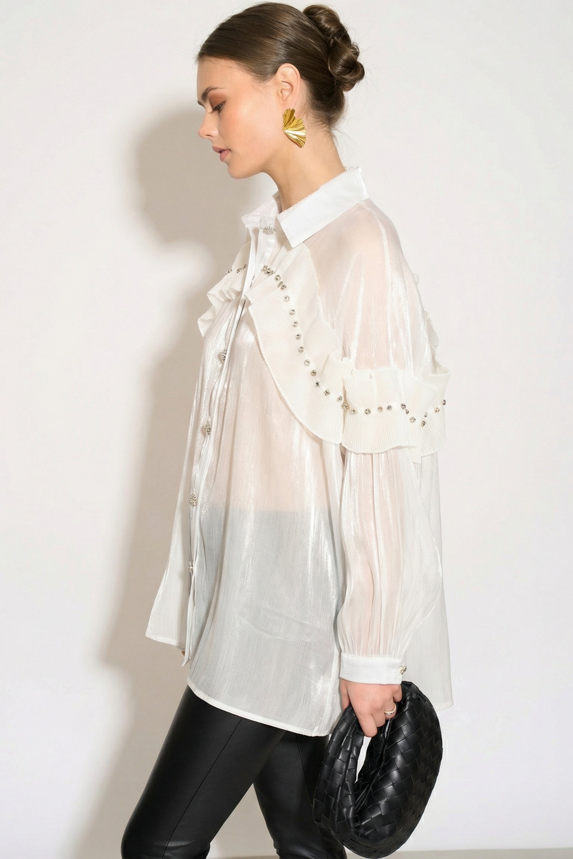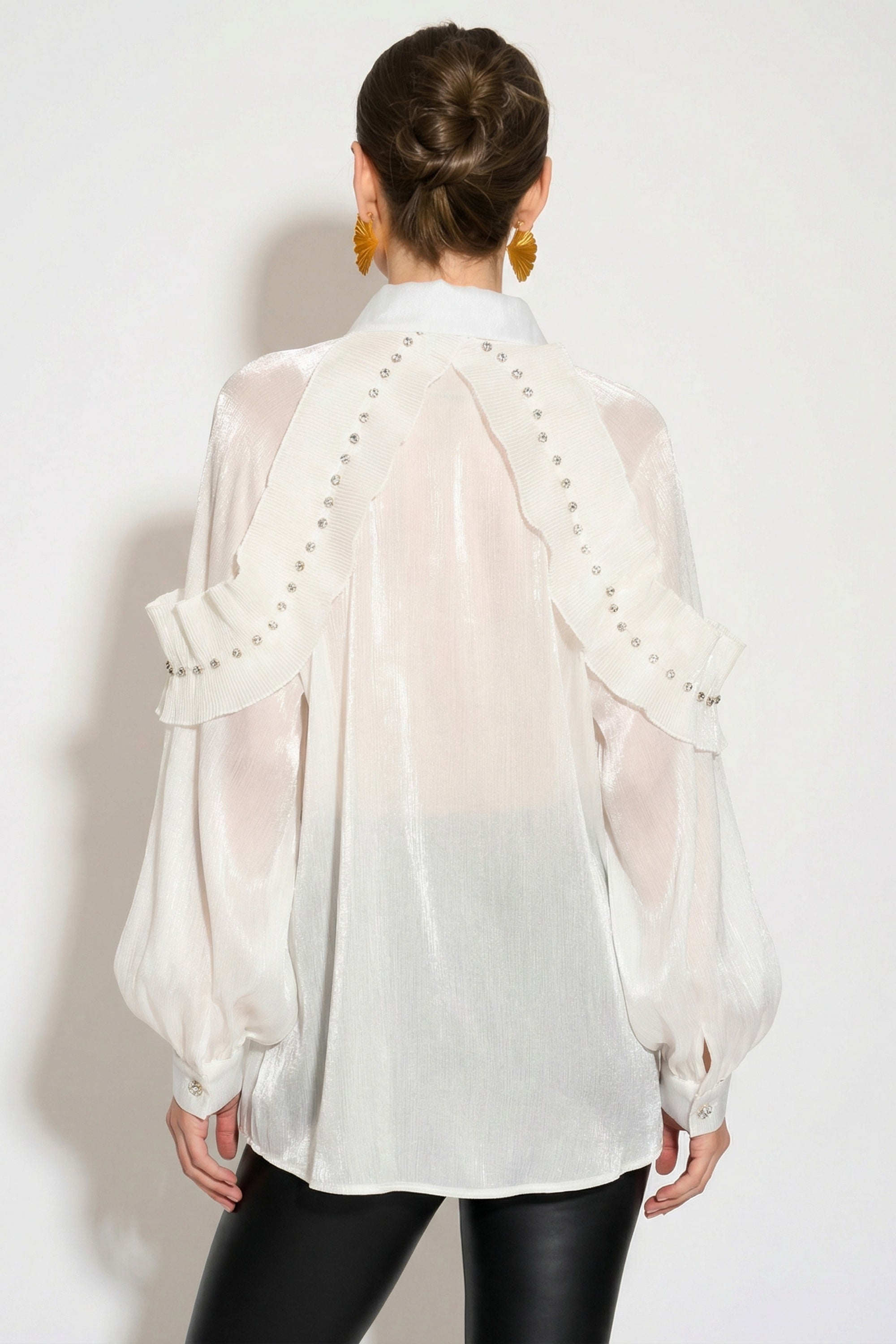 Pleated ruffles with multi dimoned stone embellished sleeves design organza shirt in white