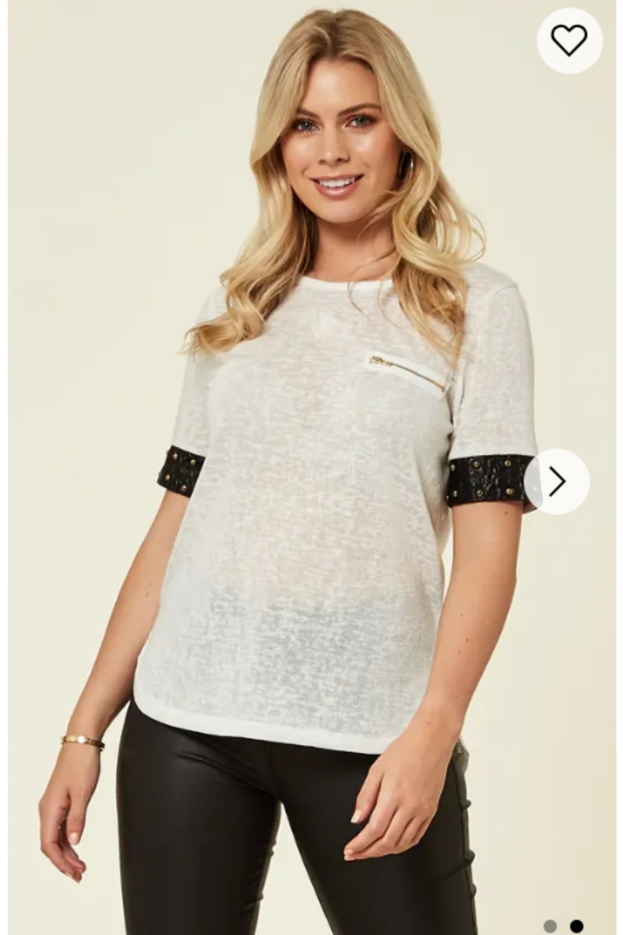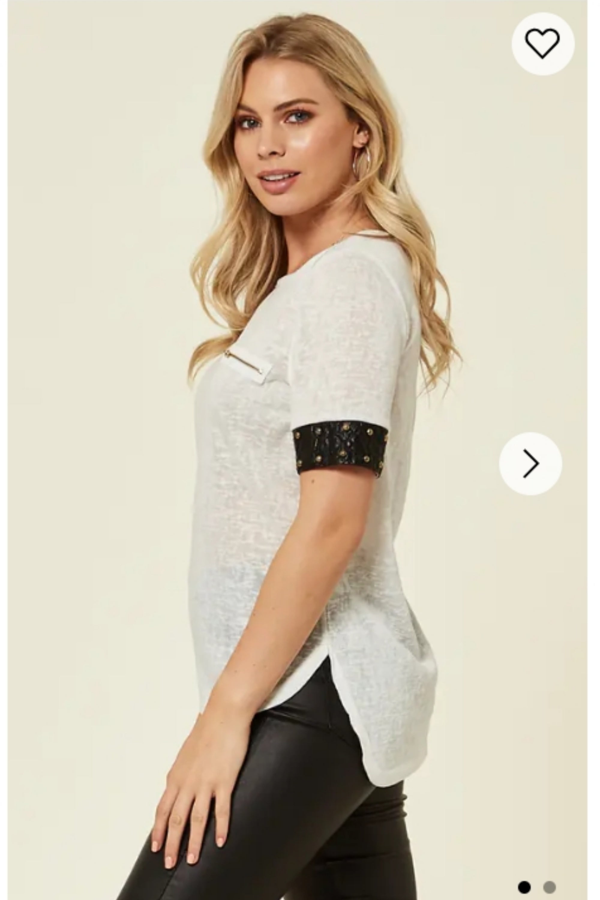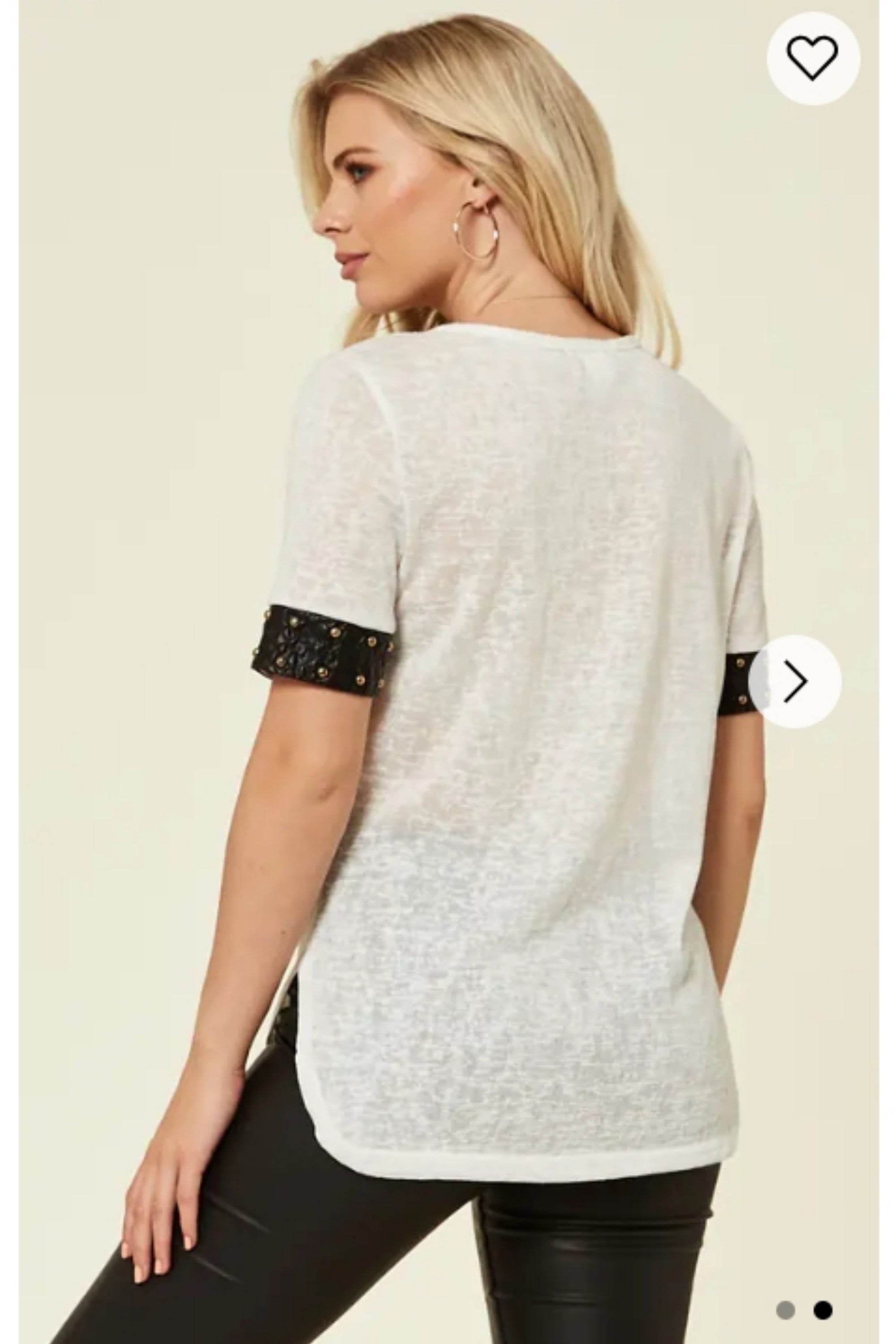 White T Shirt With Faux Leather Trim Sleeves With Stud Design