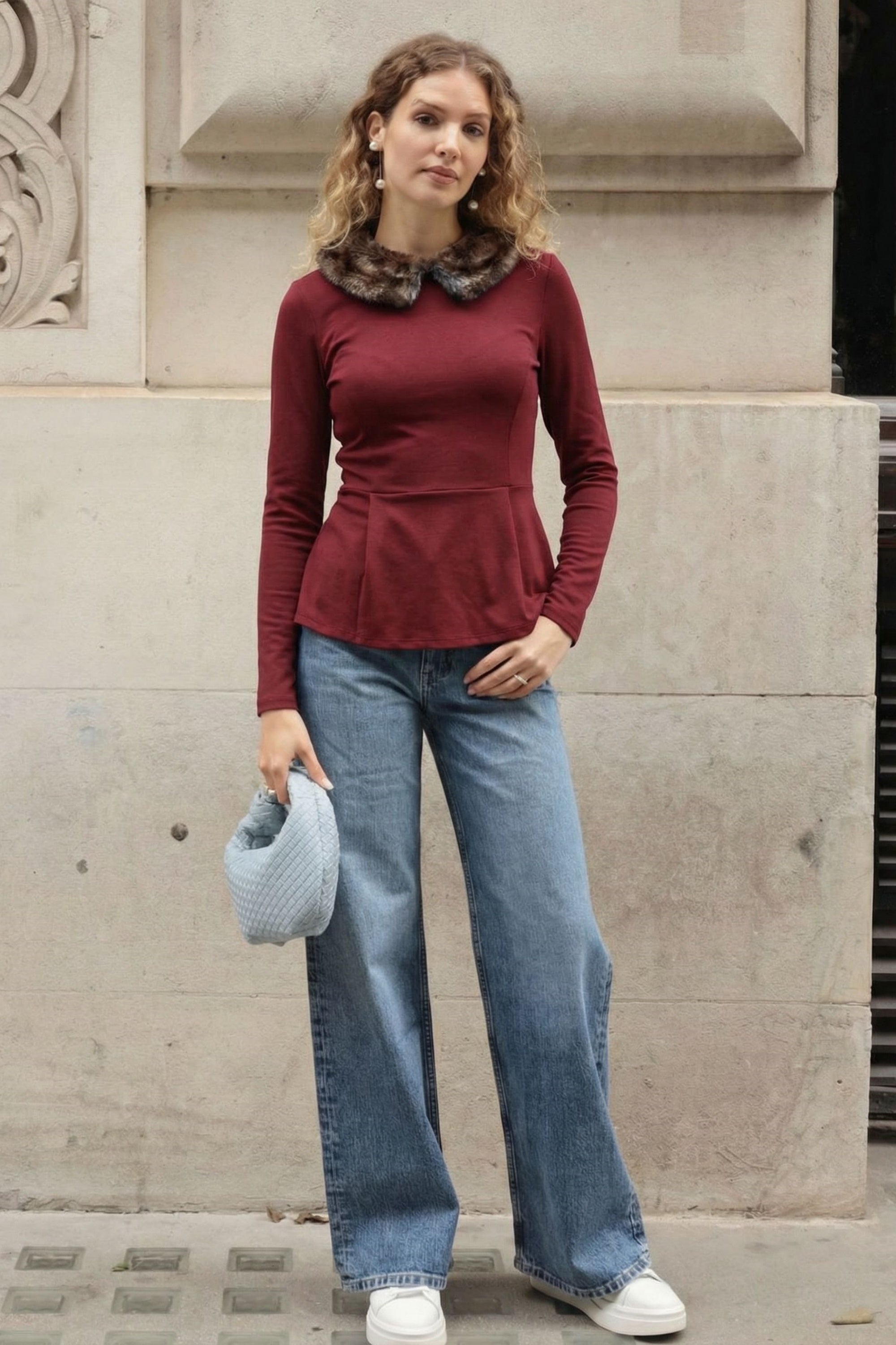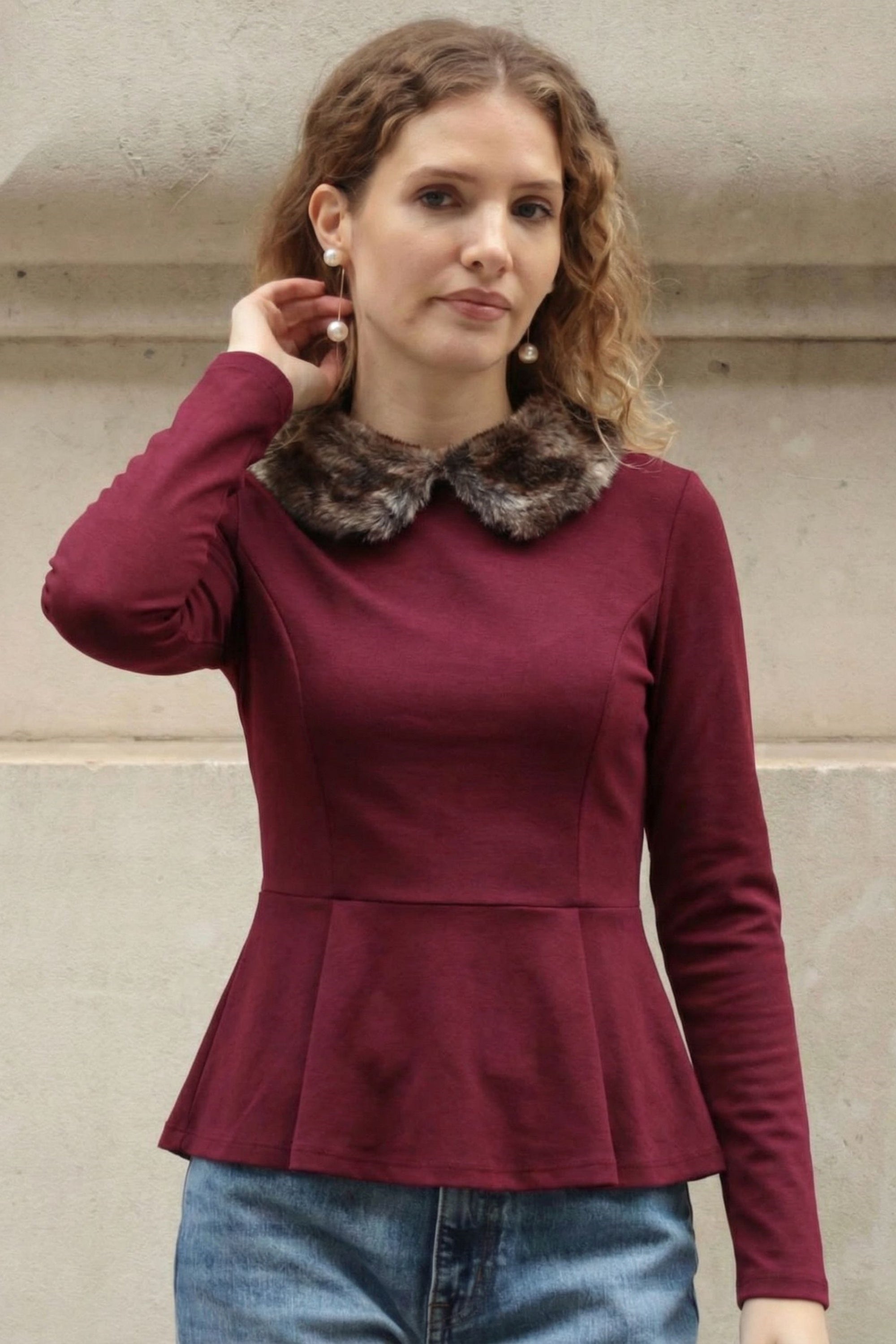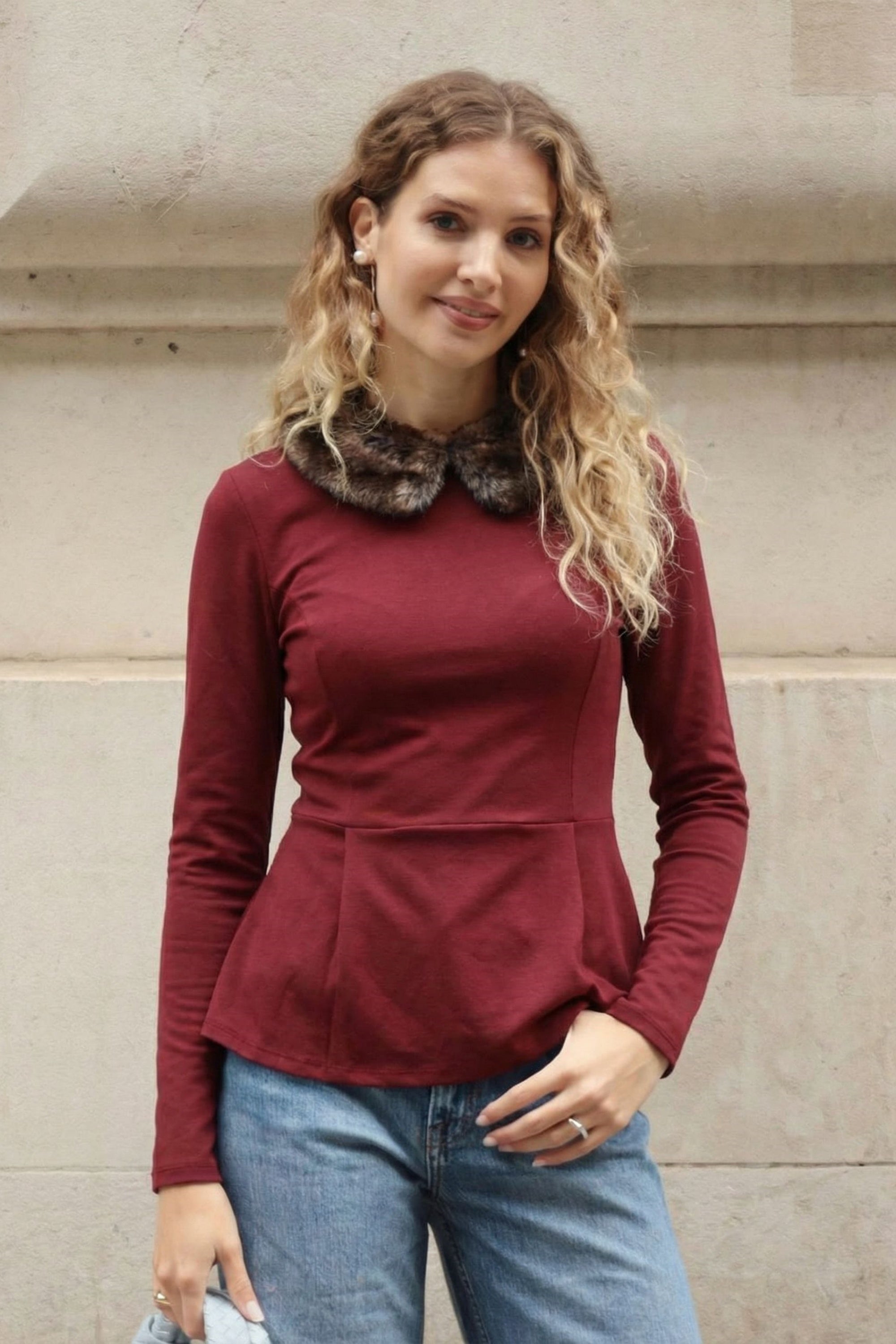 Faux Fur Collar Top (Burgundy)